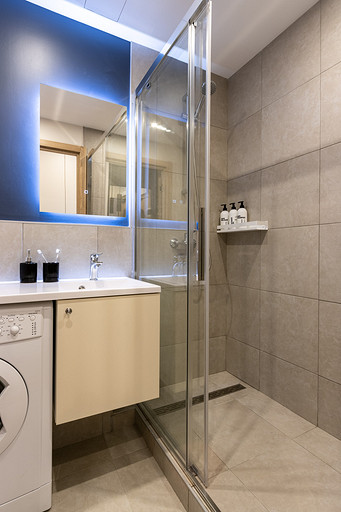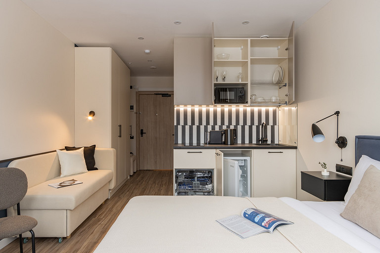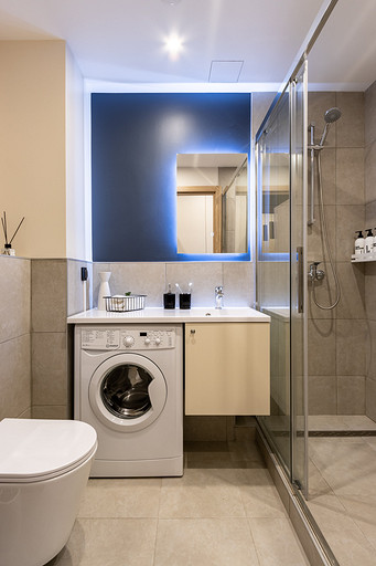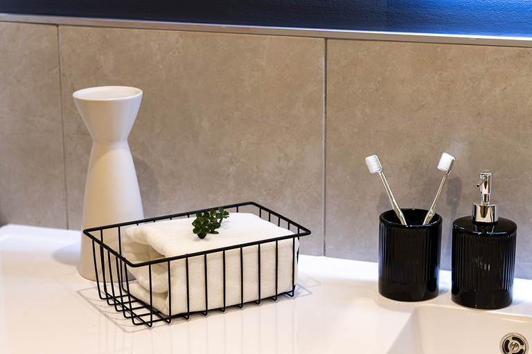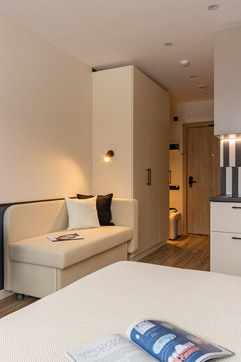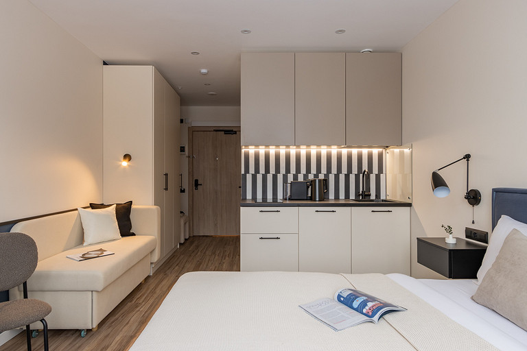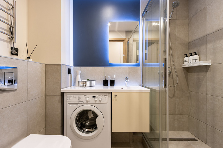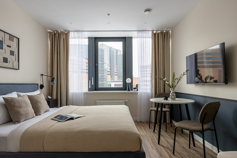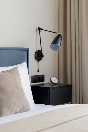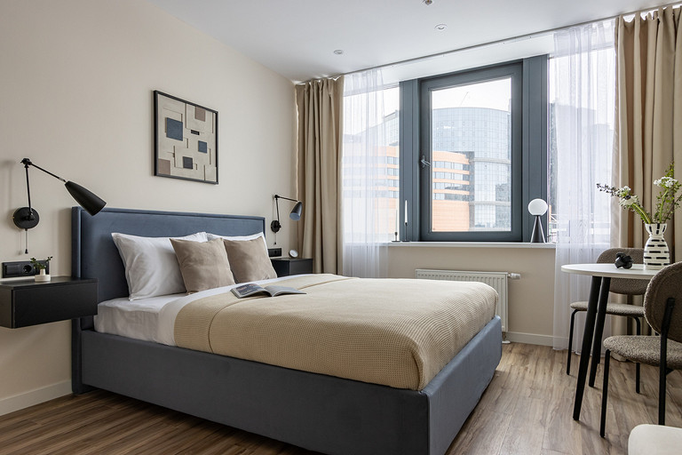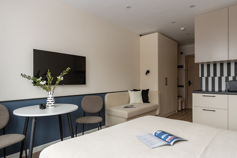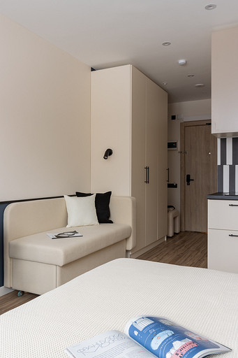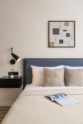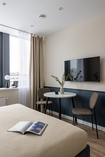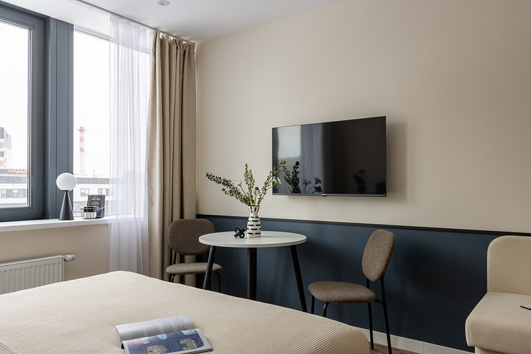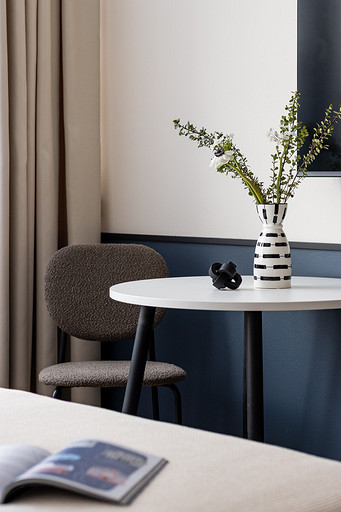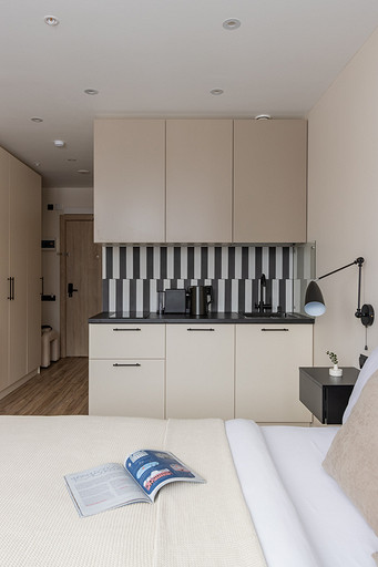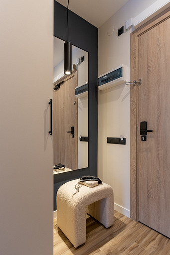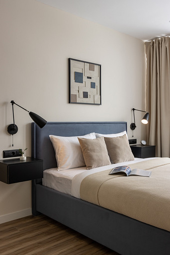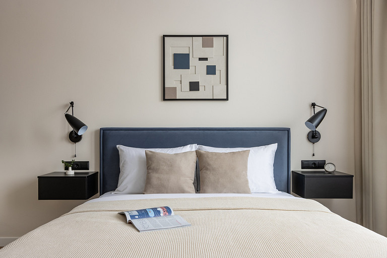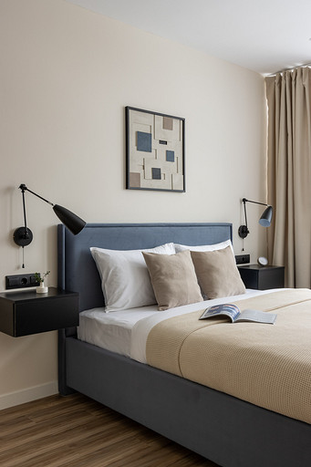 ФОРТЕ и ПИАНО — два апартамента для сдачи в аренду гостям Петербурга. Мои заказчики решили сделать похожие номера в разных акцентных цветах. Фоновый цвет стен и корпусной мебели, а также кухонный фартук — одинаковые. И именно из-за черно-белого фартука, уложенного со смещением и напоминающего клавиши фортепиано, апартаменты получили свои имена и идею. ФОРТЕ — громкий, апартамент с бордовым цветом и ПИАНО — тихий, апартамент с синим цветом. Номера сдавались с отделкой от застройщика, которую мы доработали (перекрасили стены, добавили розетки и др). Корпусная мебель изготовлена на заказ, акцентный фартук из плитки Equipe, кровать, кушетка — мебельное производство, остальные товары преимущественно с маркетплейсов. Помимо фартука фокусной точкой каждого апартамента является панно, расположенное над изголовьем кровати. Эти панно я купила на маркетплейсе, они были полностью белые. Но чтобы привнести цвет и геометрические элементы в интерьер я выкрасила некоторые детали панно в акцентные цвета — для каждого номера свои.