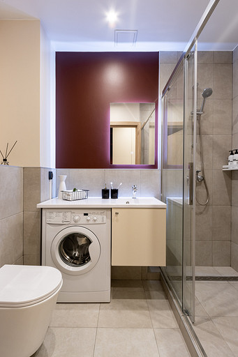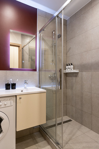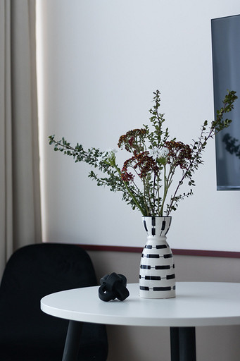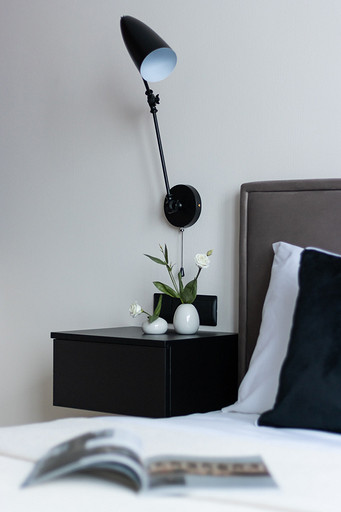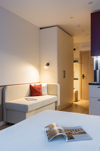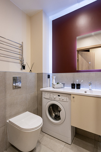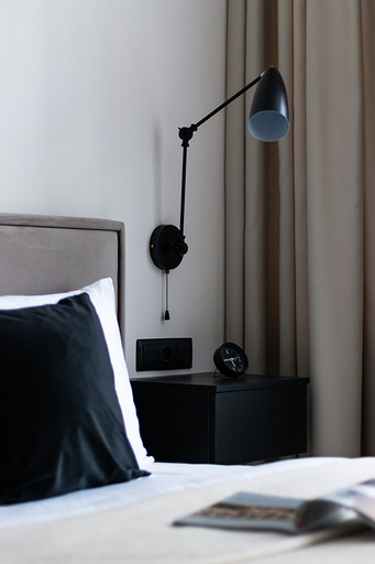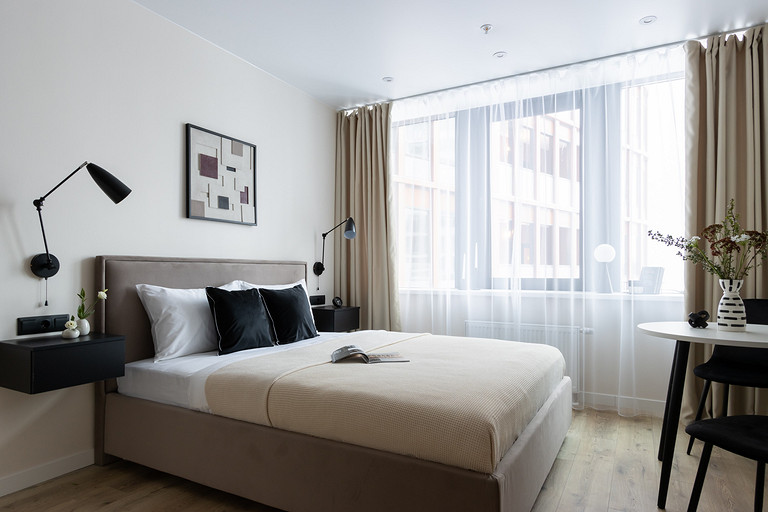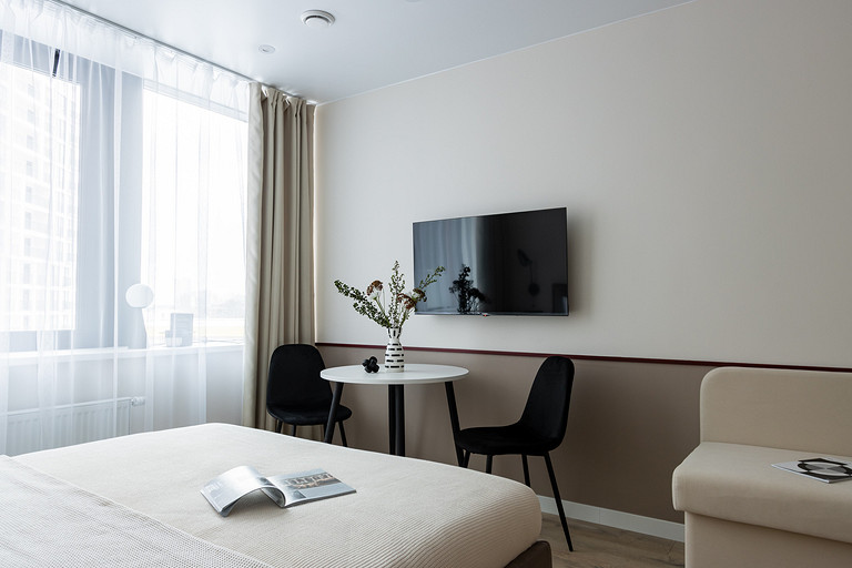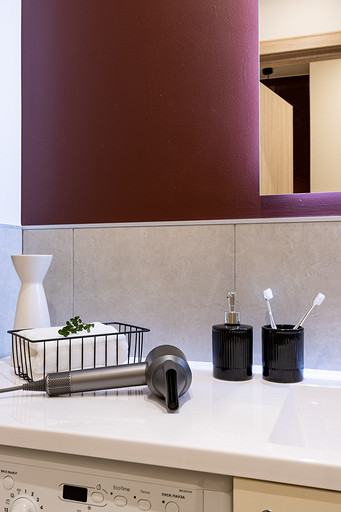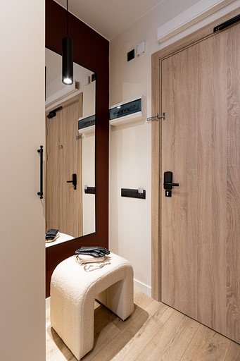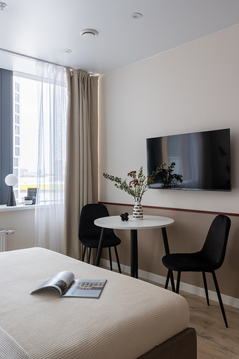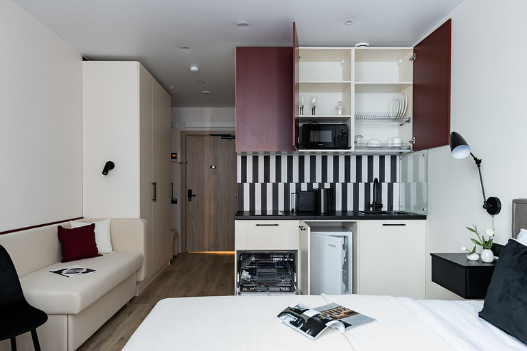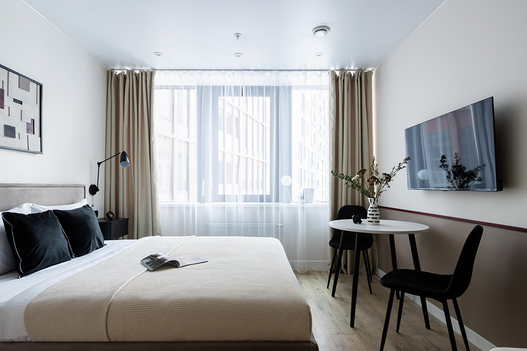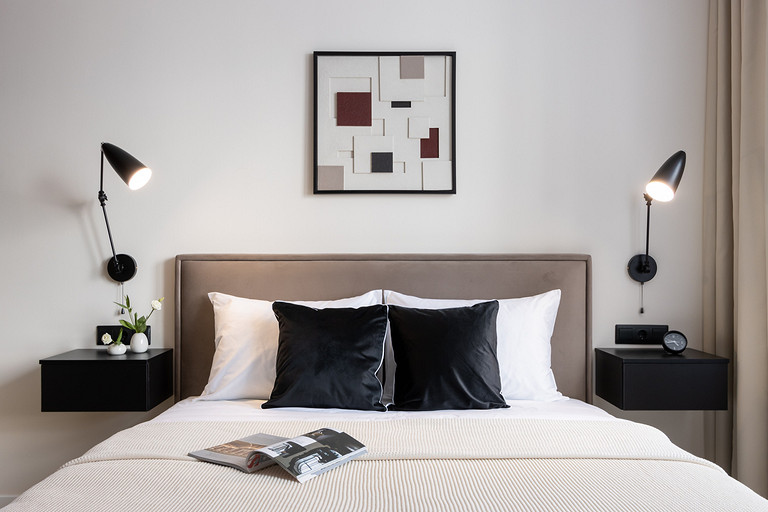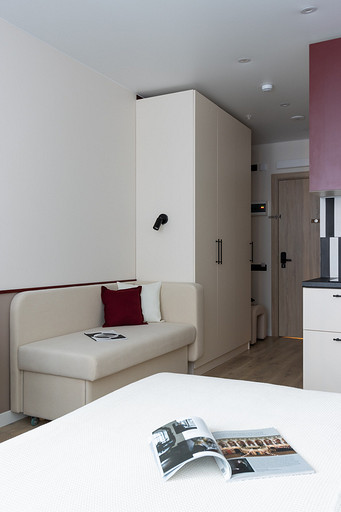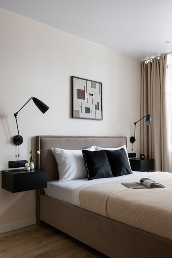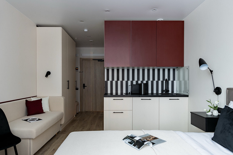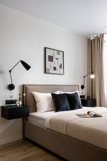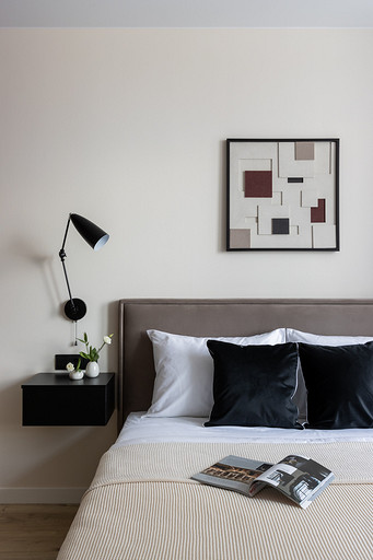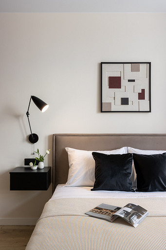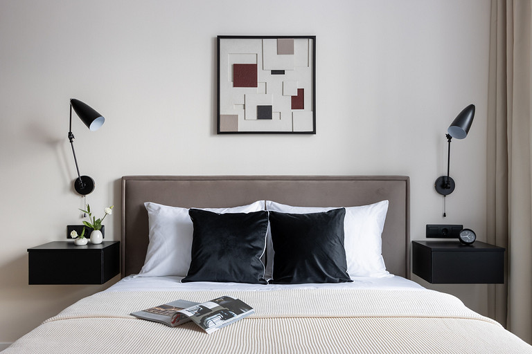 ФОРТЕ и ПИАНО — два апартамента для сдачи в аренду гостям Петербурга. Мои заказчики решили сделать похожие номера в разных акцентных цветах. Фоновый цвет стен и корпусной мебели, а также кухонный фартук — одинаковые. И именно из-за черно-белого фартука, уложенного со смещением и напоминающего клавиши фортепиано, апартаменты получили свои имена и идею. ФОРТЕ — громкий, апартамент с бордовым цветом и ПИАНО — тихий, апартамент с синим цветом. Номера сдавались с отделкой от застройщика, которую мы доработали (перекрасили стены, добавили розетки и др). Корпусная мебель изготовлена на заказ, акцентный фартук из плитки Equipe, кровать, кушетка — мебельное производство, остальные товары преимущественно с маркетплейсов. Помимо фартука фокусной точкой каждого апартамента является панно, расположенное над изголовьем кровати. Эти панно я купила на маркетплейсе, они были полностью белые. Но чтобы привнести цвет и геометрические элементы в интерьер я выкрасила некоторые детали панно в акцентные цвета — для каждого номера свои.