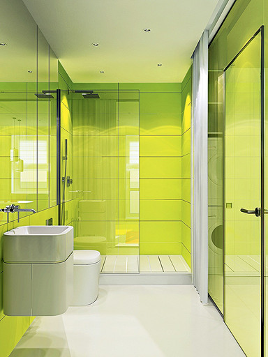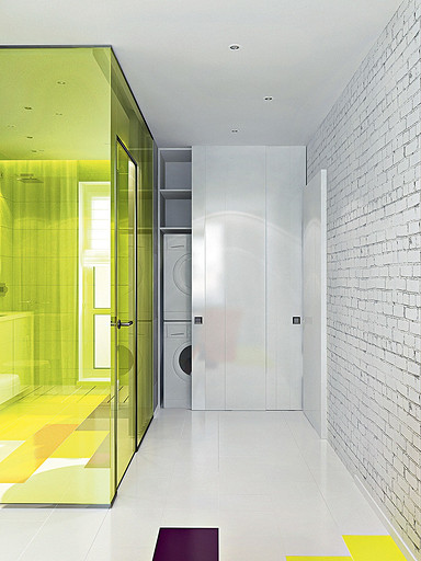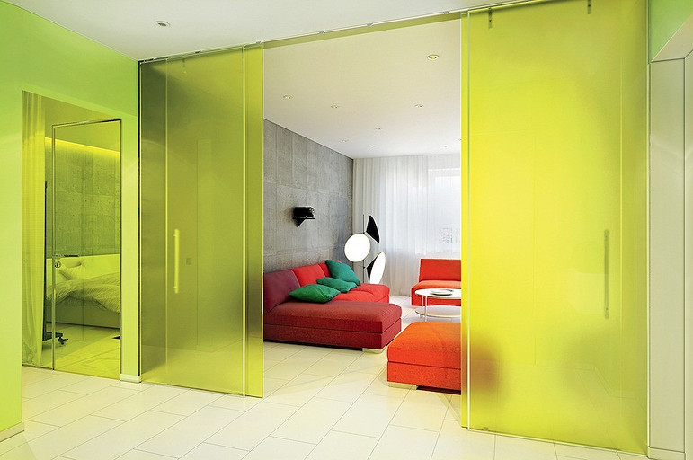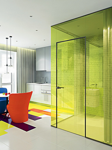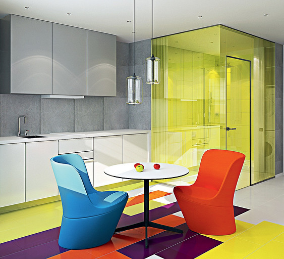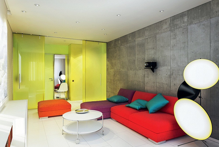 Яркая мебель и стеклянные перегородки: минималистичный интерьер с элементами поп-арта