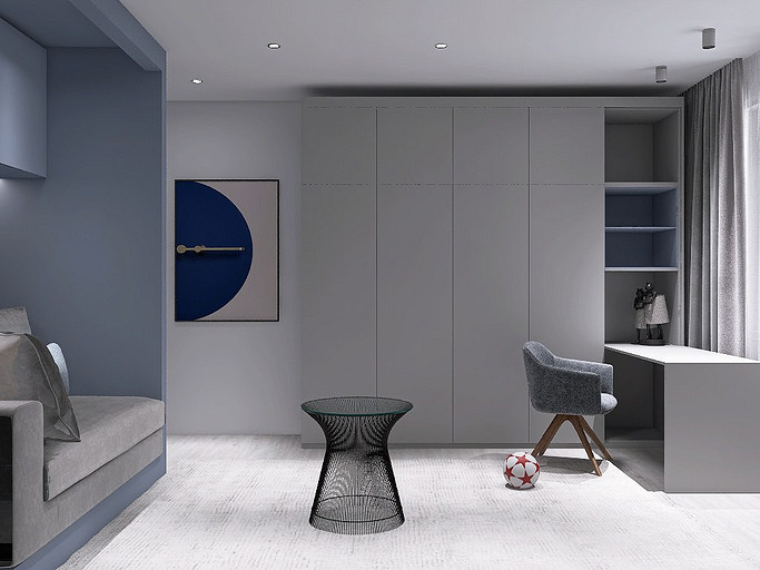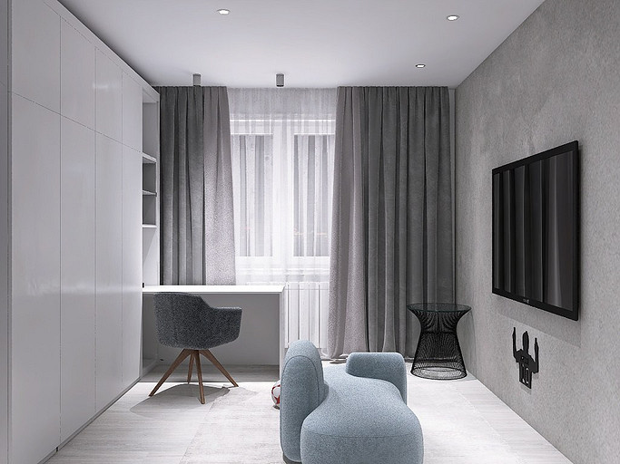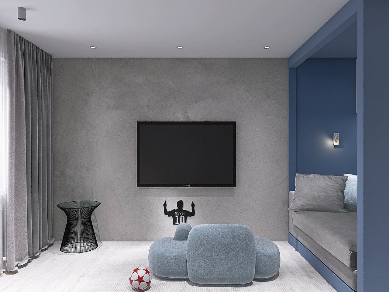Проект «Серый калибр» выполнен в современном стиле. Это интерьер детской комнаты для мальчика-подростка 12 лет, в котором взросление звучит уверенно. Пространство оформлено в сдержанных серых и серо-синих тонах; цветах разума, глубины и концентрации. Здесь нет хаоса, только структурная гармония, линии, которые ведут, формы, которые успокаивают. Дизайн со своим характером: четкий, выверенный, стильный. Здесь нет яркости — есть сила, точность и предчувствие будущей взрослой жизни. Каждая деталь неслучайна: эргономичная мебель поддерживает правильную осанку и мышление.
