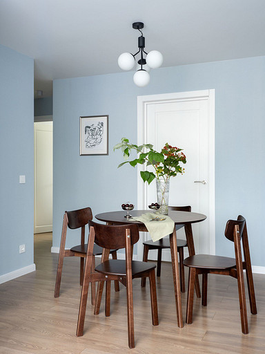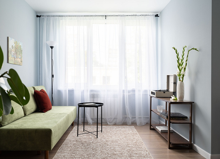 - Картины: в спальне и гостиной — Инга Павлова, над диваном — Алена Федорова, пейзаж на кухне — Степан Малышев