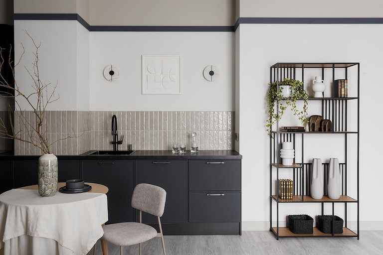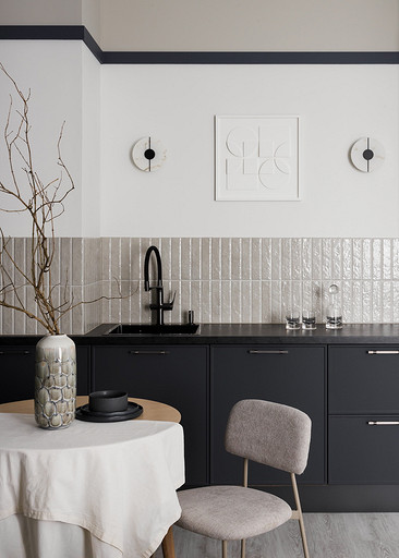 - Бытовая техника: духовой шкаф Gorenje, варочная поверхность Kuppersberg, холодильник и посудомоечная машина Haier, вытяжка и микроволновая печь Maunfeld