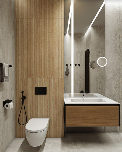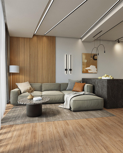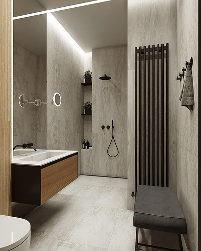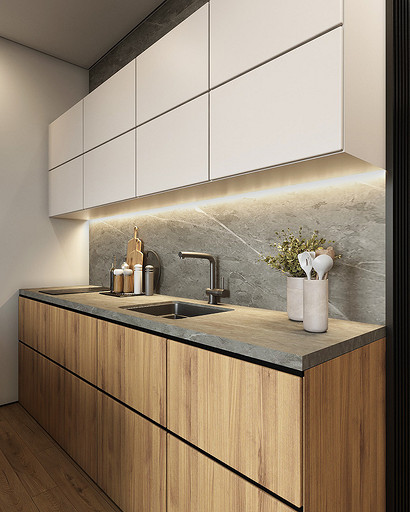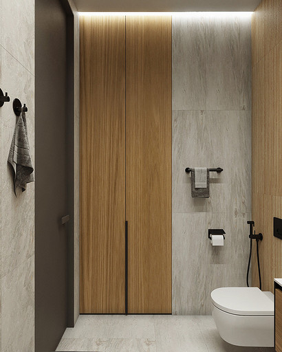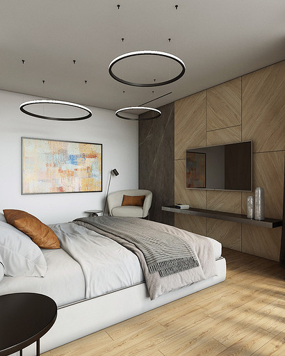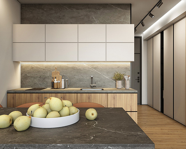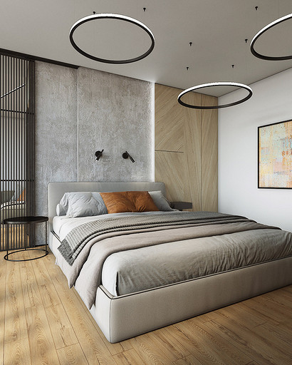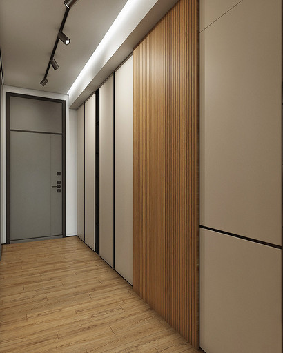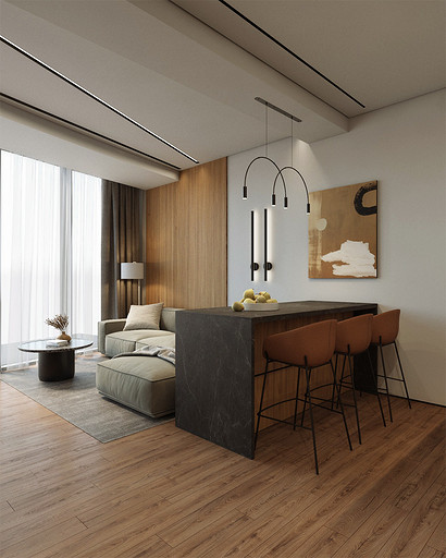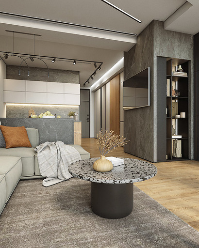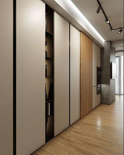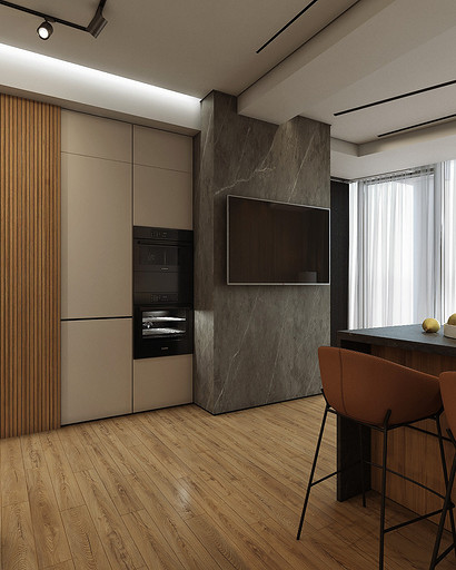 Заказчик хотел, чтобы интерьер был современным, технологичным и комфортным, оформленным в стиле минимализм. Поэтому было принято решение изолировать спальню от кухни-гостиной с помощью шкафов и пеналов с техникой. Обеденную зону организовали с использованием функционального острова. Чтобы не перегружать пространство визуальным шумом, все шкафы и коммуникации спрятали за фасадами мебели. Эта квартира предназначена для отдыха в любое время года, поэтому предусмотрено множество мест для хранения вещей.