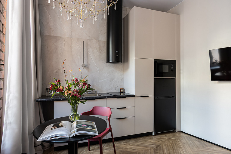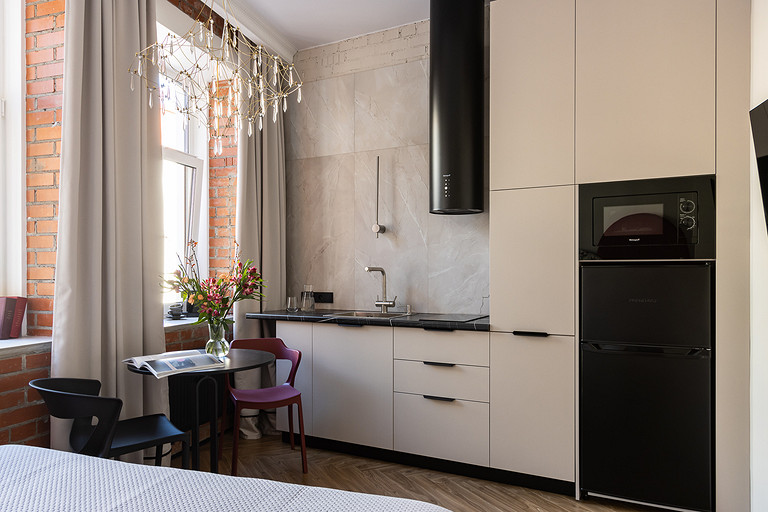 Ключевой идеей стало создание ощущения причастности к истории для современного арендатора. Перед нами стояли четкие задачи: объект должен быть привлекательным для гостей, которые ищут не просто место для ночлега, а уникальный опыт проживания в историческом центре. И, конечно, апартамент должен быть максимально удобным в обслуживании для управляющей компании. За проектом стоит ателье интерьерных решений MARINGA, основанное дизайнером Марией Морковниковой и сооснователем управляющей компании Ингой Ефимовой.