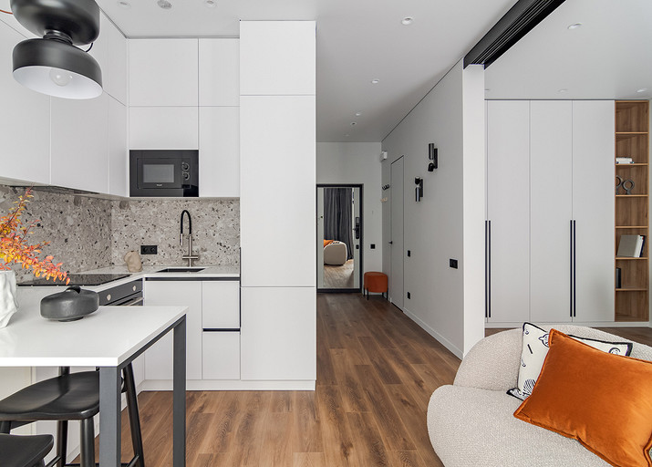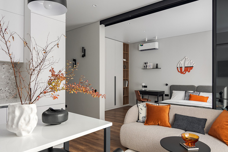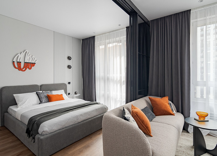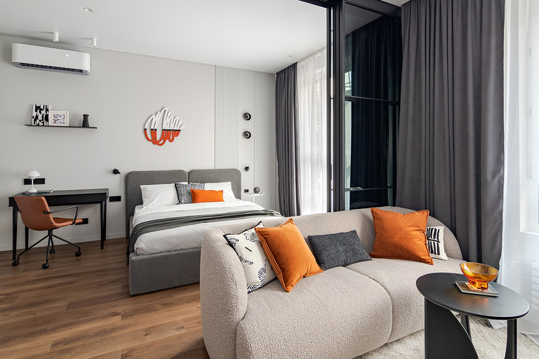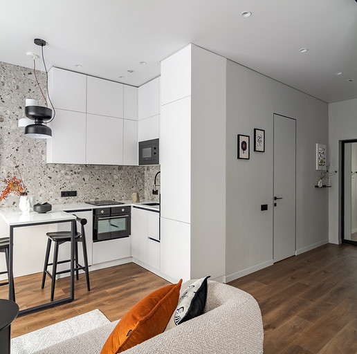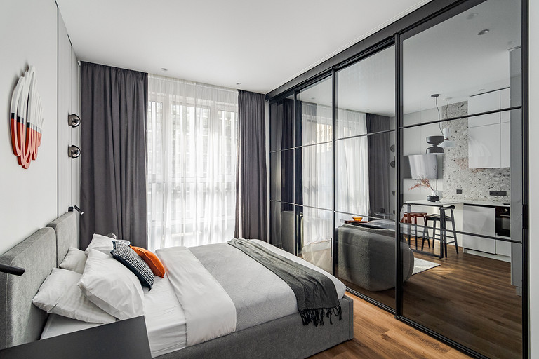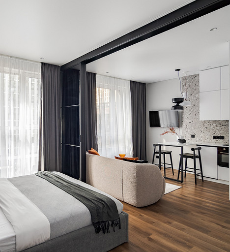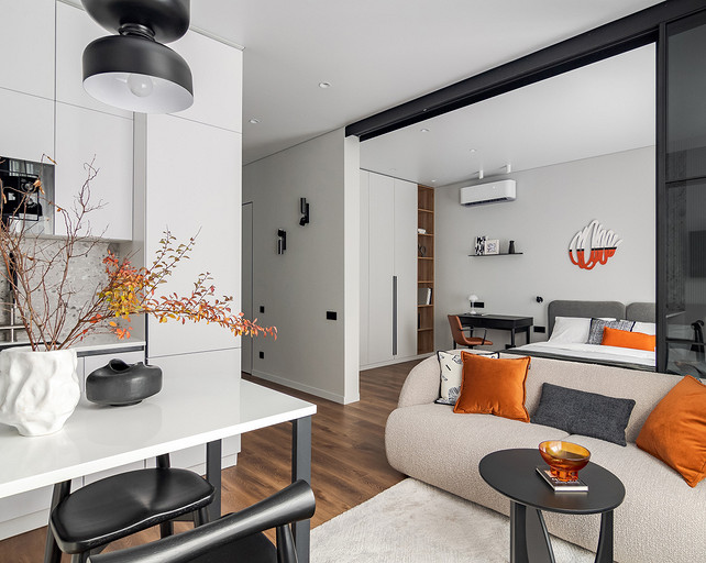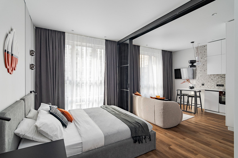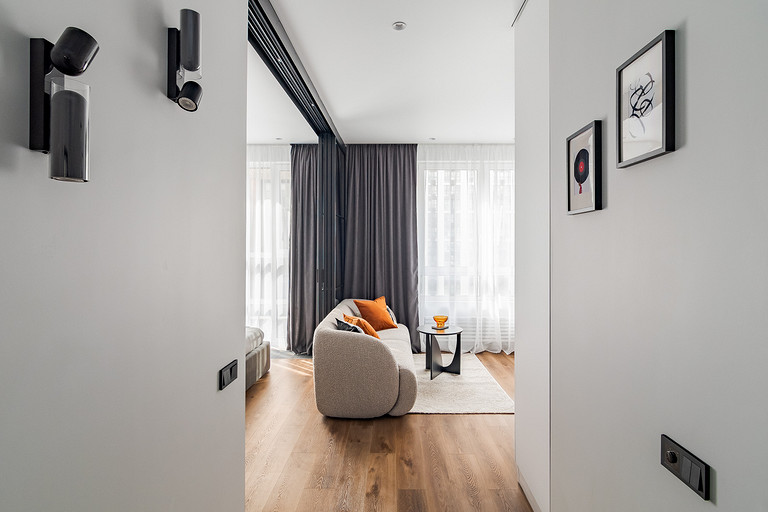 Визуально хотелось придерживаться образа светлой европейской квартиры с яркими деталями. Общее пространство, которое с помощью стеклянной перегородки превращается в две самостоятельные зоны.