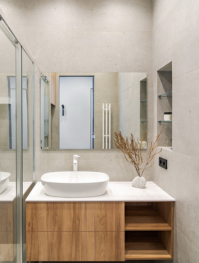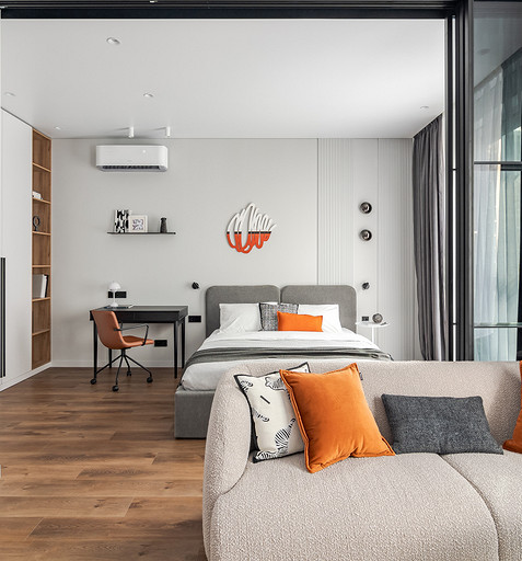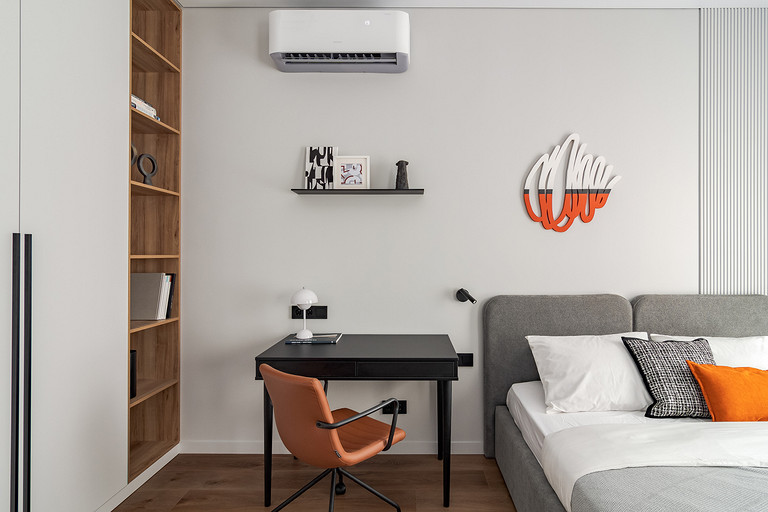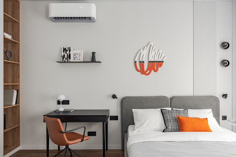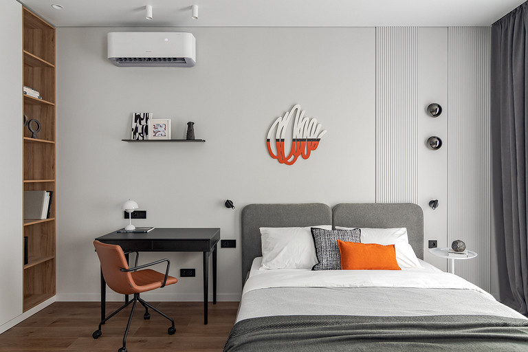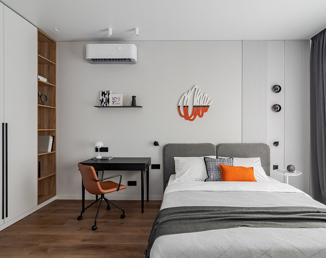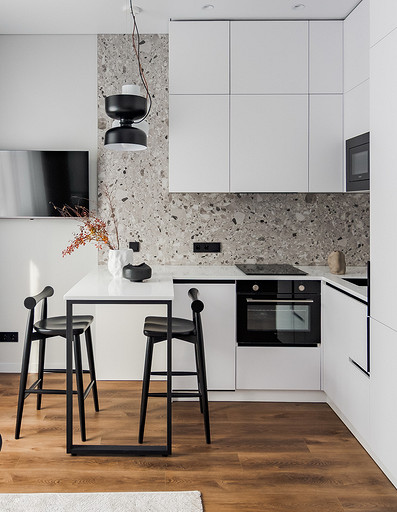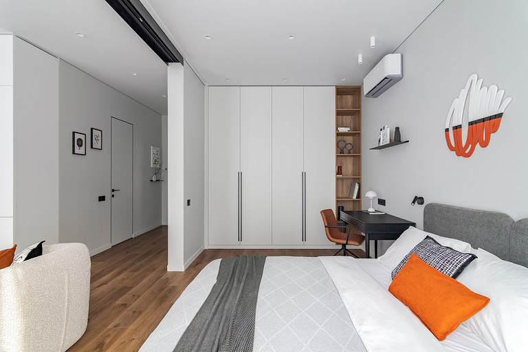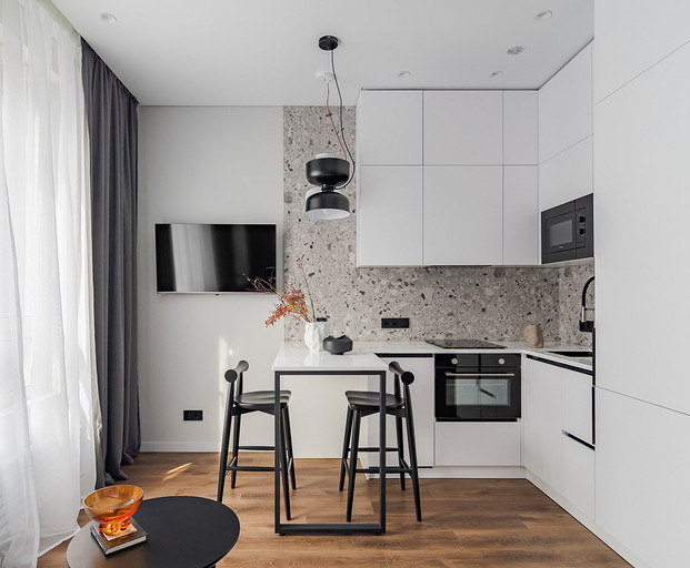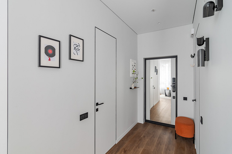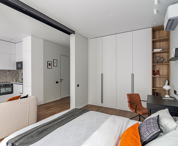 Визуально хотелось придерживаться образа светлой европейской квартиры с яркими деталями. Общее пространство, которое с помощью стеклянной перегородки превращается в две самостоятельные зоны.