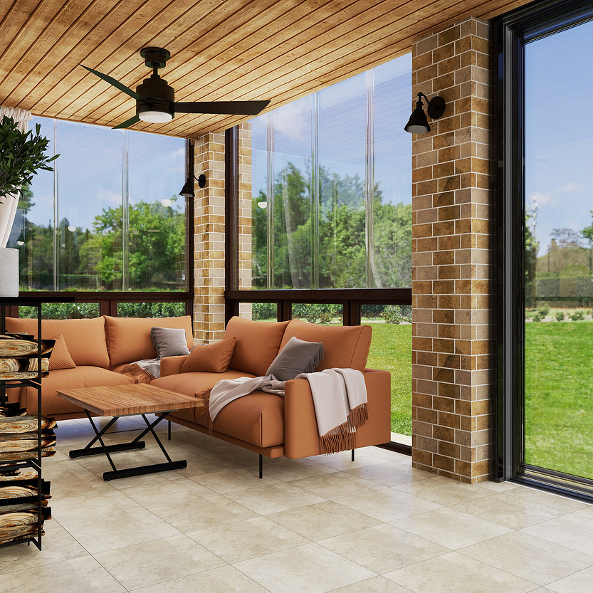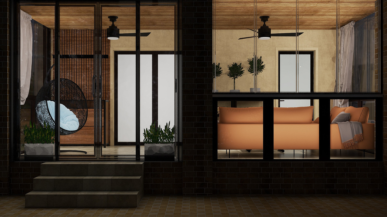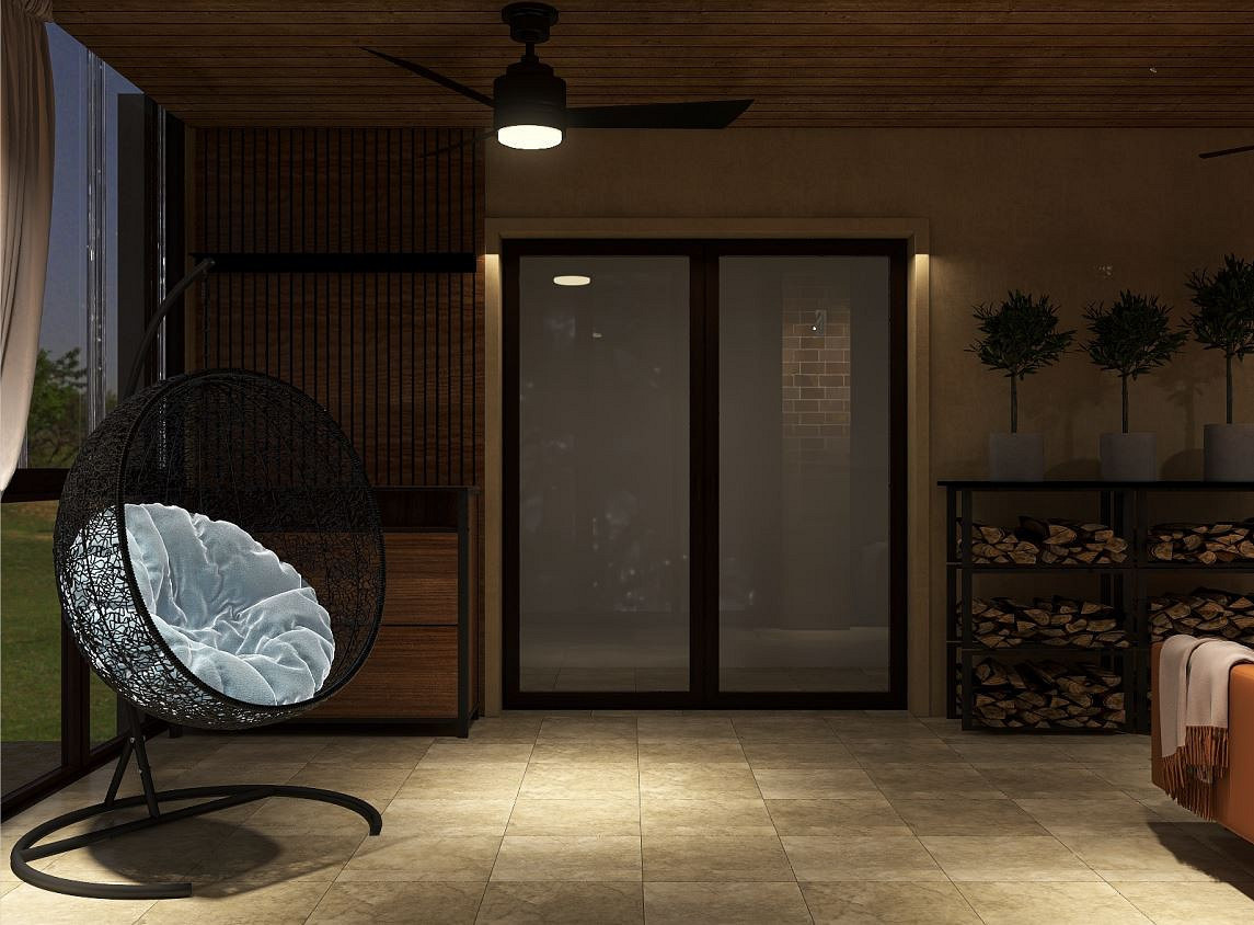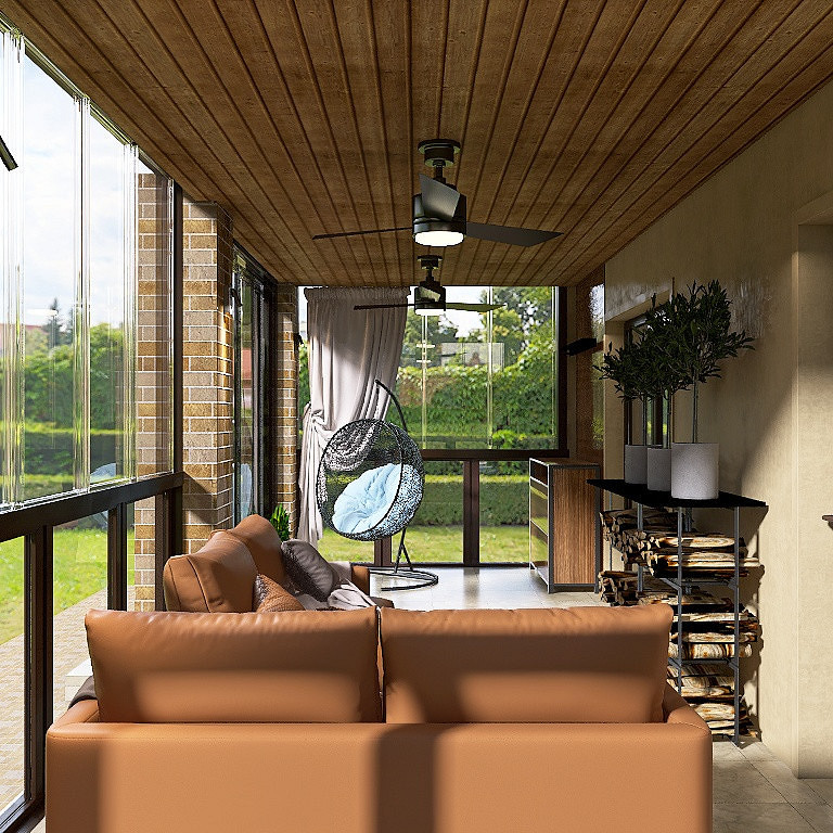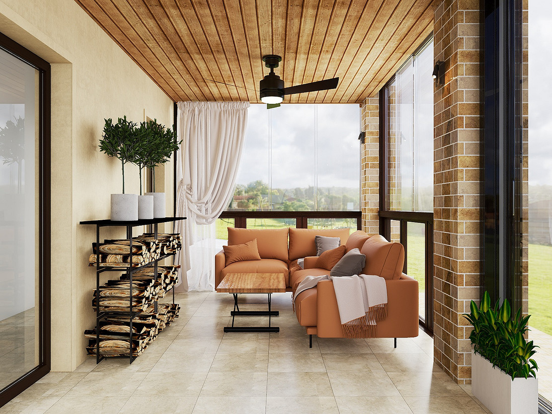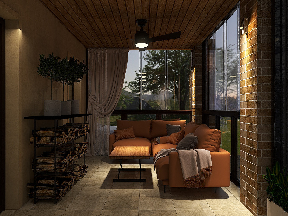 Это не просто зона отдыха, а многофункциональное пространство, которое трансформируется под разные сценарии жизни. Здесь удобно собираться всей семьёй за обедом или проводить вечера в узком кругу с бокалом вина. Терраса также легко становится площадкой для встреч с друзьями и долгих разговоров до рассвета. Тёплый оттенок кожи дивана контрастирует с прохладной фактурой кирпича, а натуральное дерево на потолке словно соединяет дом с природой. Панорамные окна стирают границы между «внутри» и «снаружи», превращая пространство в живую декорацию, которая меняется вместе с небом и временем суток. Баланс света, материалов и пропорций создаёт ощущение свободы и подчёркивает индивидуальность хозяев.