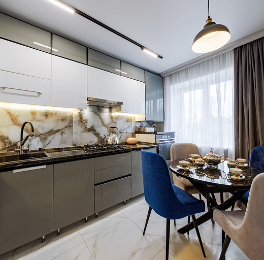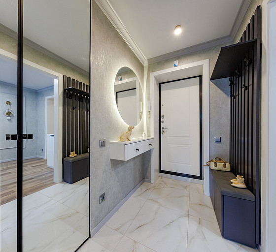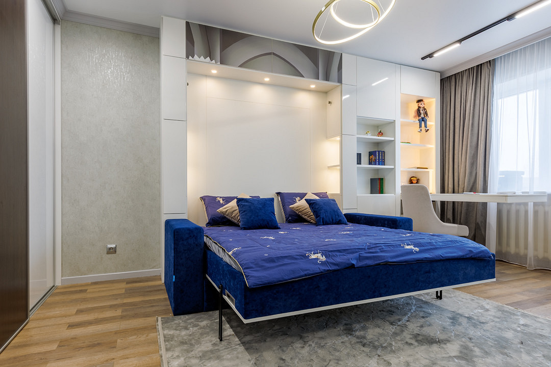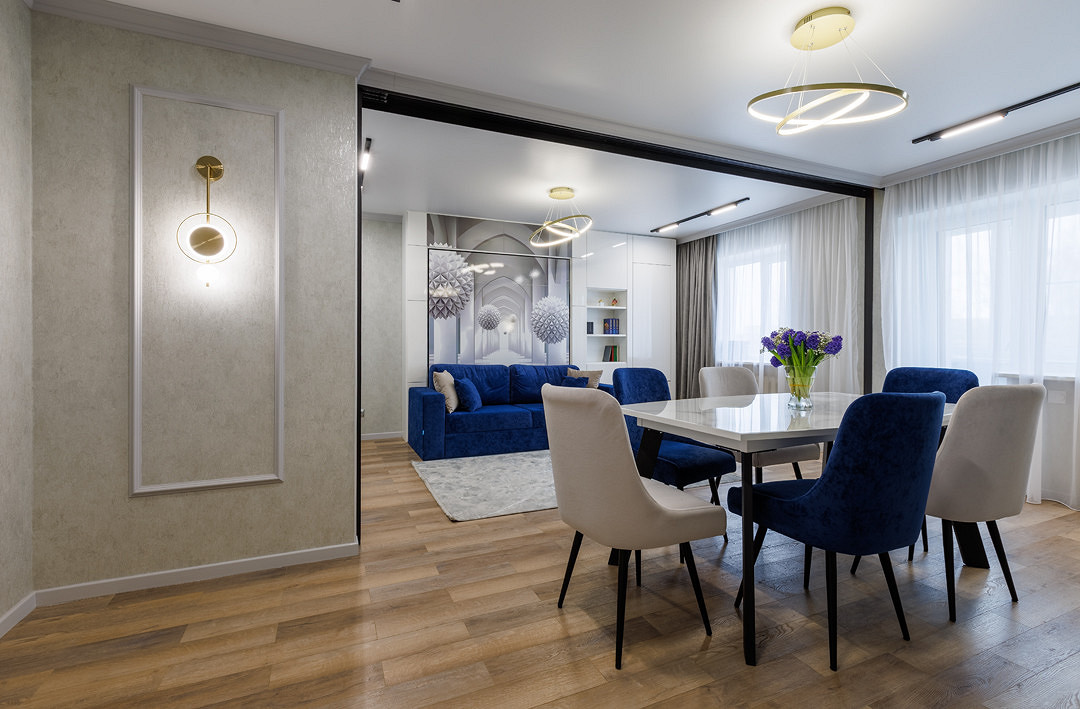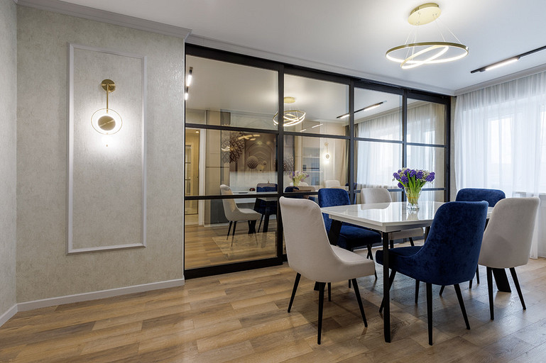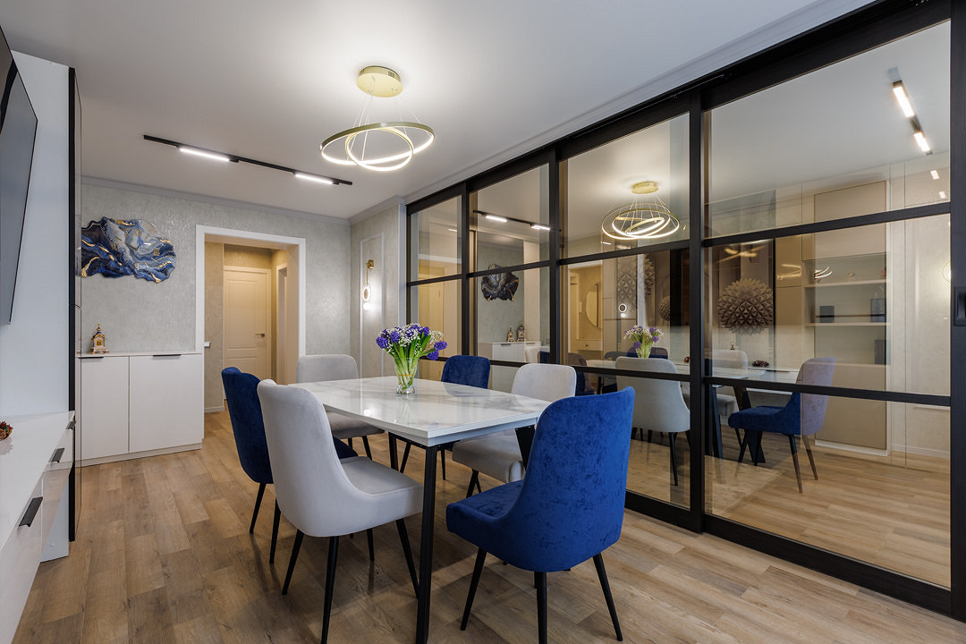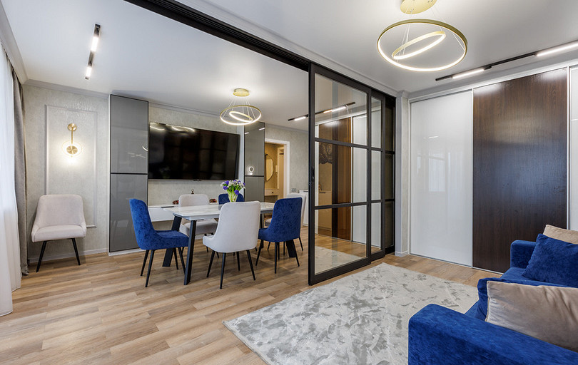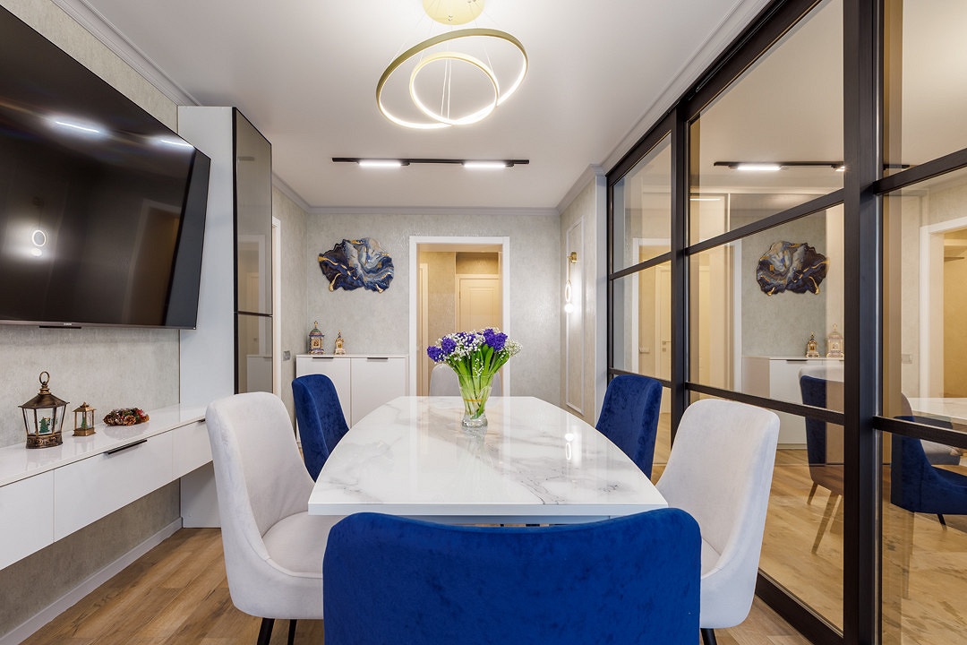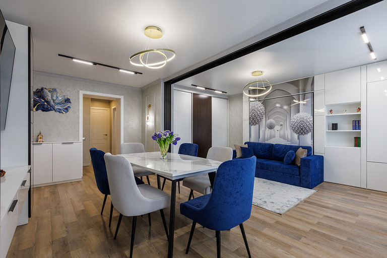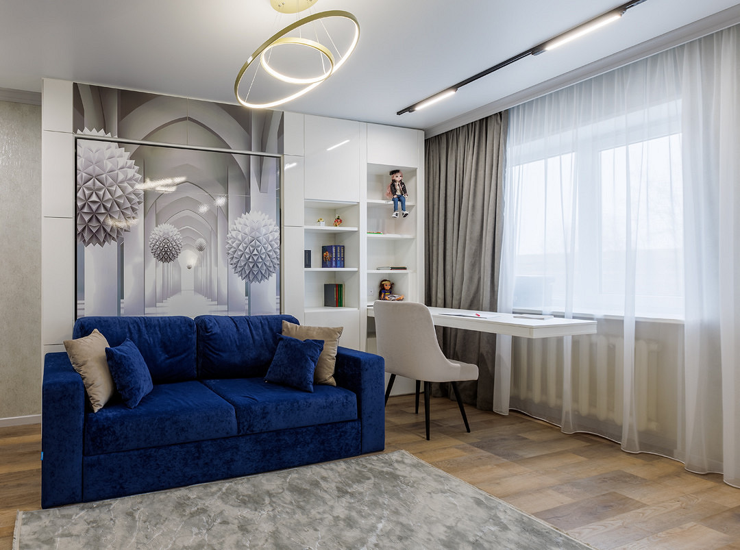 В дизайне этой квартиры использованы синий, серый и белый цвета. Благодаря их точно подобранной комбинации удалось создать стильное и гармоничное пространство. Также стояла задача объединения гостиной и детской комнаты с возможностью разделения раздвижной стеклянной перегородкой. Холодильник из кухни переместили в коридор. В гостиной установили просторный обеденный стол. В детской − мебель-трансформер, включающую в себя диван с откидной кроватью и письменный стол. На основании кровати сделали фотообои с увеличивающим пространство рисунком. В ванной установили душевой уголок. Это не только практично, но и позволяет создать эффект простора. Одним из основных преимуществ данного интерьера является использование практичных и долговечных материалов. Керамогранит и кварцвиниловый ламинат легко чистятся и не требуют особого ухода. Благодаря этому интерьер будет выглядеть новым и ухоженным на протяжении длительного времени. Серые однотонные обои и черные реечные панели добавляют интерьеру сдержанности и современности. Эти цветовые решения позволяют создать гармоничный фон для дополнительных элементов декора. В результате, удалось создать уютное место, где заказчица и ее семья могут отдохнуть и насладиться пребыванием дома.