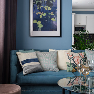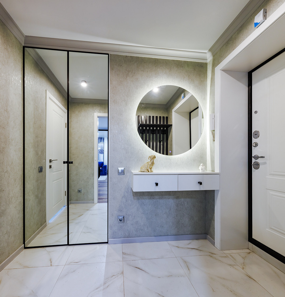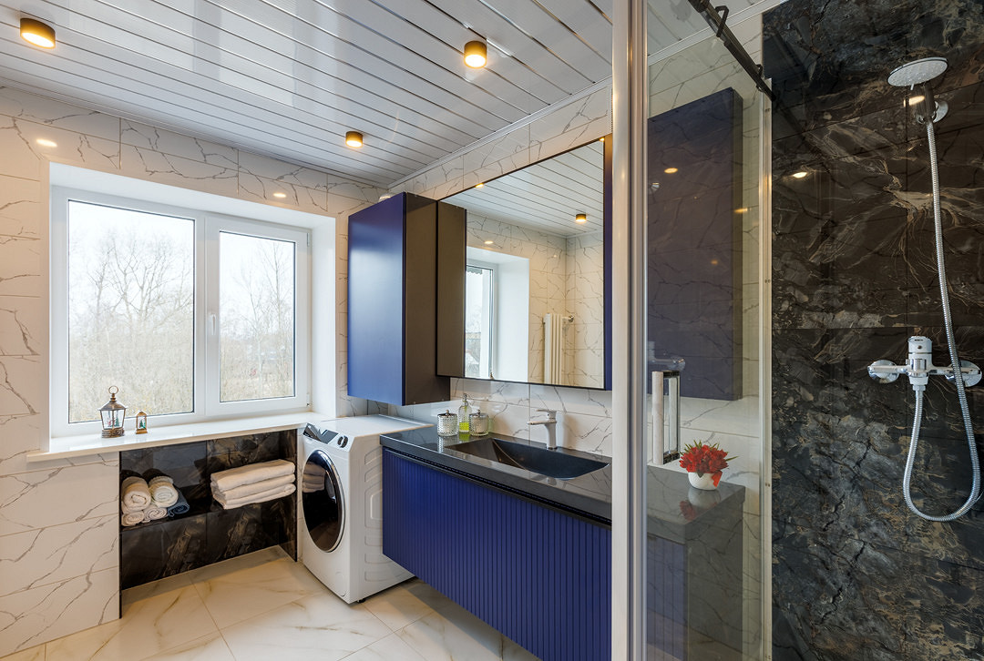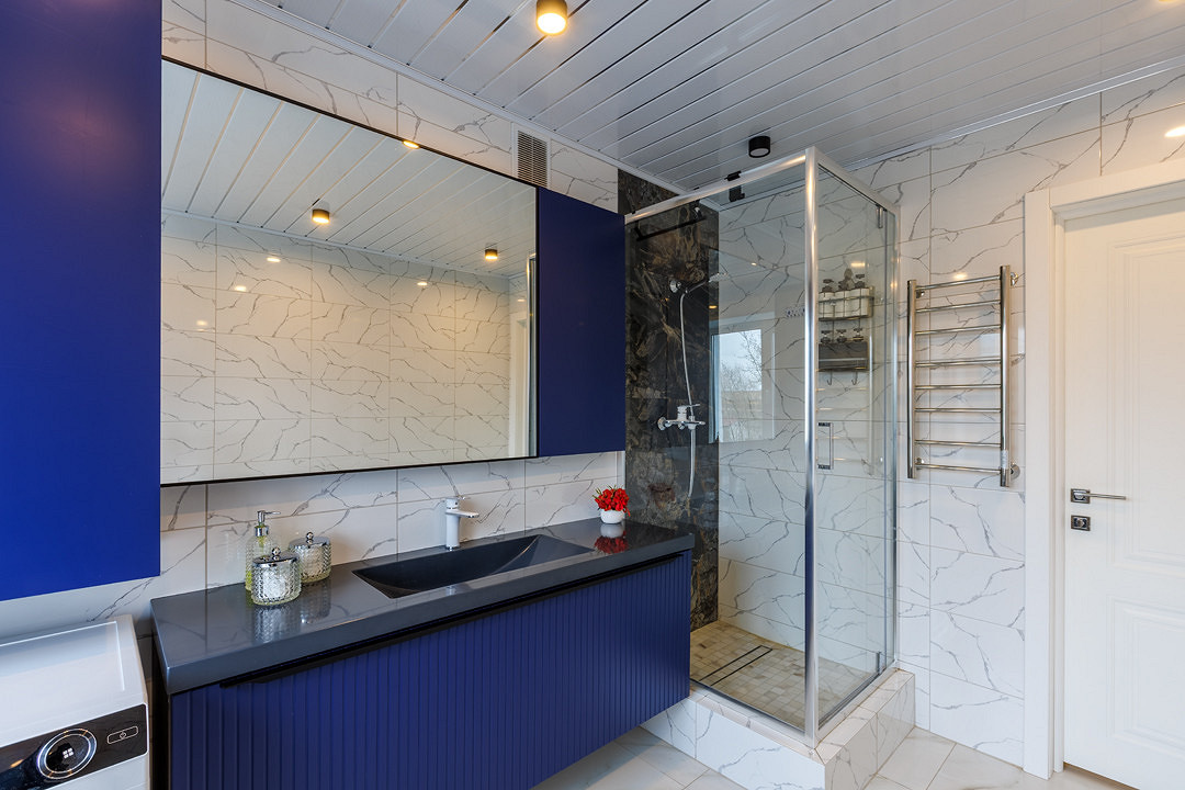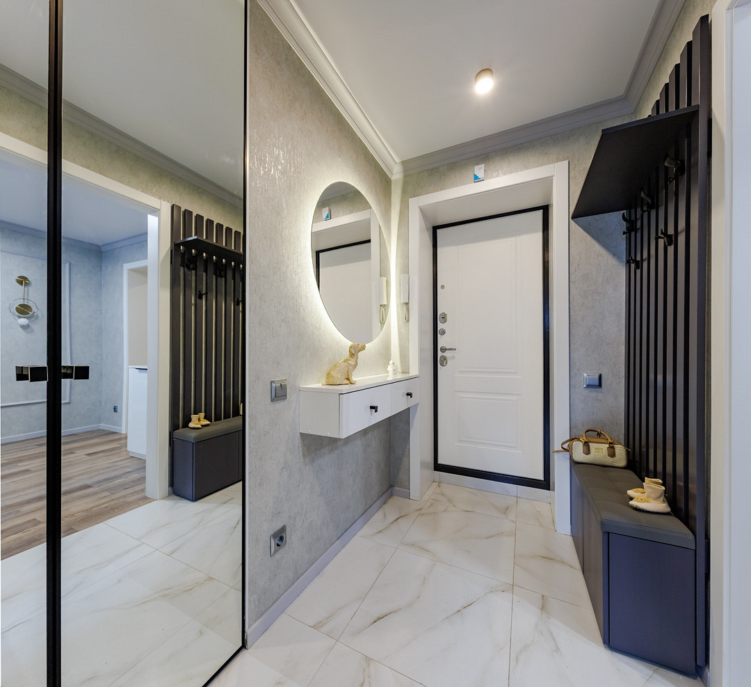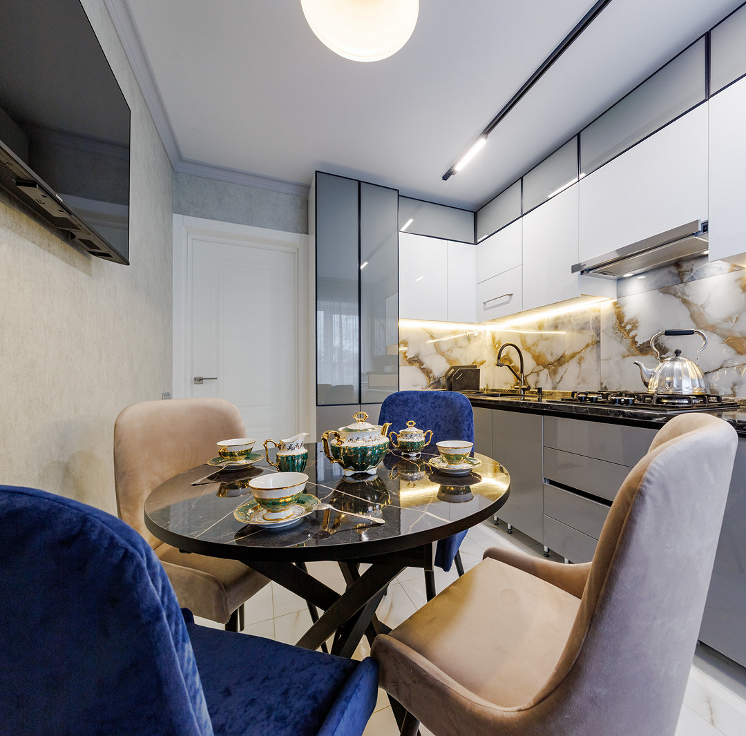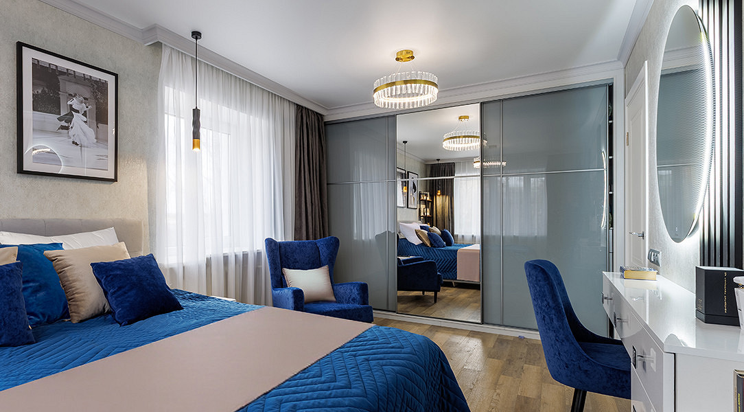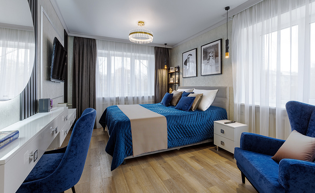 В дизайне этой квартиры использованы синий, серый и белый цвета. Благодаря их точно подобранной комбинации удалось создать стильное и гармоничное пространство. Также стояла задача объединения гостиной и детской комнаты с возможностью разделения раздвижной стеклянной перегородкой. Холодильник из кухни переместили в коридор. В гостиной установили просторный обеденный стол. В детской − мебель-трансформер, включающую в себя диван с откидной кроватью и письменный стол. На основании кровати сделали фотообои с увеличивающим пространство рисунком. В ванной установили душевой уголок. Это не только практично, но и позволяет создать эффект простора. Одним из основных преимуществ данного интерьера является использование практичных и долговечных материалов. Керамогранит и кварцвиниловый ламинат легко чистятся и не требуют особого ухода. Благодаря этому интерьер будет выглядеть новым и ухоженным на протяжении длительного времени. Серые однотонные обои и черные реечные панели добавляют интерьеру сдержанности и современности. Эти цветовые решения позволяют создать гармоничный фон для дополнительных элементов декора. В результате, удалось создать уютное место, где заказчица и ее семья могут отдохнуть и насладиться пребыванием дома.