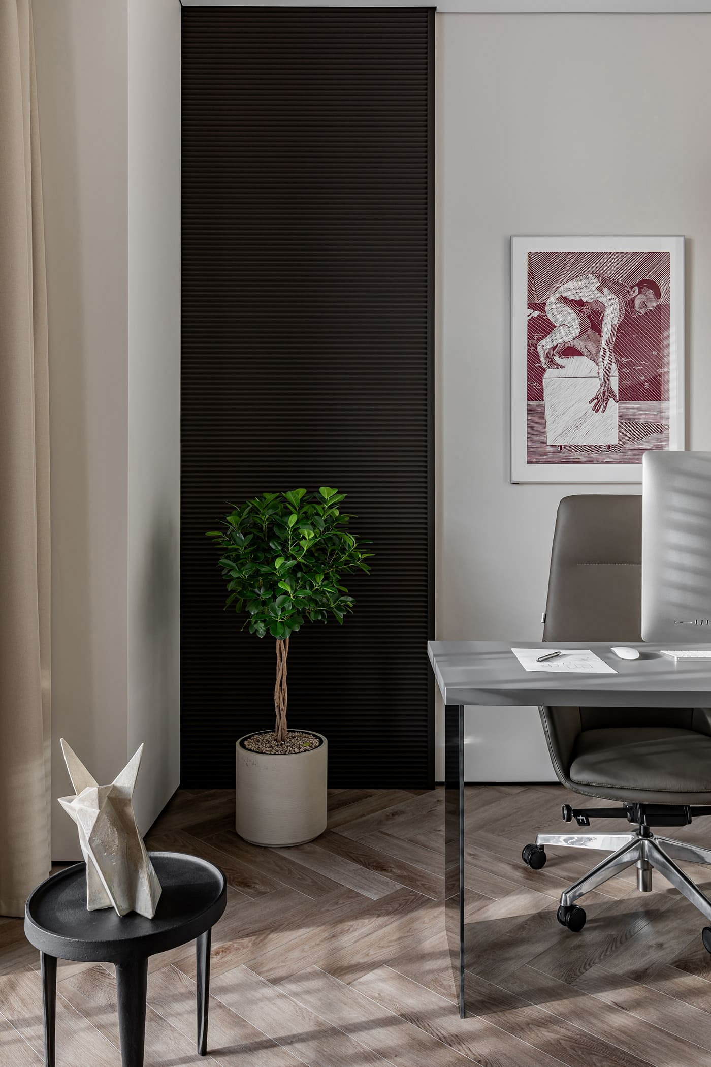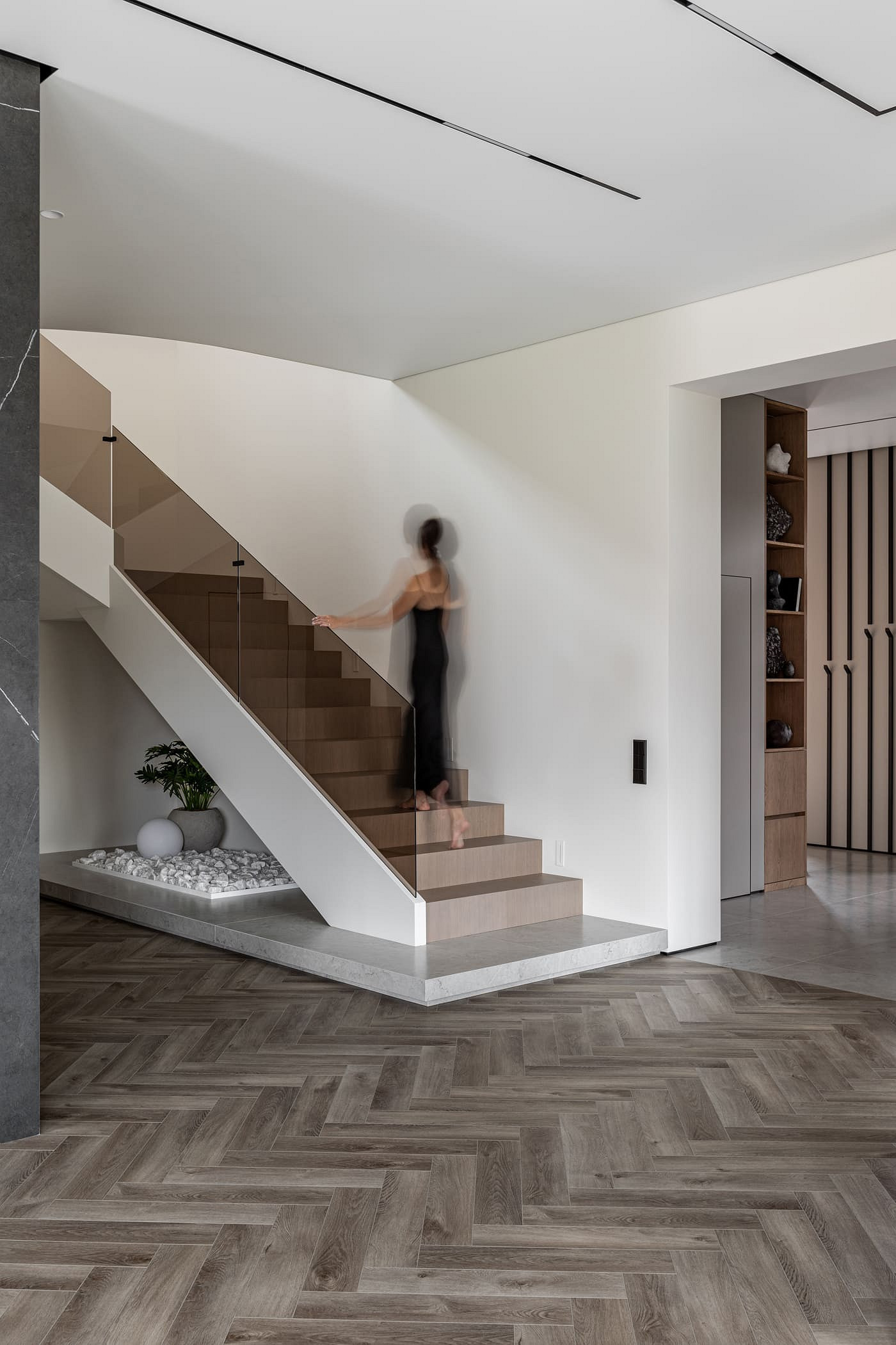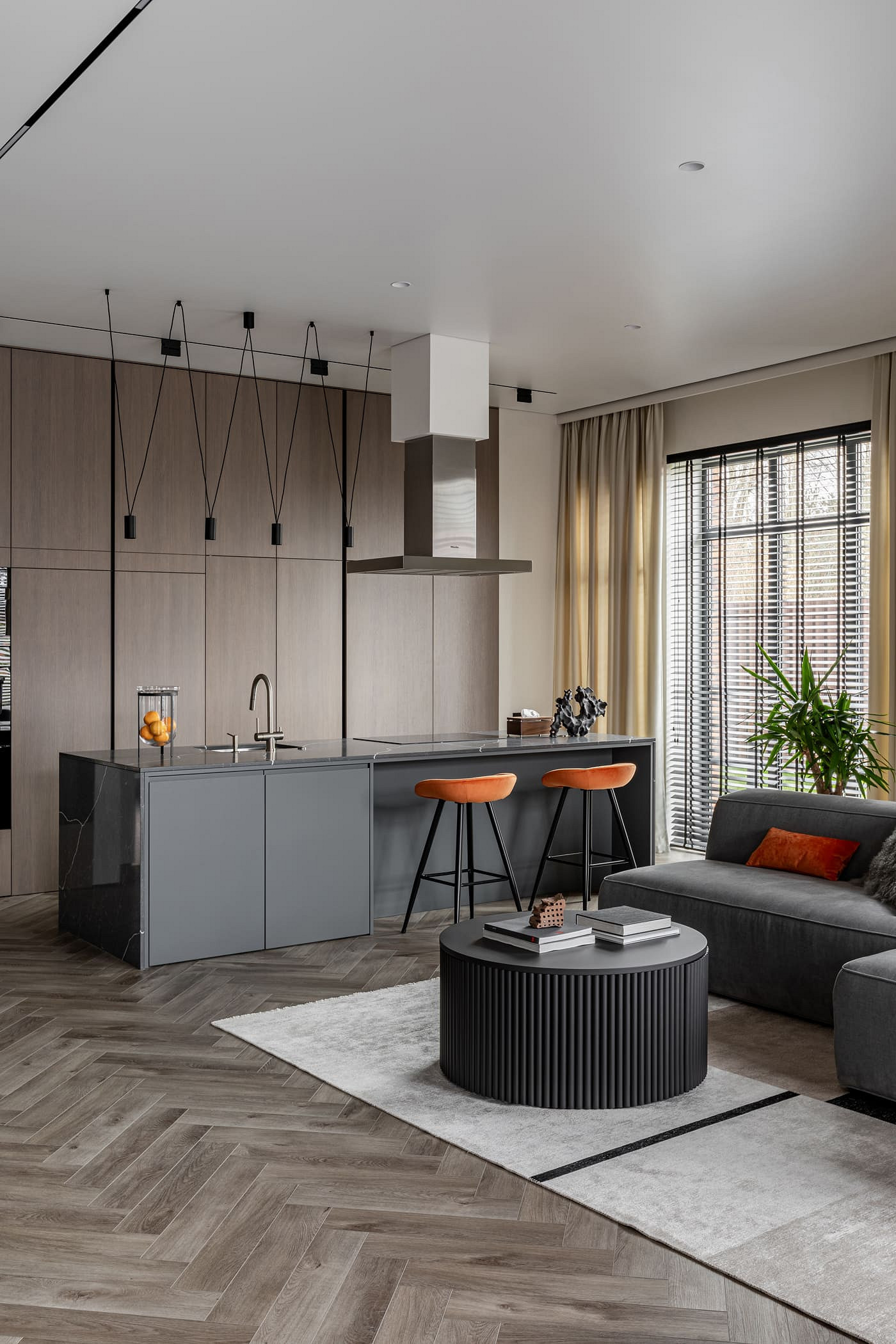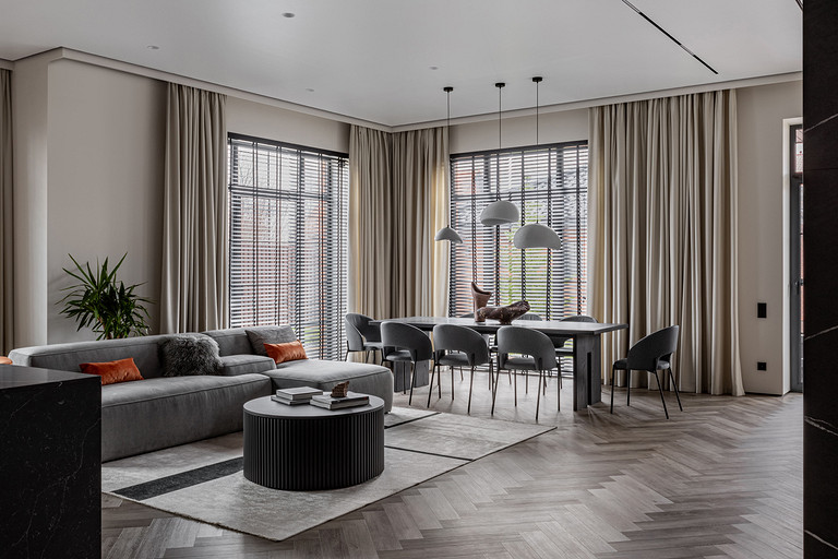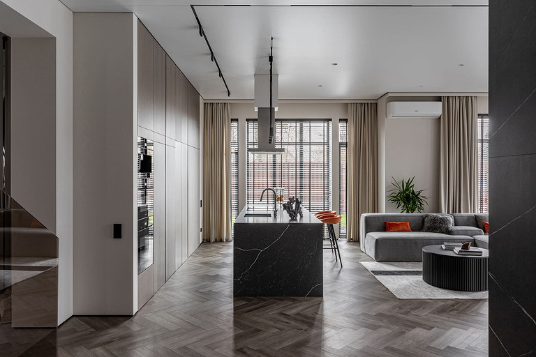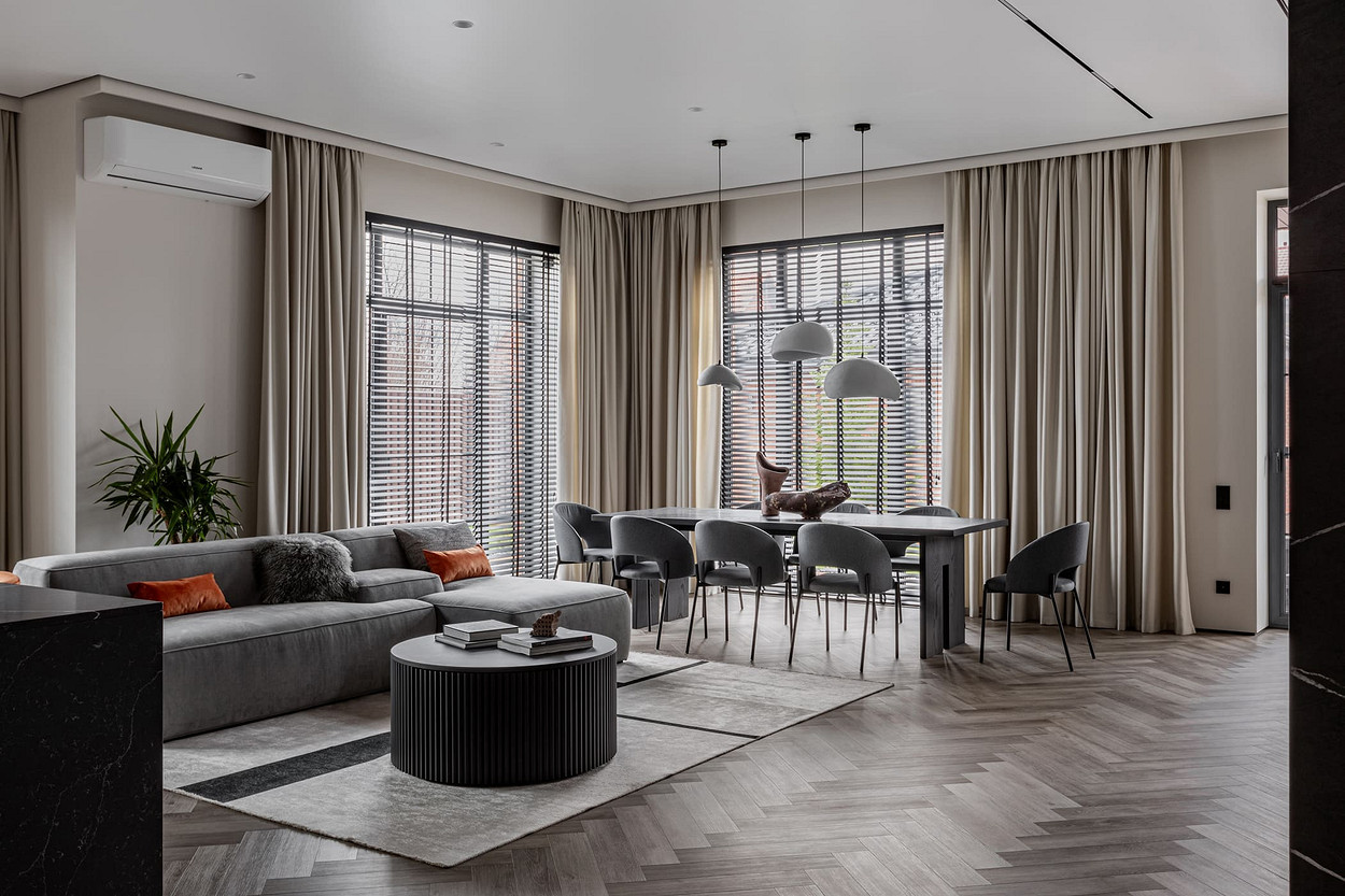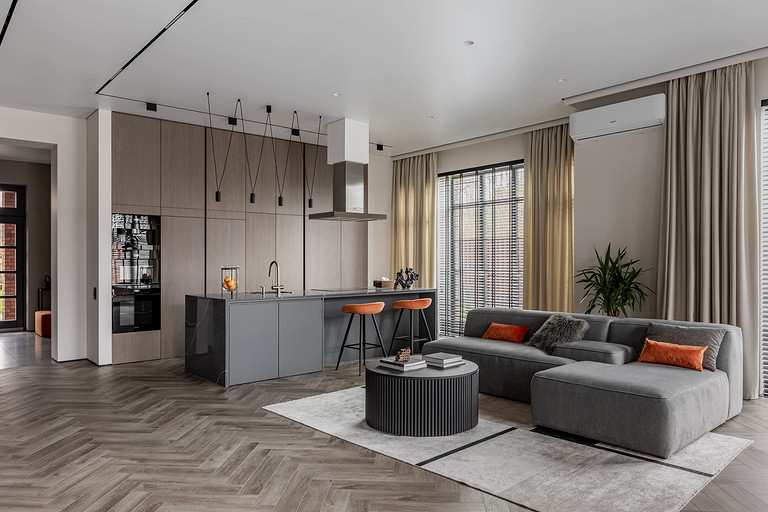 Интерьер для молодой пары с ребенком 9 лет. Заказчик владелец крупного бизнеса в Калининградской области. Основным запросом заказчика было создание современного, функционального, не кричащего интерьера с использованием натуральных материалов (дерево, стекло, камень) и ярких акцентов. Двухэтажный частный дом площадью 300 кв.м располагается в нескольких километрах от города Калининграда. Главная идея проекта – это создание современного интерьера, отвечающего всем последним тенденциям и главное запросам заказчика. Пространство хотелось сделать просторным, не загромажденным. Скрыть от глаз лишние детали и при этом сохранить функциональность.