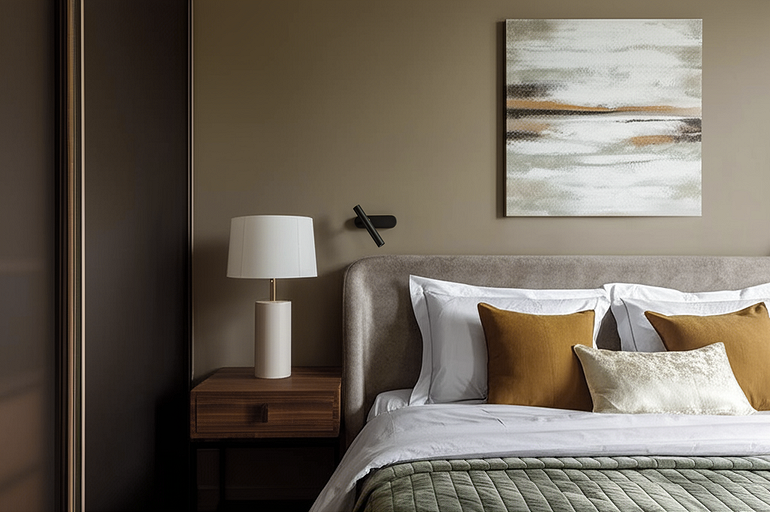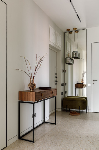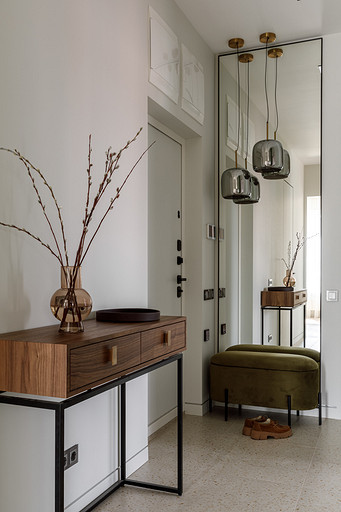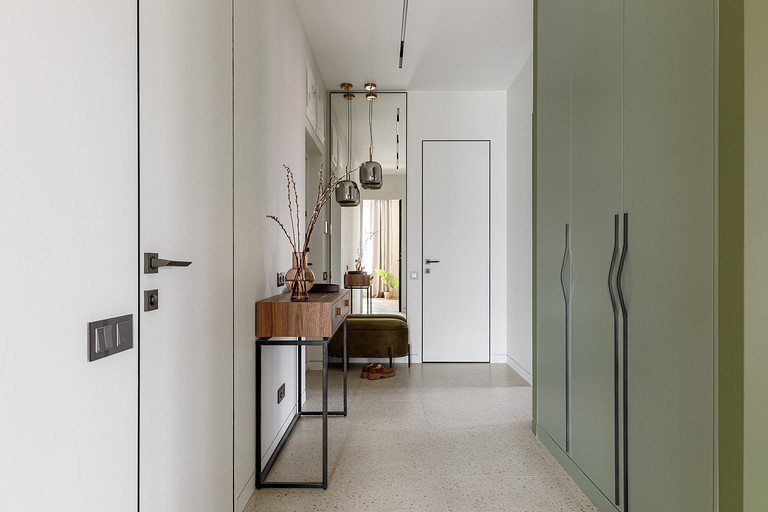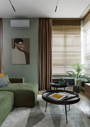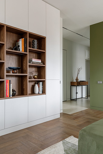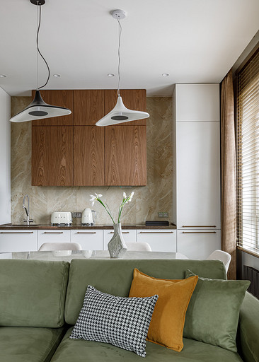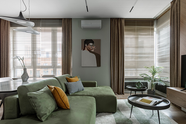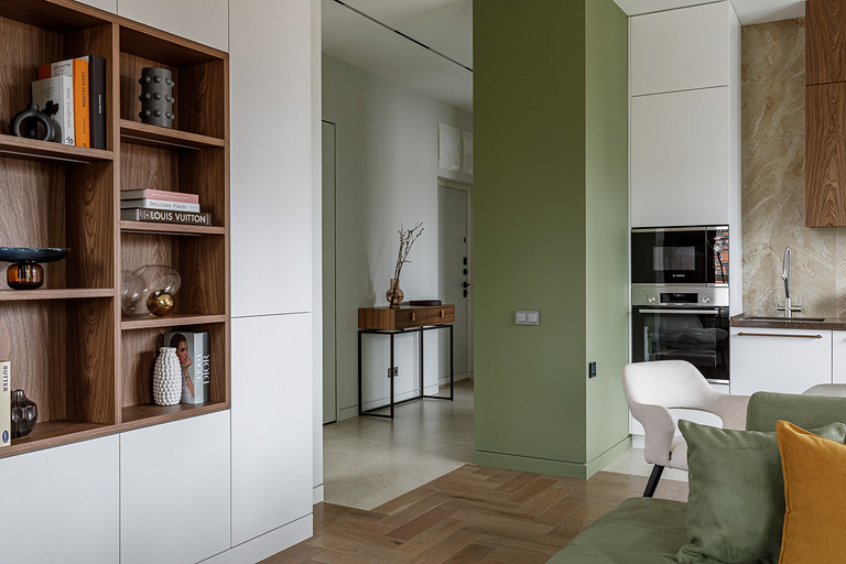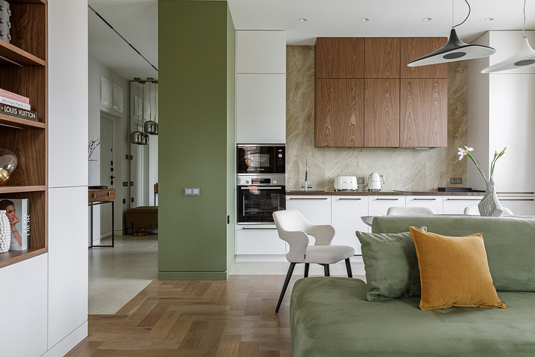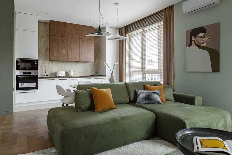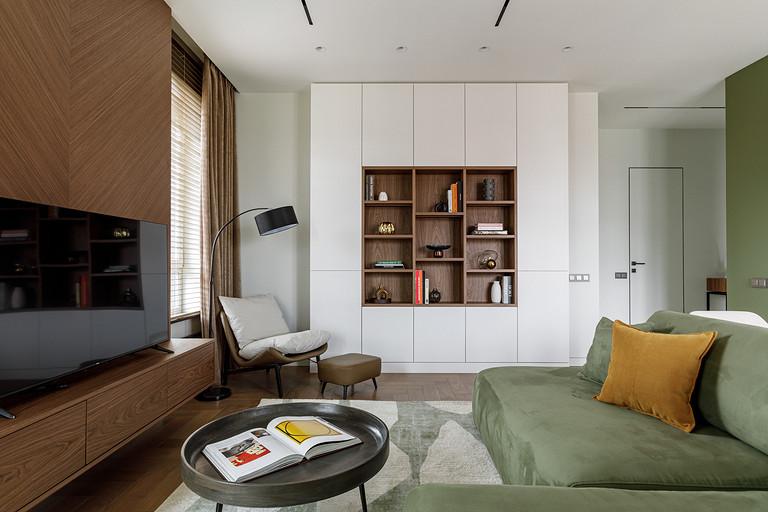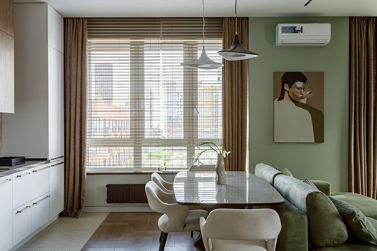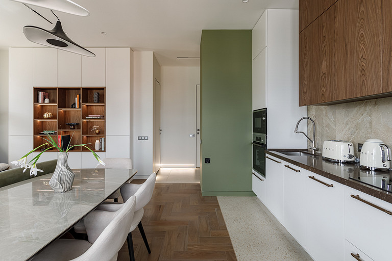 Умиротворяющая цветовая гамма, построенная на натуральном дереве, спокойной зелени и чистом белом, настраивает на полный отдых. В просторной кухне-гостиной мы создали идеальное пространство для жизни: здесь есть и уютный уголок с большим диваном, и солидный каменный стол для дружных застолий, и функциональная кухня. Особую атмосферу поддерживают детали: натуральный камень на поверхностях, панели и мебель из шпона, шелковые ковры и деревянные жалюзи, наполняющие комнату тёплым светом. Даже технологичные элементы, как светодиодная подсветка плинтусов, работают на общую гармонию, мягко подчеркивая геометрию пространства.