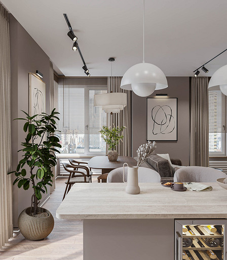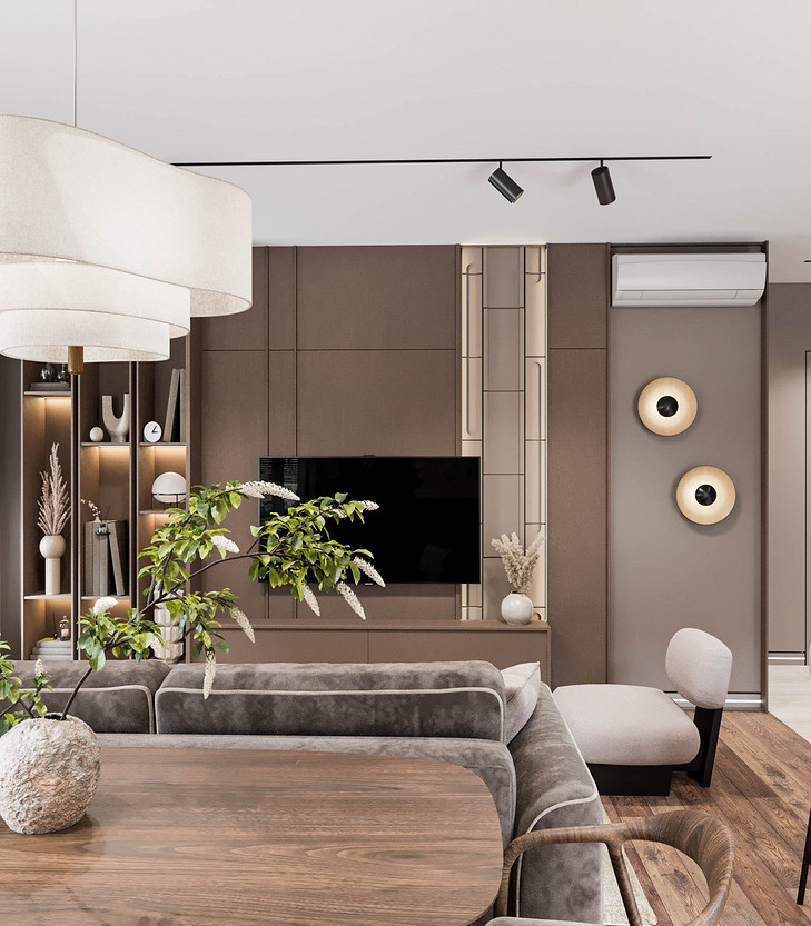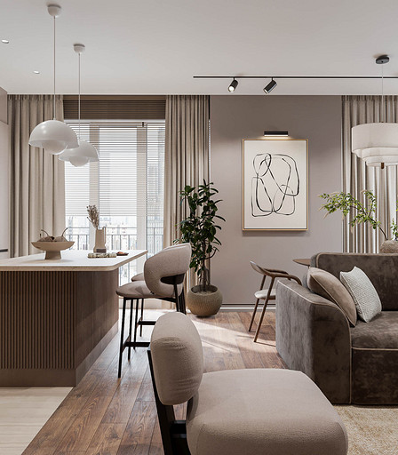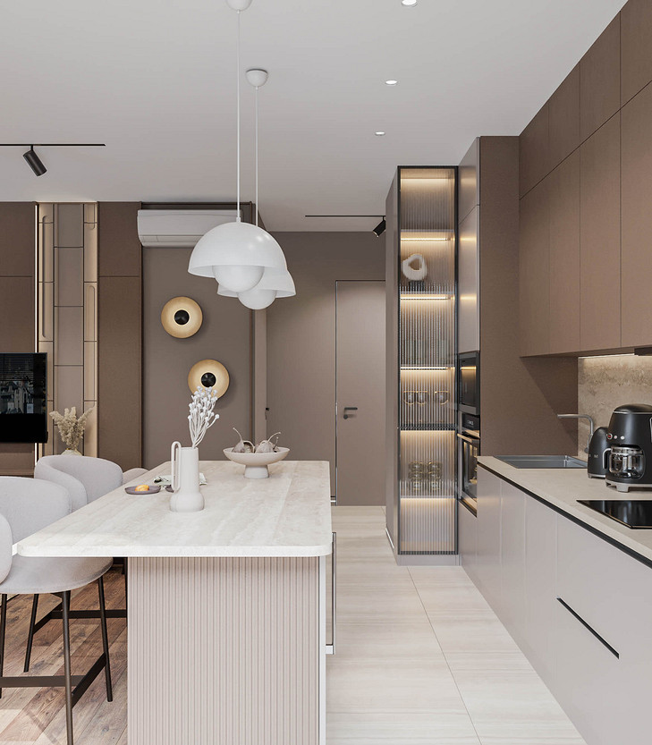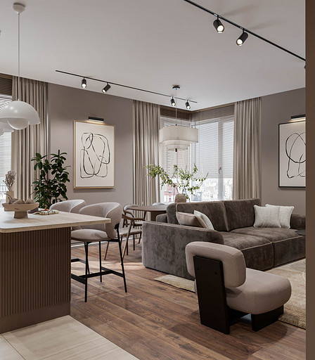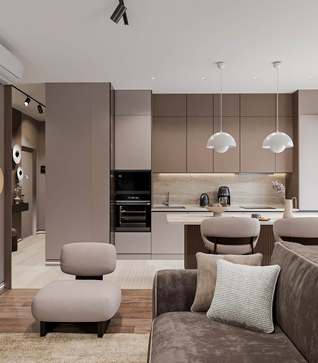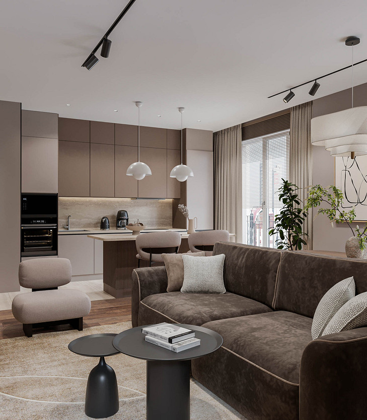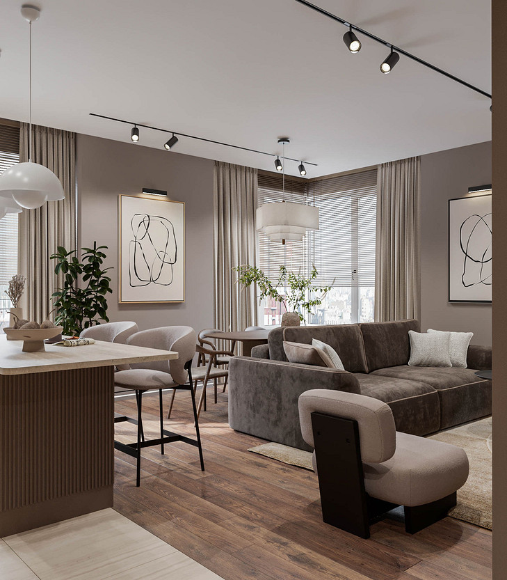 Pantone объявил цветом 2025 года «Мокка-мусс» — оттенок, дарящий ощущение спокойствия и защищенности. Именно эта идея легла в основу нашего проекта. Интерьер, построенный на сочетании кофейных и песочных тонов, обретает по-настоящему обволакивающую атмосферу. Смелым, но оправданным решением стала светлая обивка мебели в дуэте с графичными черными акцентами. Благодаря этому пространство сложилось в идеально сбалансированную композицию, которую уже невозможно представить иной. Динамику вносят стены, где шпонированные панели ритмично чередуются с рельефными гипсовыми, создавая богатую игру света и тени. Пространство квартиры включает кухню-гостиную, прихожую, спальню, гостевую комнату, ванную и компактный санузел. Проект находится на стадии реализации, и мы с нетерпением ждём финальной фотосессии.
