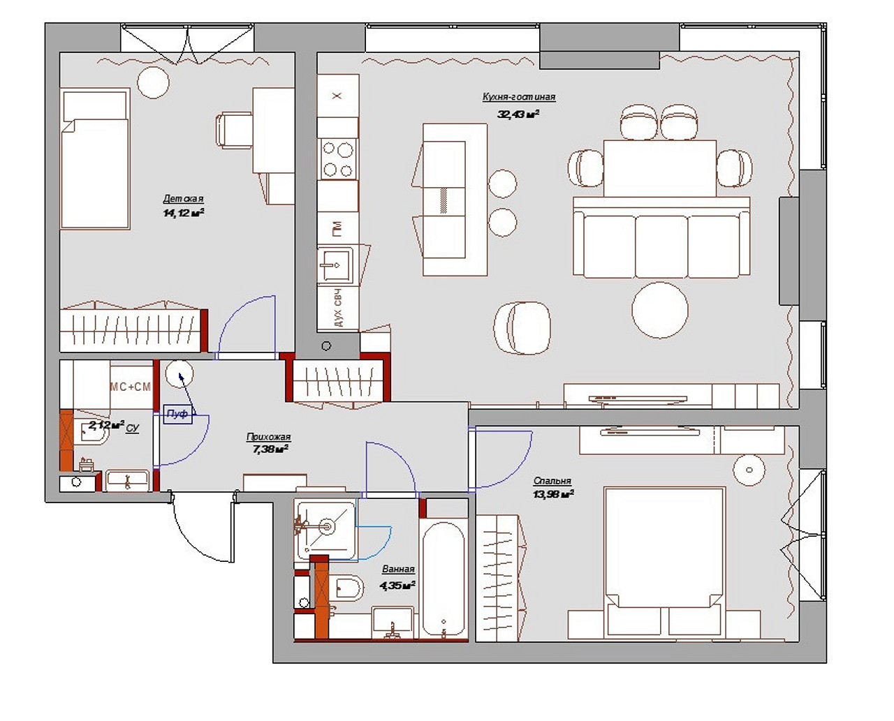 Жилая площадь | 55 м2 | 55 м2 |