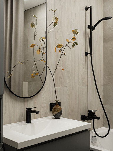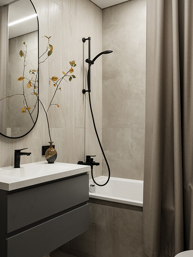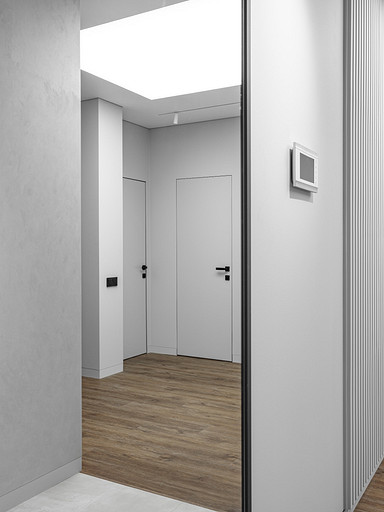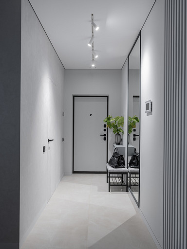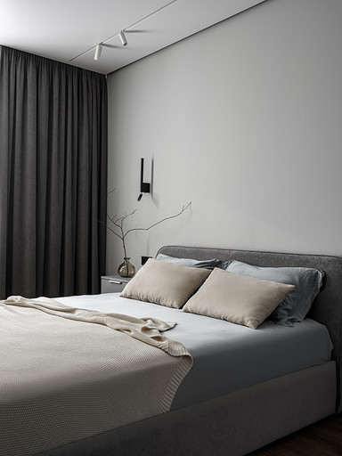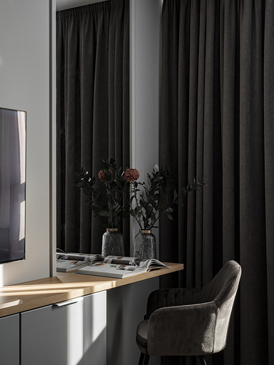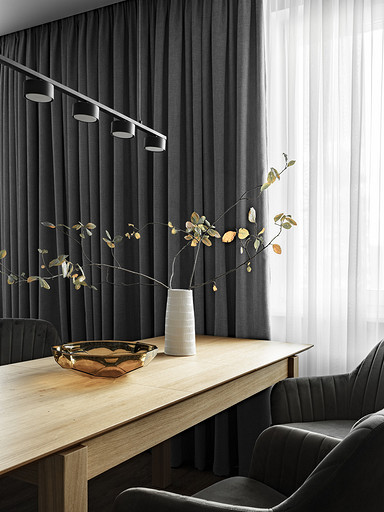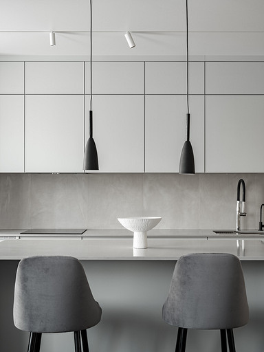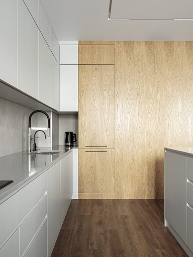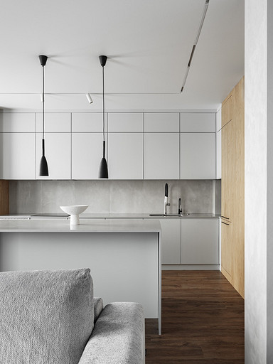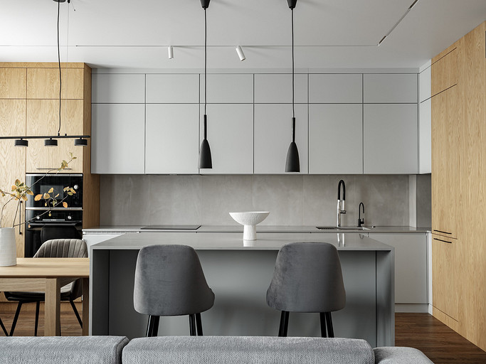 Серый минималистичный интерьер может быть уютным. Объединив кухню и гостиную, мы получили пространство для просмотр фильмов, общения, приготовления пищи и даже работы. К серому цвету присоединились песочные оттенки и текстура дерева.