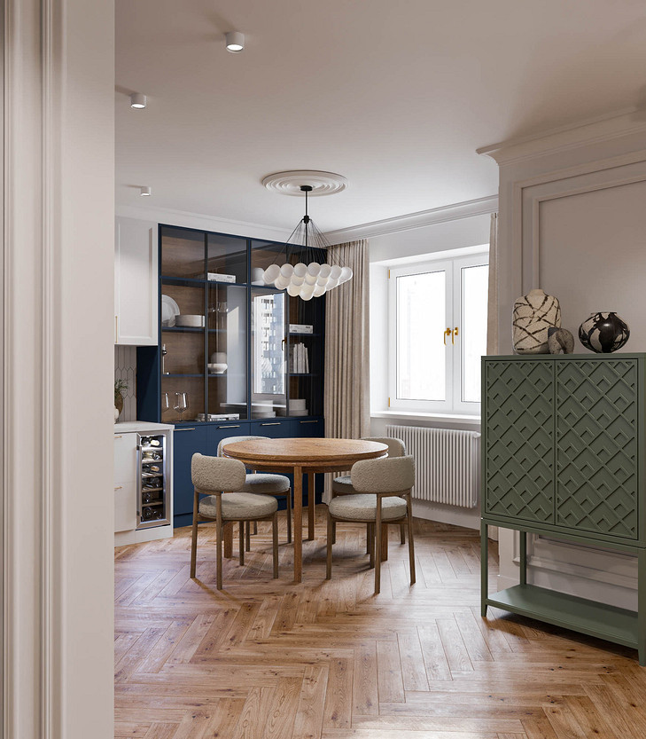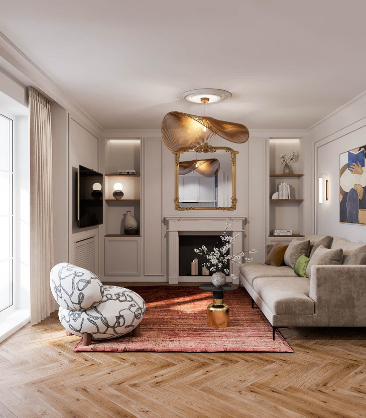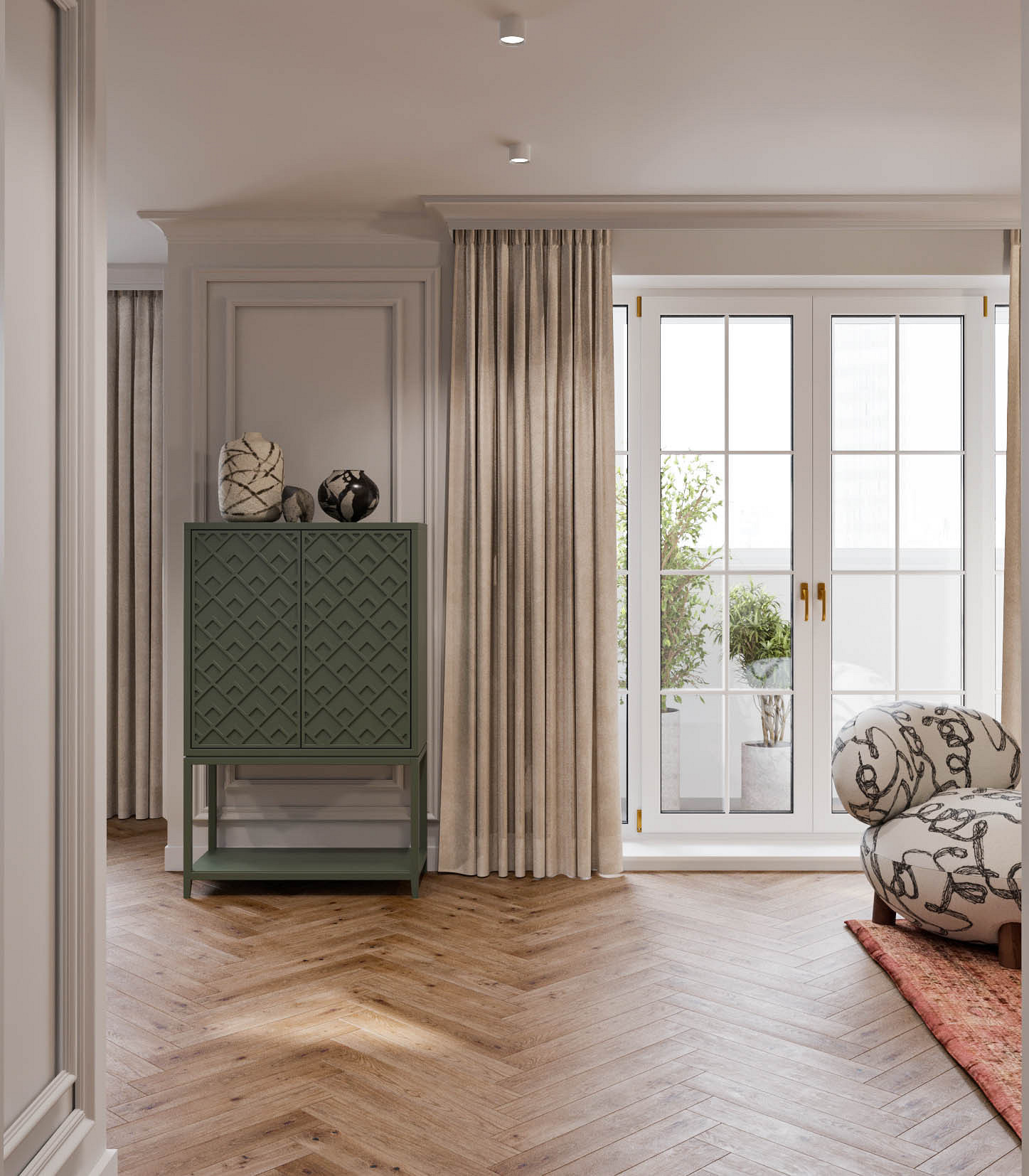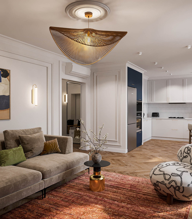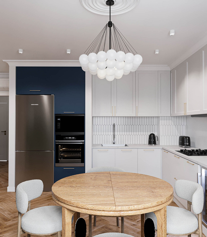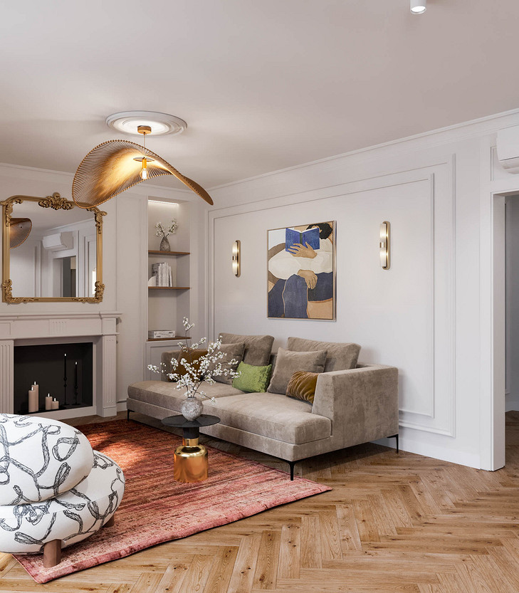 Перед нами стояла сложная, но вдохновляющая задача: воссоздать атмосферу парижского шика в квартире типовой постройки 2000-х годов с низкими потолками (2,5 м), скромными окнами и неудачной перепланировкой. Первым шагом (после согласования) стало устранение простенков под окнами. Это позволило наполнить комнаты максимальным количеством света и установить изящные двери на балкон во всю высоту пола. Далее мы тщательно продумали расстановку мебели в этих больших, но узких помещениях. В гостиной композиционным центром стал камин, расположенный на торцевой стене. На кухне круглый обеденный стол занял место у окна. Особую душу интерьеру придают оригинальные светильники, подобранные с таким чувством, будто их собирали здесь десятилетиями. Отдельной гордостью проекта стала ванная комната: её площадь позволила создать эффектное решение со встроенной ванной, изящно обрамленной аркой. Не забыли мы и о практичности: в комнатах разместились шкафы и комоды, в спальне организована гардеробная, а стиральная машина компактно вписалась в санузел. Проект находится в стадии реализации.