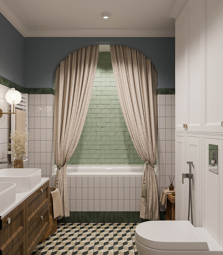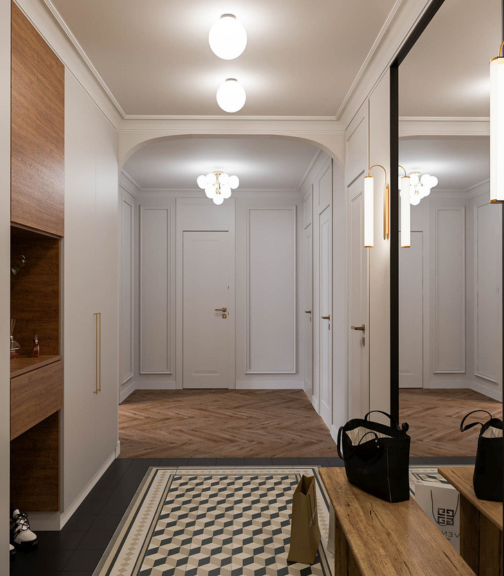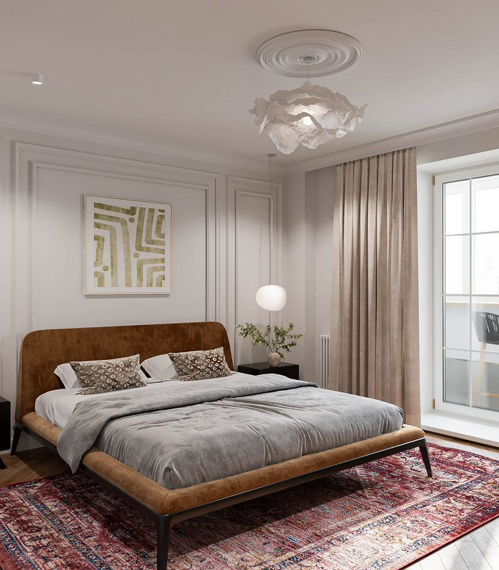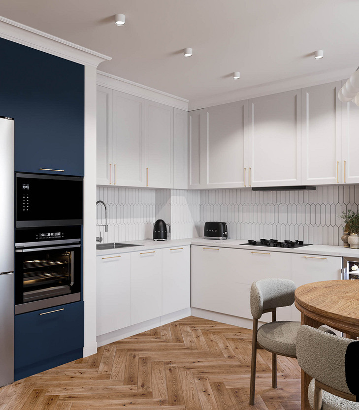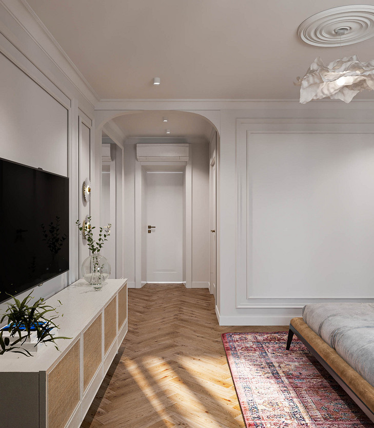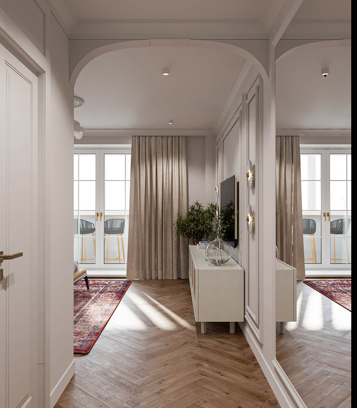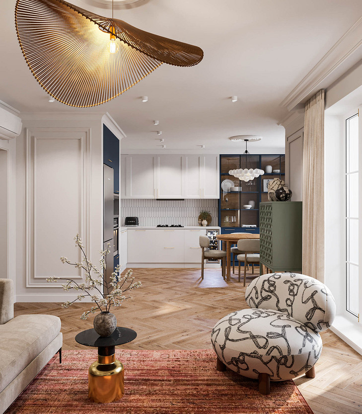 Перед нами стояла сложная, но вдохновляющая задача: воссоздать атмосферу парижского шика в квартире типовой постройки 2000-х годов с низкими потолками (2,5 м), скромными окнами и неудачной перепланировкой. Первым шагом (после согласования) стало устранение простенков под окнами. Это позволило наполнить комнаты максимальным количеством света и установить изящные двери на балкон во всю высоту пола. Далее мы тщательно продумали расстановку мебели в этих больших, но узких помещениях. В гостиной композиционным центром стал камин, расположенный на торцевой стене. На кухне круглый обеденный стол занял место у окна. Особую душу интерьеру придают оригинальные светильники, подобранные с таким чувством, будто их собирали здесь десятилетиями. Отдельной гордостью проекта стала ванная комната: её площадь позволила создать эффектное решение со встроенной ванной, изящно обрамленной аркой. Не забыли мы и о практичности: в комнатах разместились шкафы и комоды, в спальне организована гардеробная, а стиральная машина компактно вписалась в санузел. Проект находится в стадии реализации.