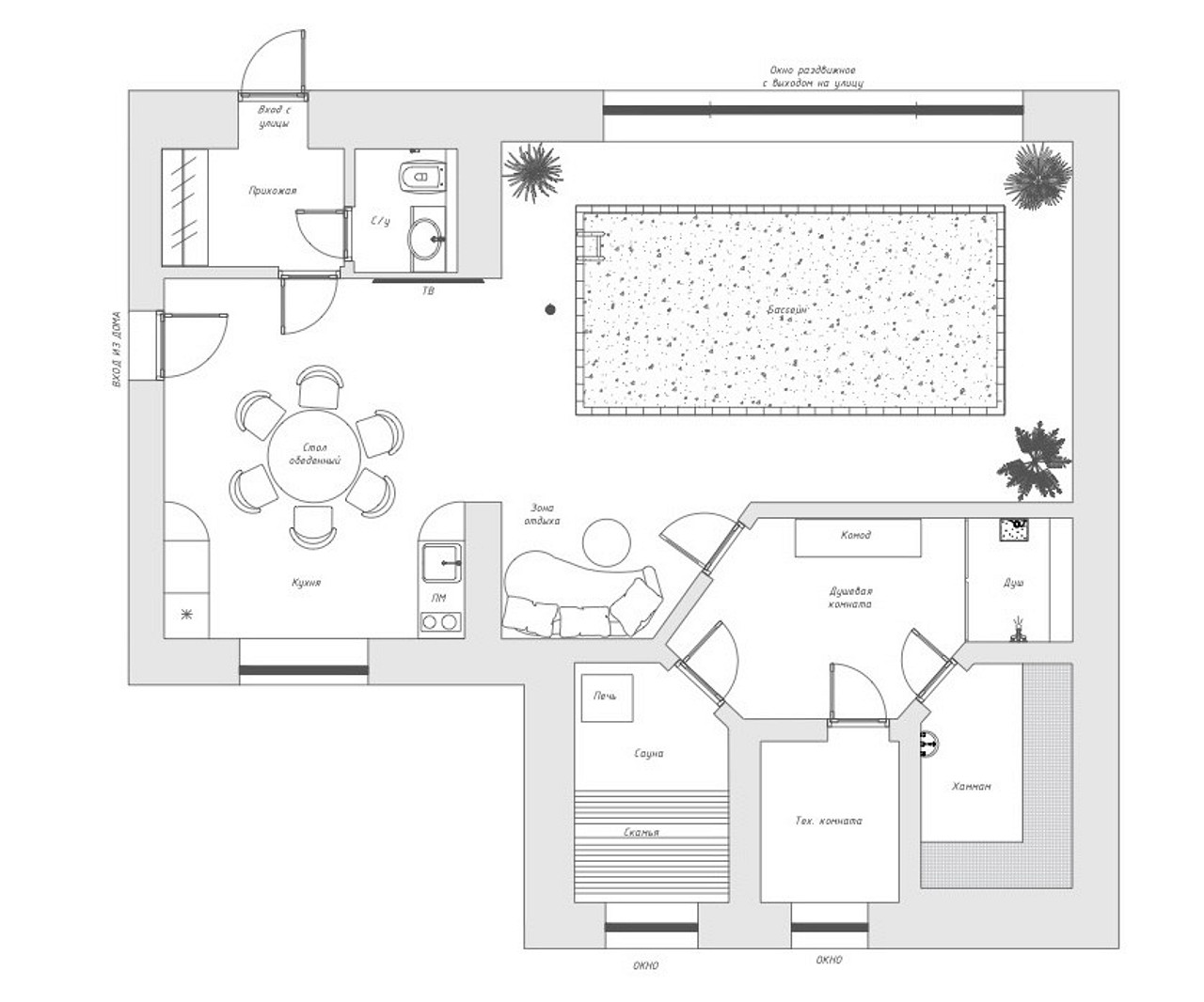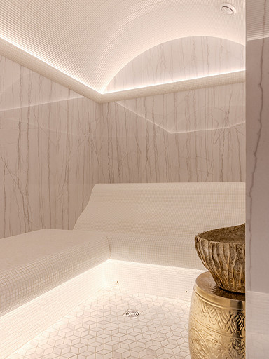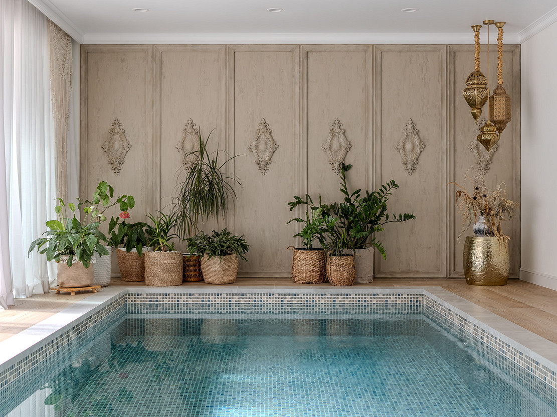 - Пол: керамогранит Navarti Ceramica, борты бассейна — керамогранит Expo White
