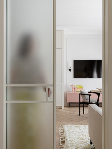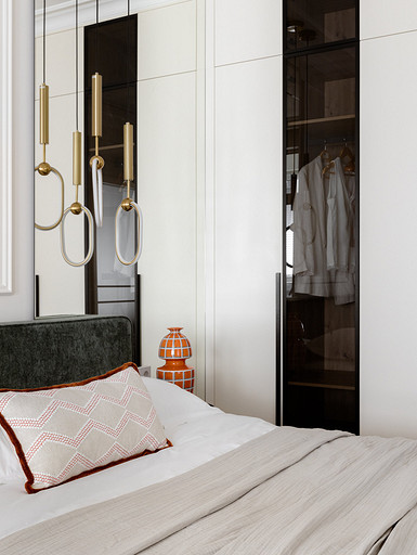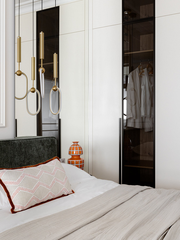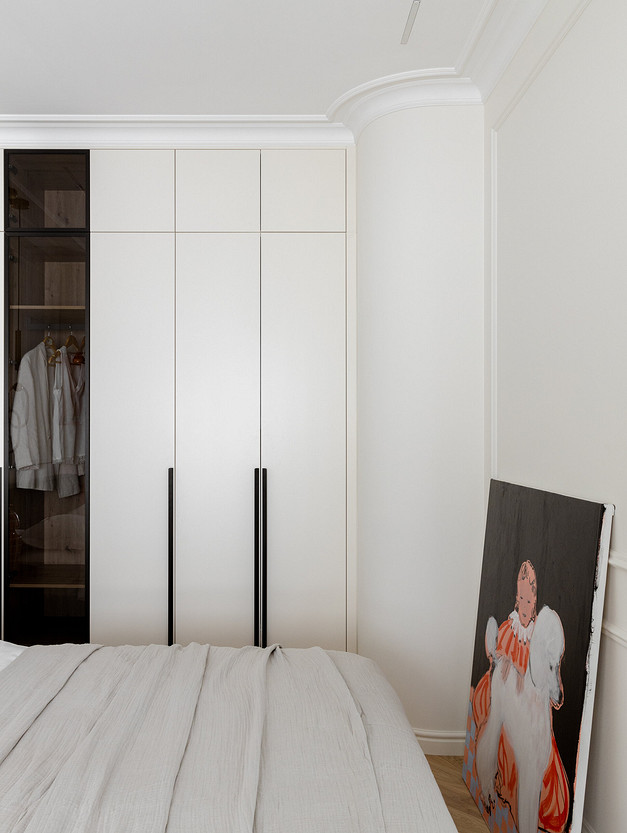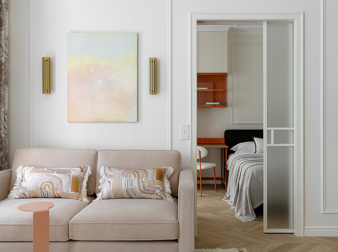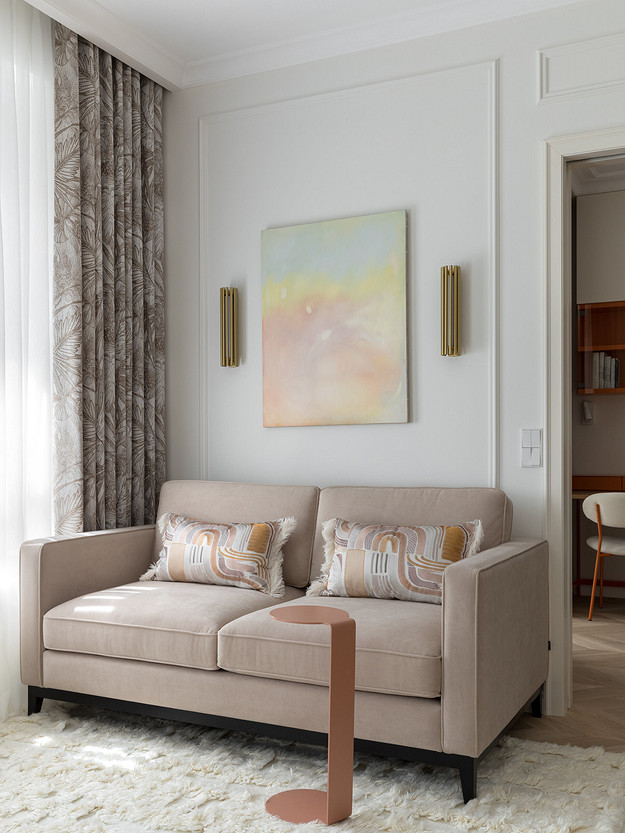 - Картины: над диваном — Маша Богатова, в спальне — Алена Ракова, Exantres (обе — галерея Art Sample), в спальне с пуделем — Александра Маврина