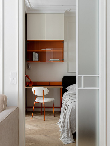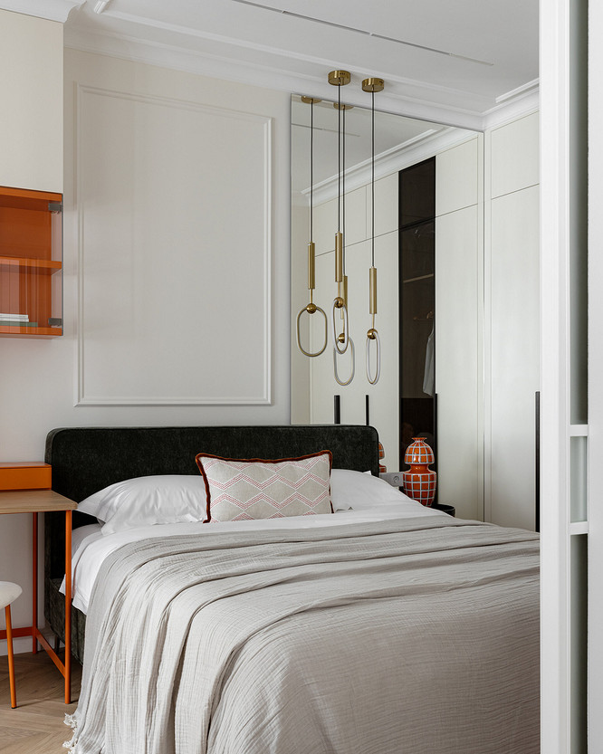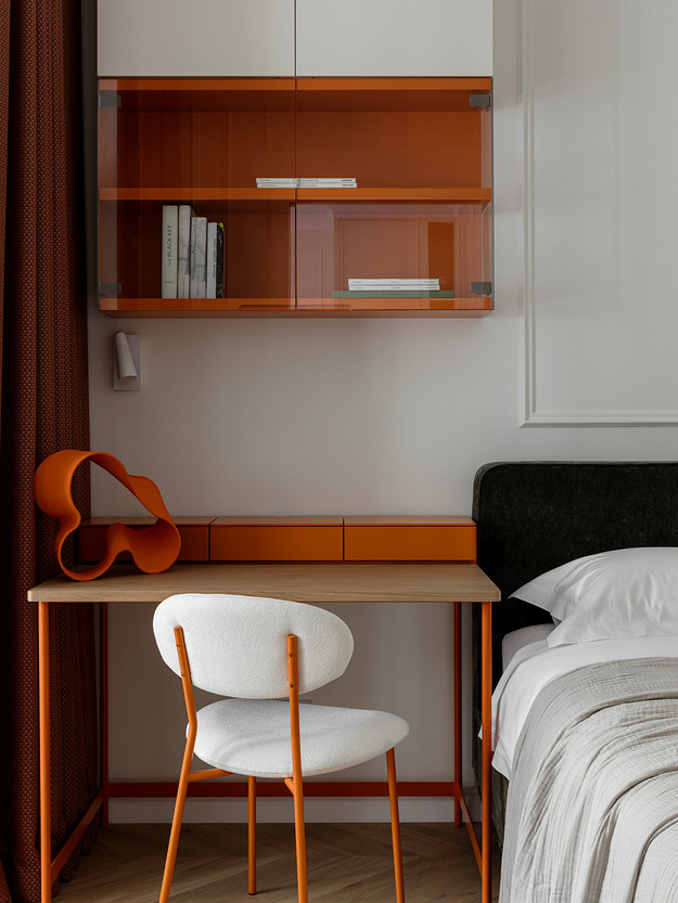 - Мебель: комоды Lulu Space, кровать Comocasa, диван Lavsit, стол и стулья Unika Moblar, стул в спальне Annihaus, тумба в спальне La Redoute, оранжевый столик в гостиной Swog, корпусная мебель Yl Company (на заказ)