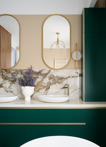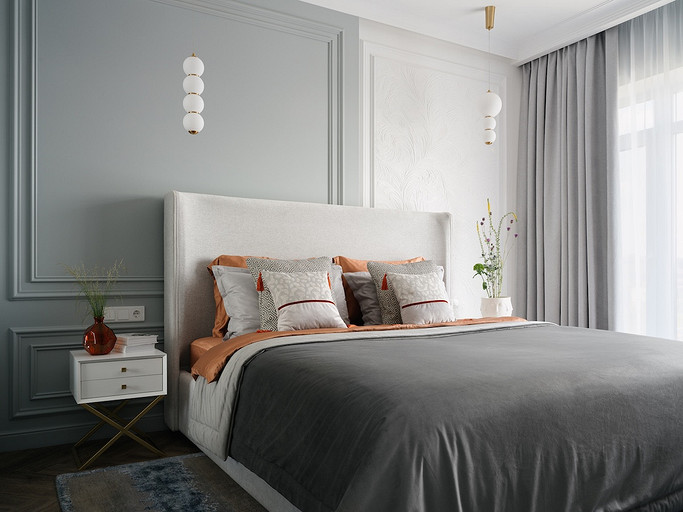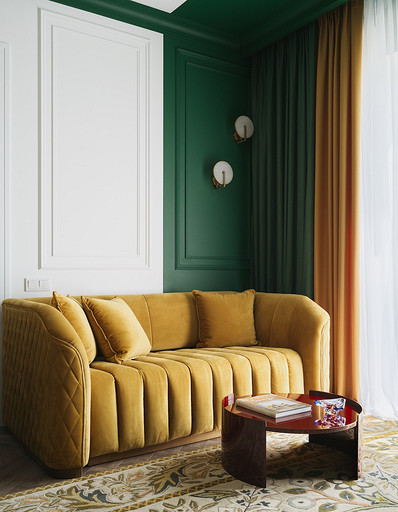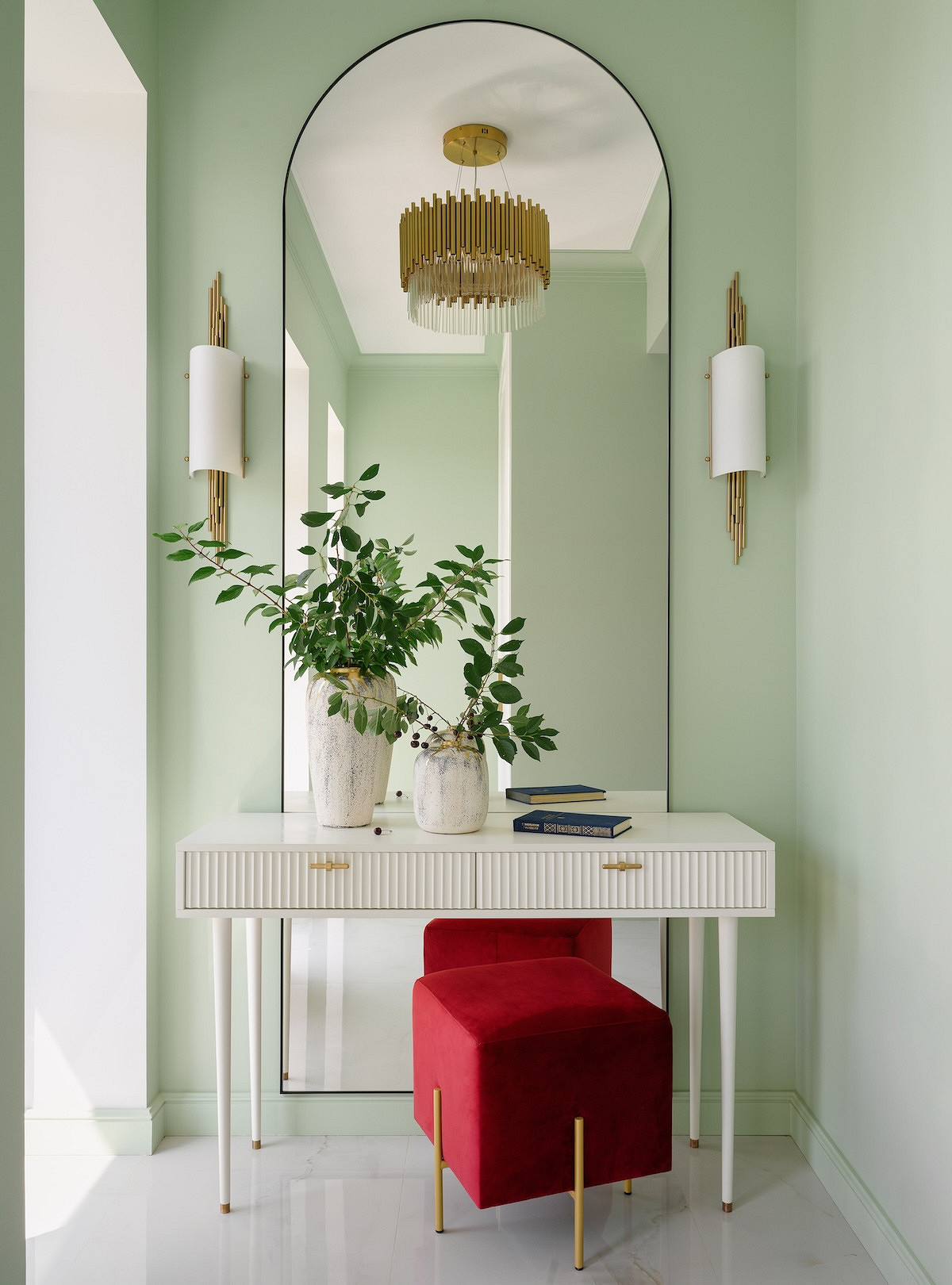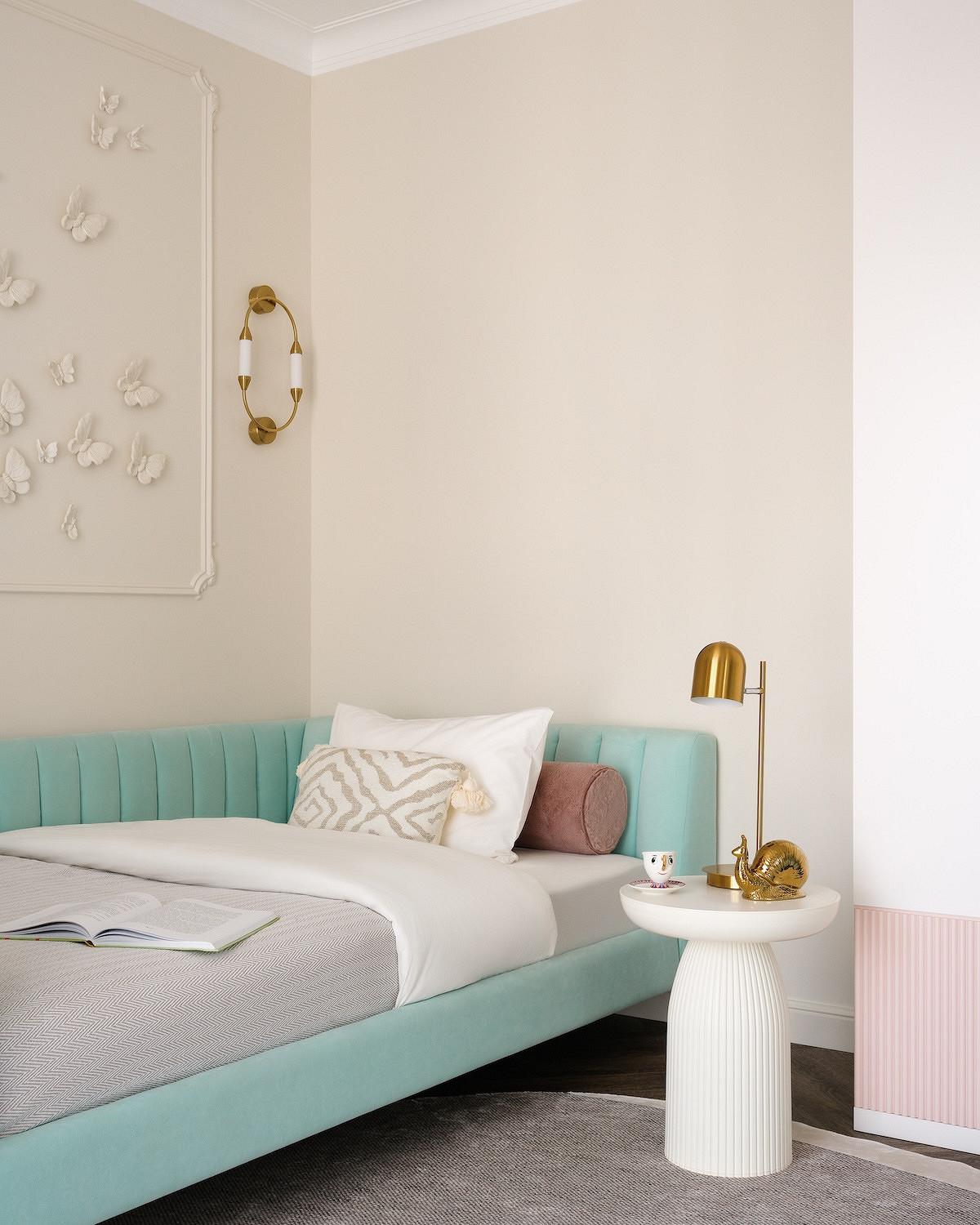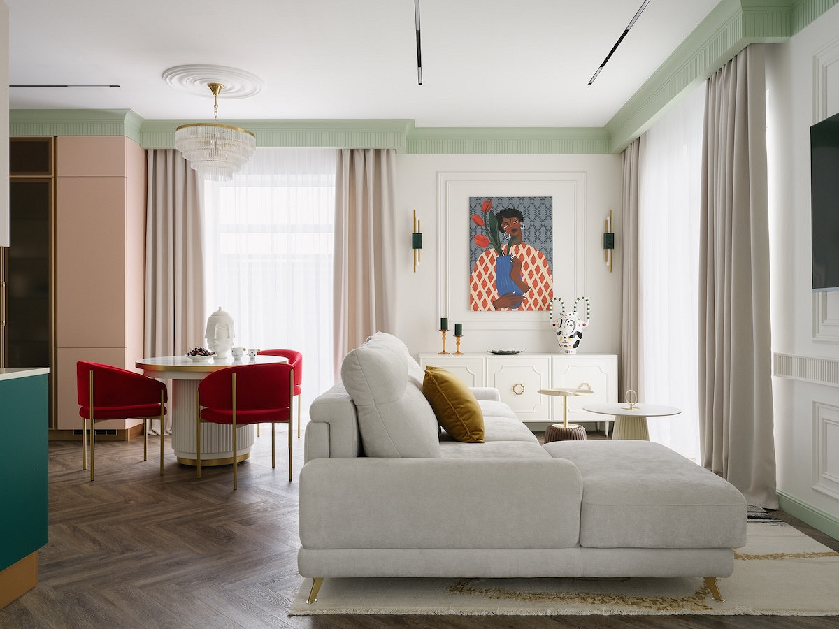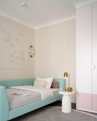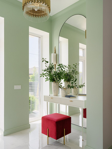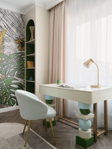 Разные оттенки зеленого, розового, мятный и серый цвет соседствуют в этом интерьере и отлично сочетаются друг с другом. Дизайнеру удалось создать в меру яркое и комфортное пространство для семьи. Читать далее...