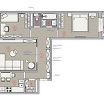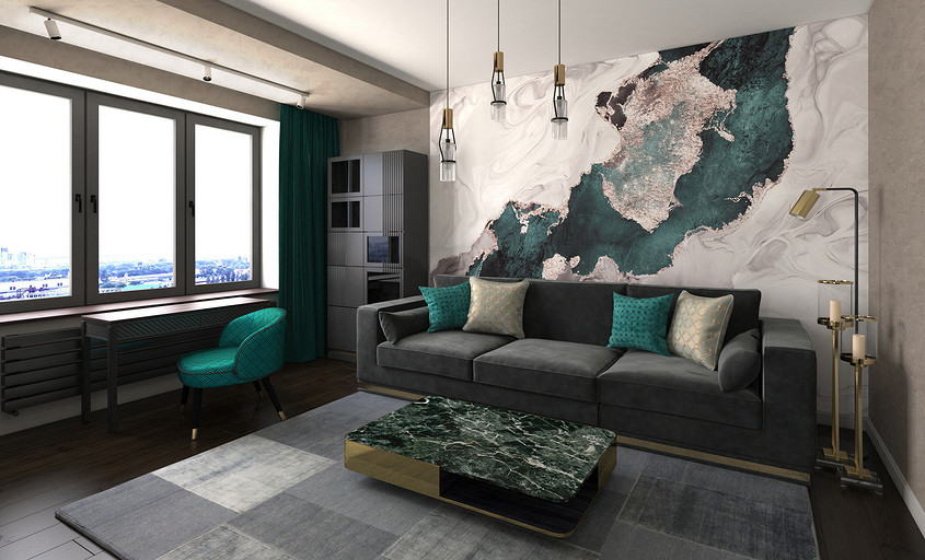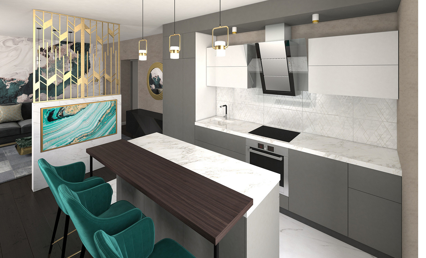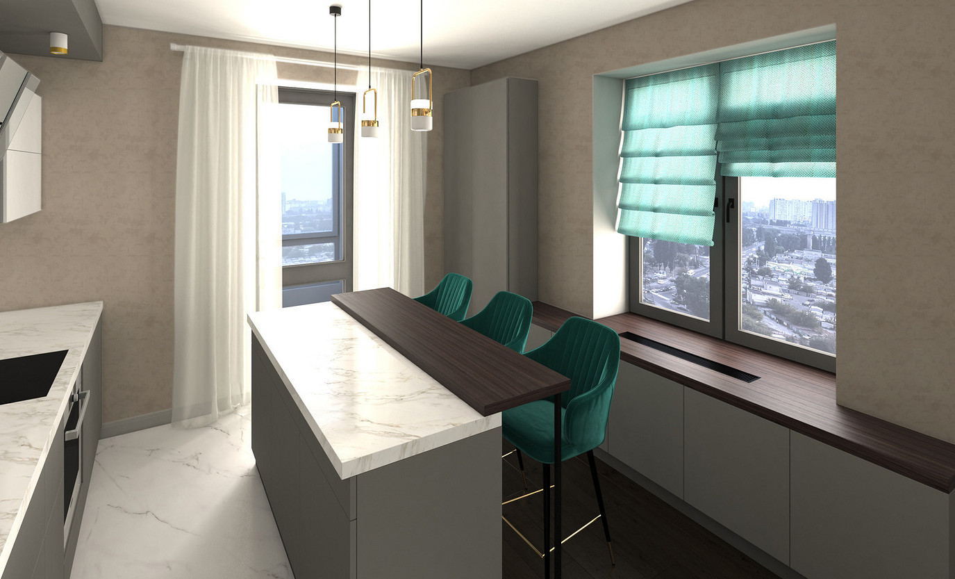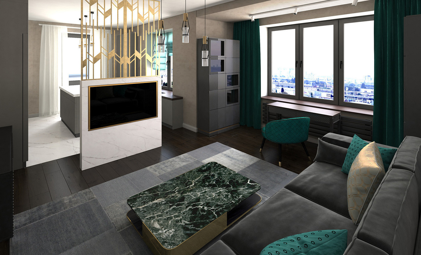 Этот проект кухни-гостиной для женщины — симбиоз природной эстетики и городского шика в современном интерьере. Интерьер выполнен в современном стиле с элементами ар-деко, где функциональность и практичность сочетаются с индивидуальностью и роскошью. Основная идея проекта – создать оазис спокойствия и вдохновения в динамичной городской среде, используя природные мотивы и материалы. Цветовые акценты отражают гармонию теплого золотого сияния и свежести весенних оттенков, привнося в дом ощущение тепла и благополучия, а сочетание глубокого изумрудно-зеленого оттенка с нейтральными серыми и бежевыми тонами создает драматичный и притягивающий взгляд образ. Для баланса яркой акцентной стены остальные поверхности выполнены в спокойных, нейтральных тонах с использованием матовой фактурной штукатурки, что подчеркивает контраст между гладким глянцем мрамора и бархатистой поверхностью стен. Плотные изумрудные шторы и ковер с геометрическим рисунком добавляют интерьеру тактильности, комфорта и завершенности. В проекте была выполнена перепланировка: в гостиной окно выходит на север, и в помещении довольно темно даже днем, поэтому было решено объединить гостиную с кухней, разграничив их декоративным экраном, на котором расположился телевизор. Под окном расположили рабочий стол для шитья — любимое хобби хозяйки. Длинные ткани можно также класть на подоконник, выполненный в том же цвете и на той же высоте и таким образом исполняющий роль дополнительной столешницы. Санузел был перемещен за счет коридора, а в спальне появилась гардеробная