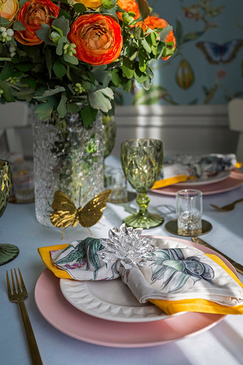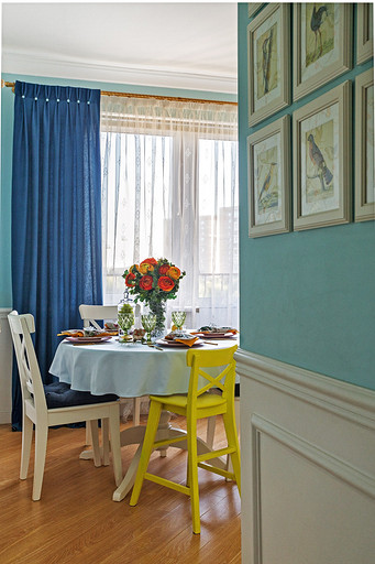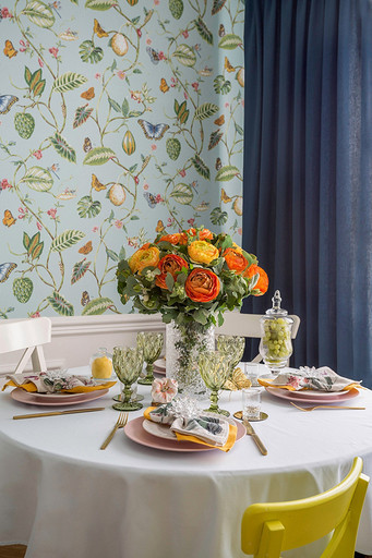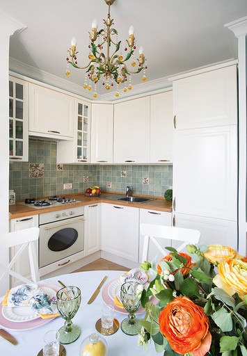Жизнерадостный интерьер кухни-столовой: обои, люстра и фартук с летними мотивами