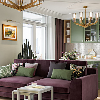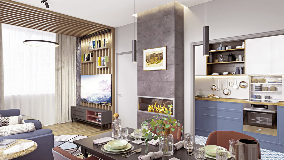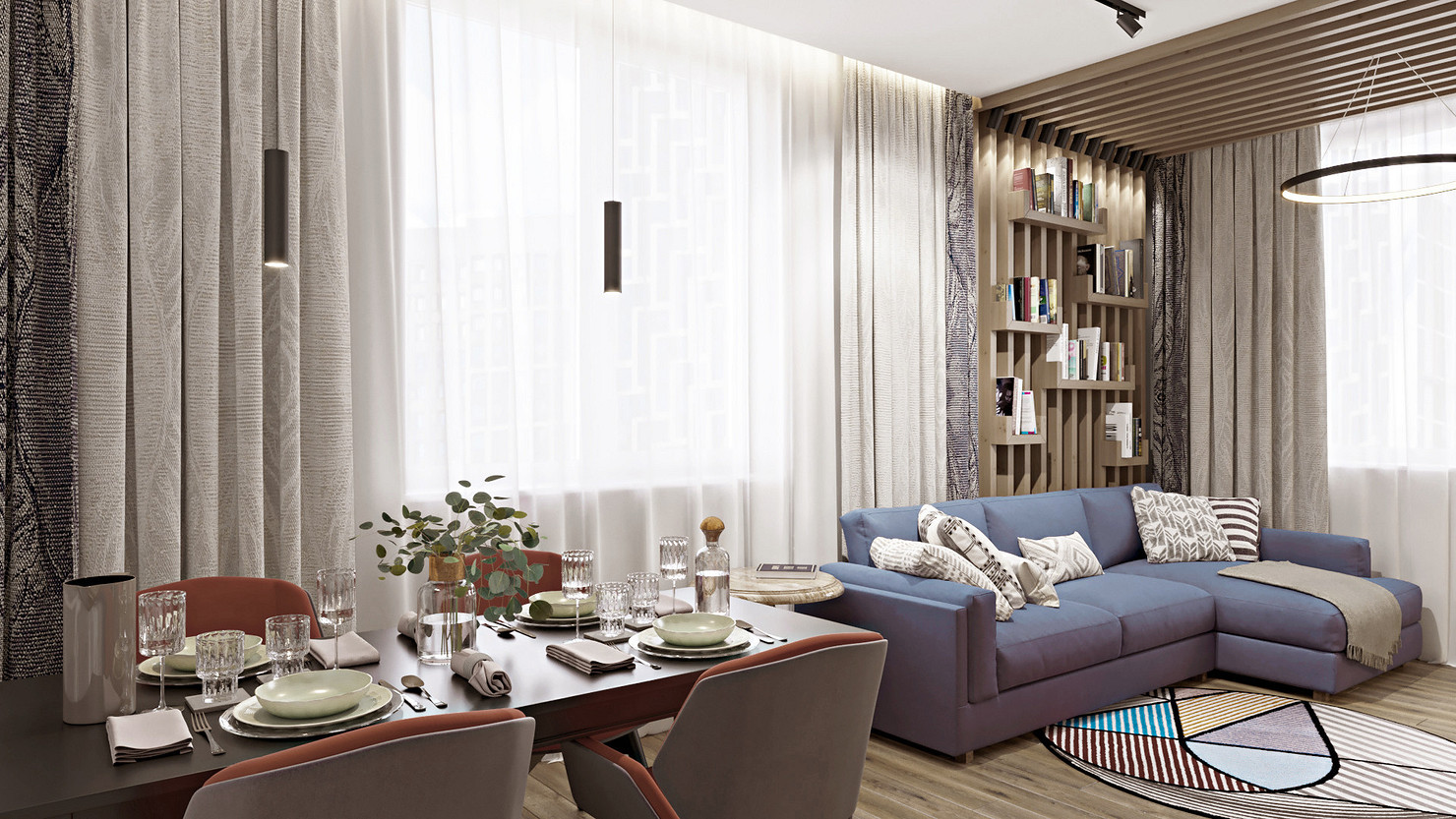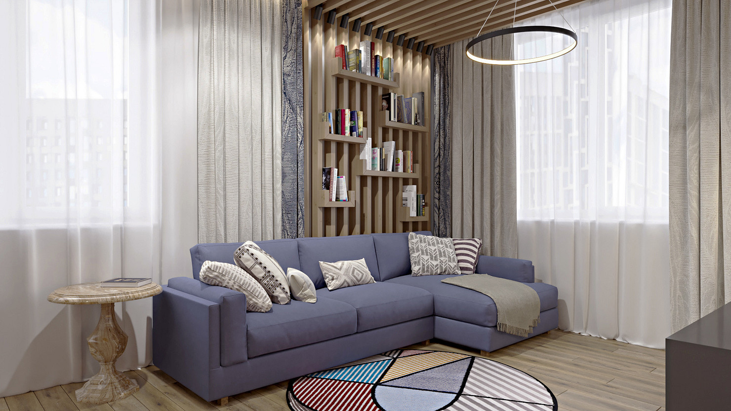 Пространство гостиной комнаты является проходным, можно пройти на кухню или в приватную зону (спальная комната с гардеробной)