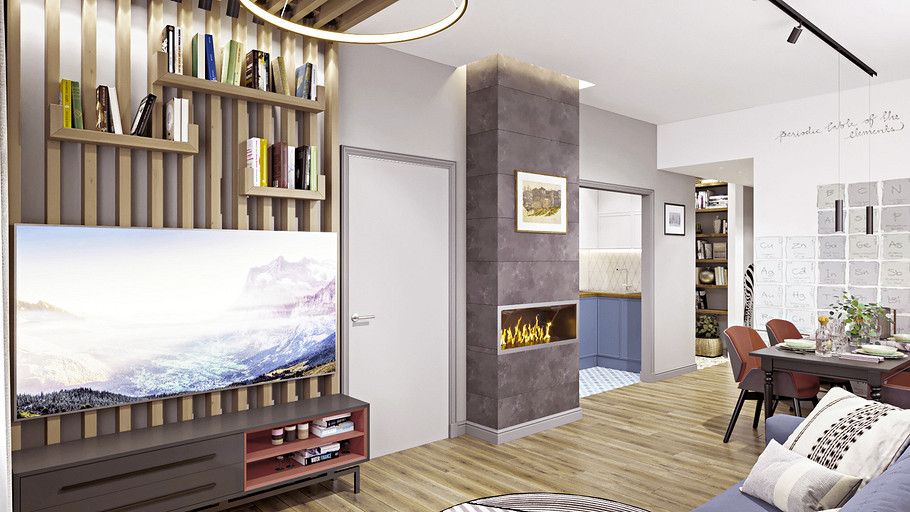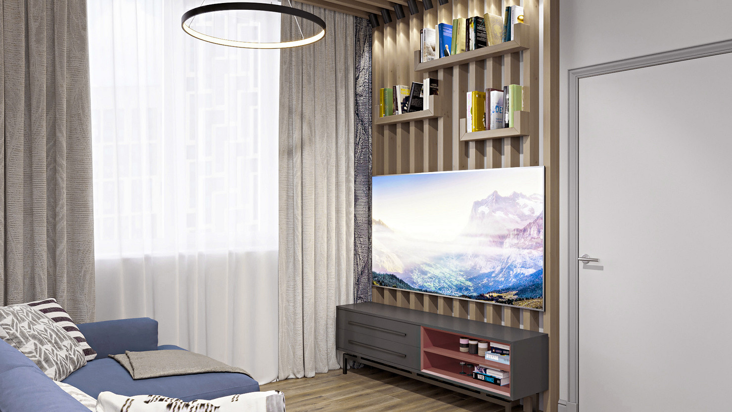 ТВ зона оригинально оформлена деревянными рейками с небольшими полочками для книг, переходящими с потолка на стены