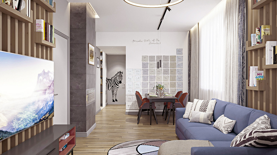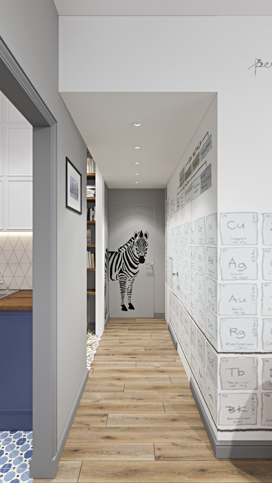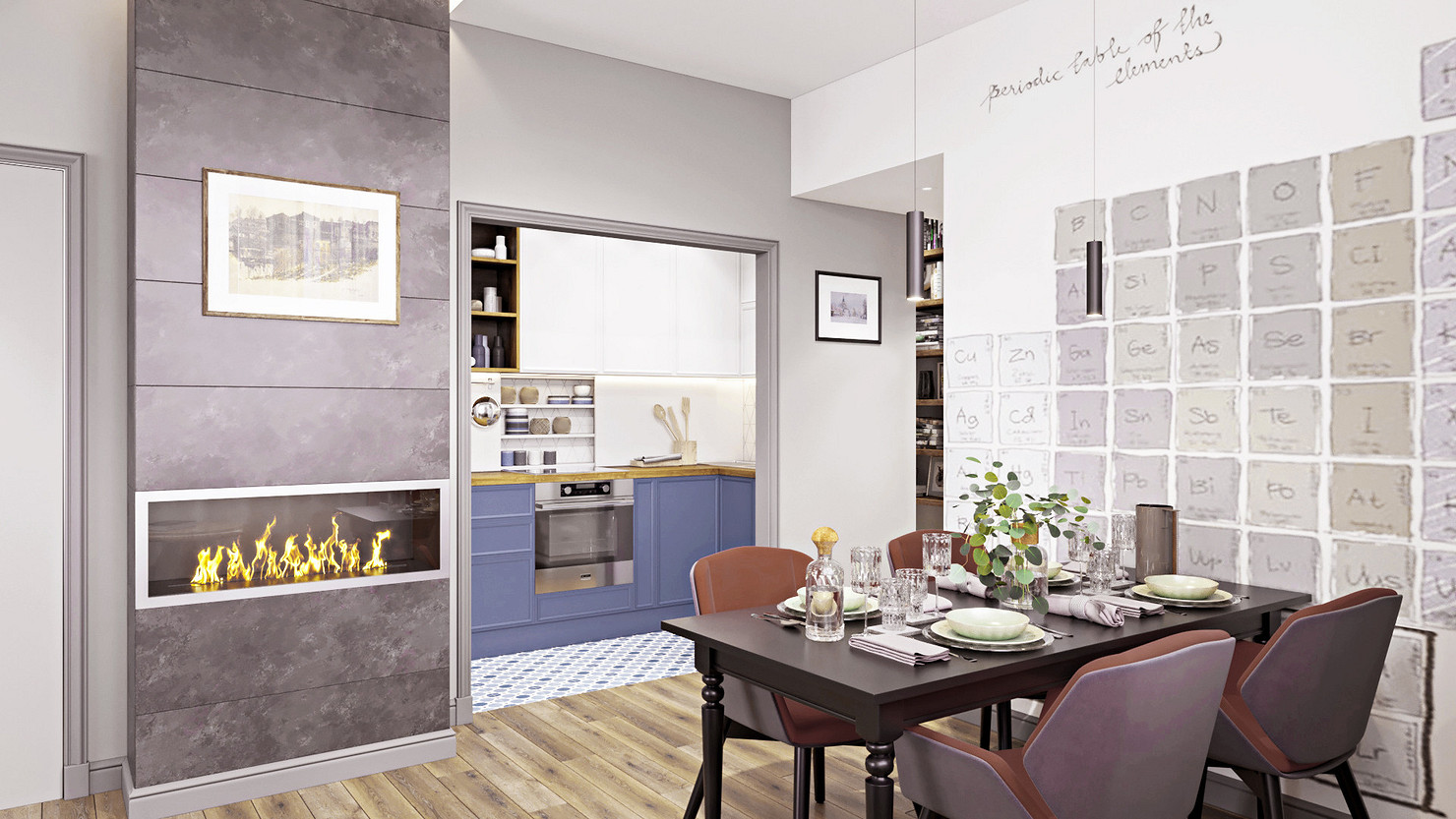 Игривый и смелый подход к дизайну этого интерьера был основополагающим. Таблица Менделеева расположена на стенах ванной комнаты и наполнена особым смыслом для хозяев квартиры