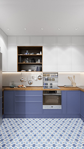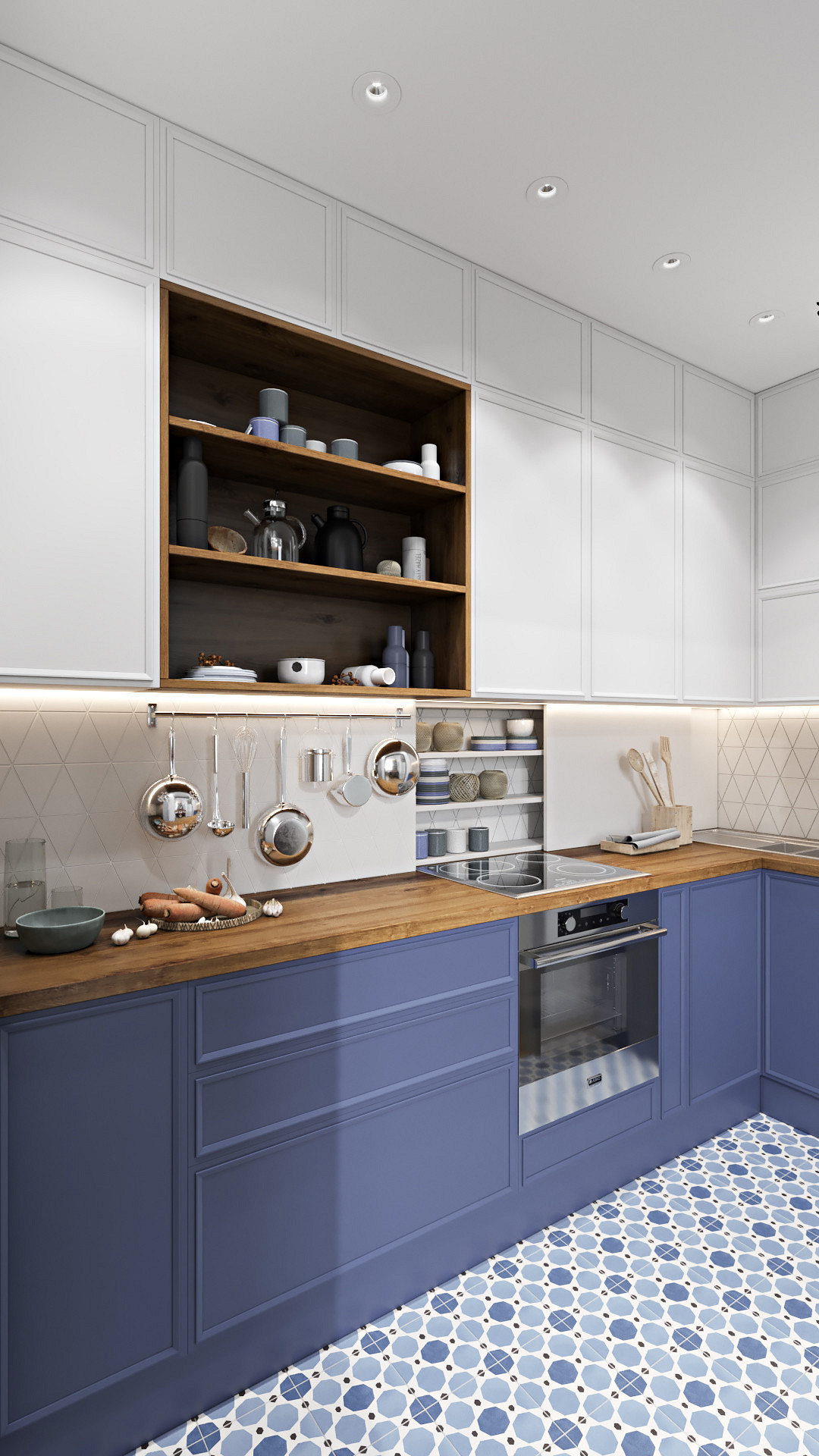 В кухонном гарнитуре есть открытые полки для удобства использования и визуального эффекта