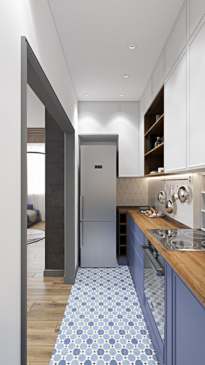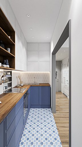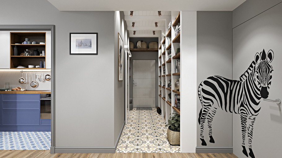 Кухня, прихожая и коридор зонированы только отделочными материалами — это открытое планировочное решение без дверей и проемов