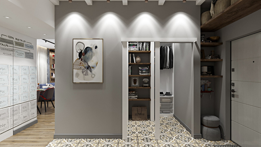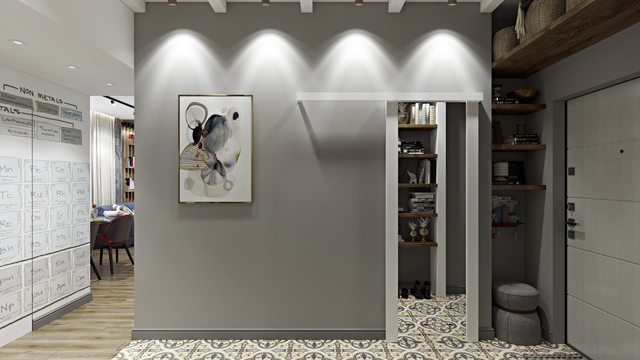 Зеркало в прихожей комнате — обязательный предмет. В нашем случае зеркало выполняет еще одну важную роль — оно встроено в сдвижную дверь и закрывает вход в гардеробную
