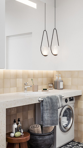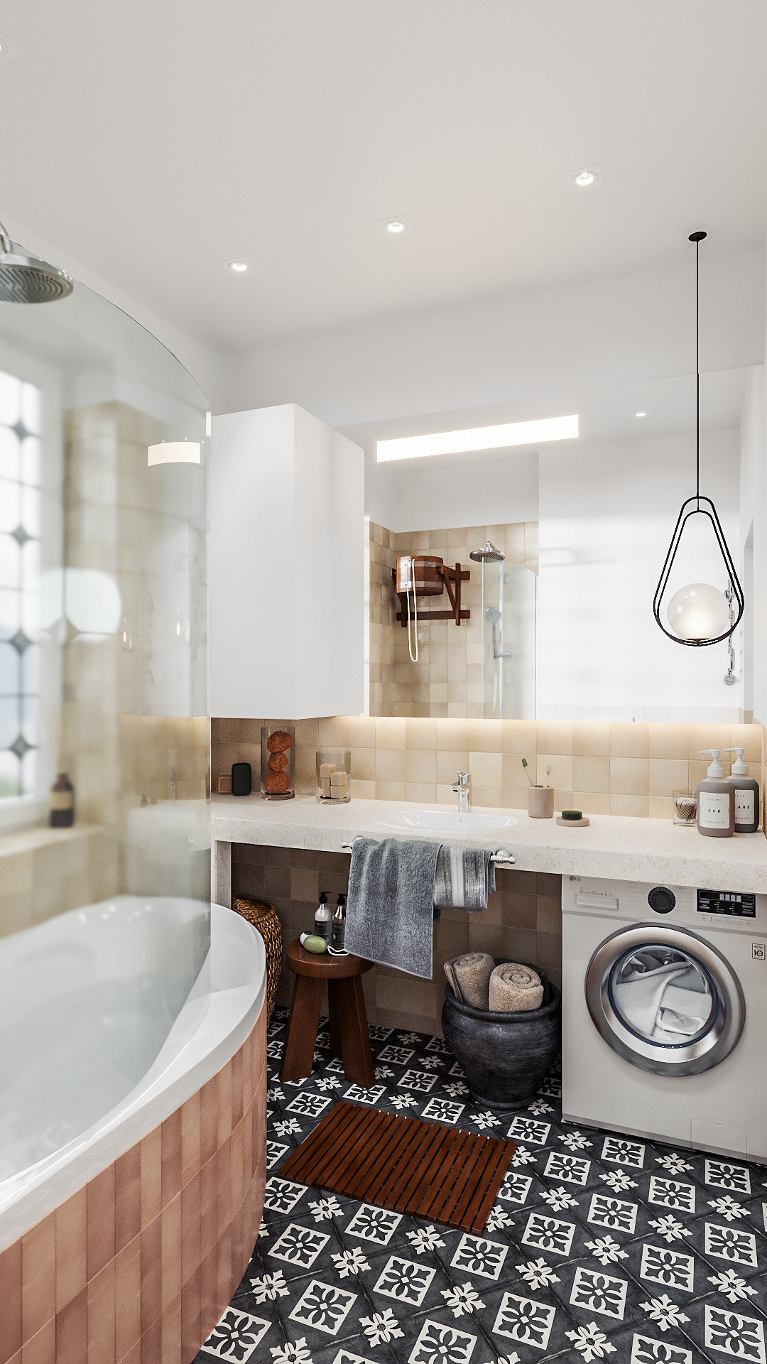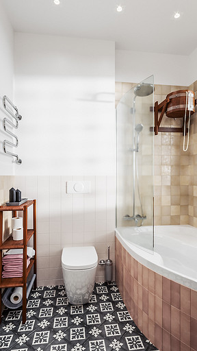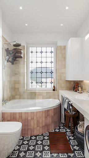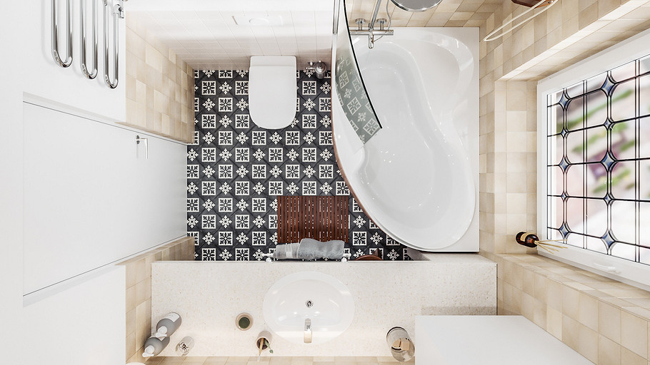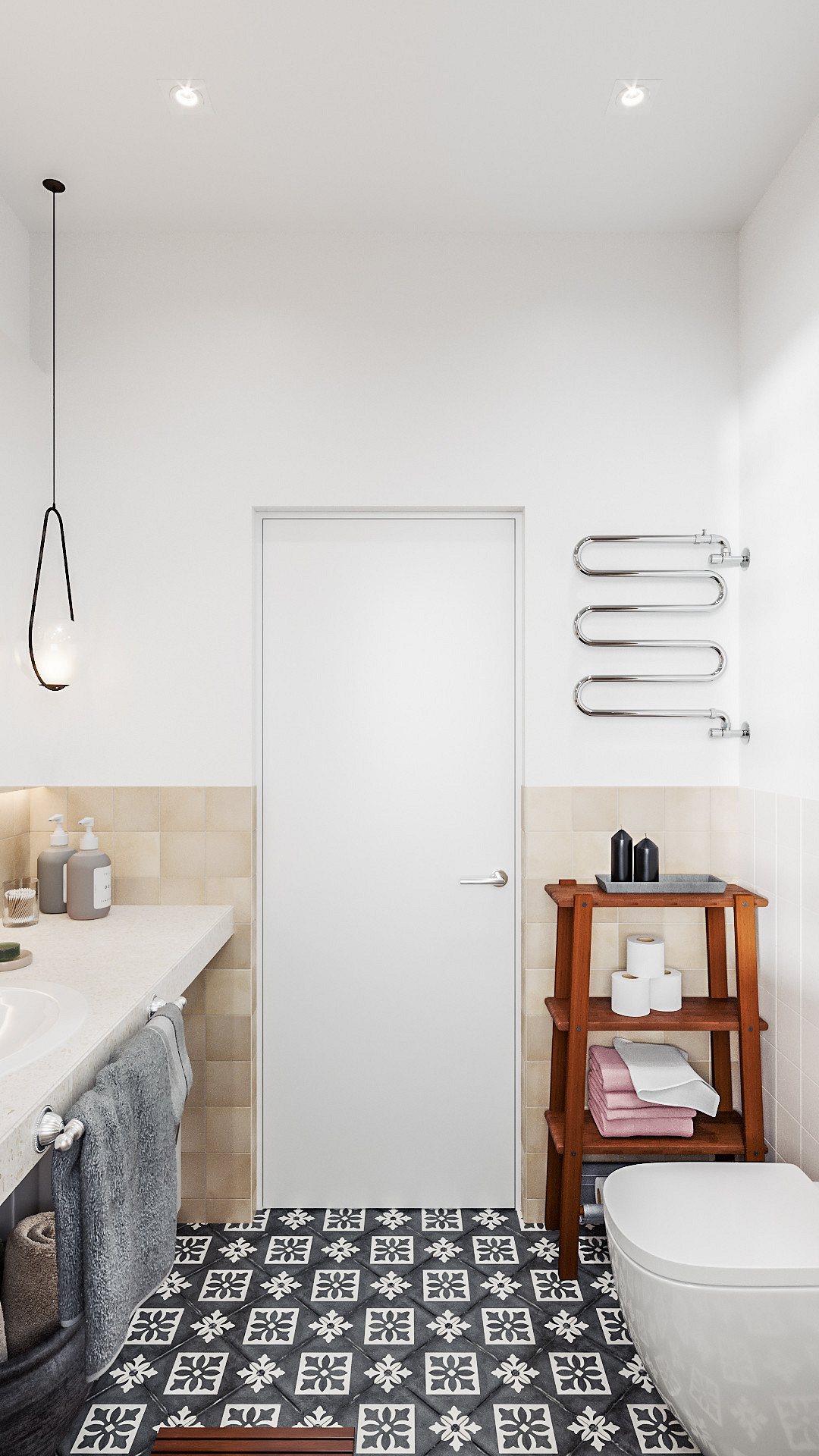 Черный низ и белый верх — классическое сочетание совсем не в классическом интерьере. Бежевый оттенок и рисунок на белой плитке создают особое настроение — теплое и жизнерадостное