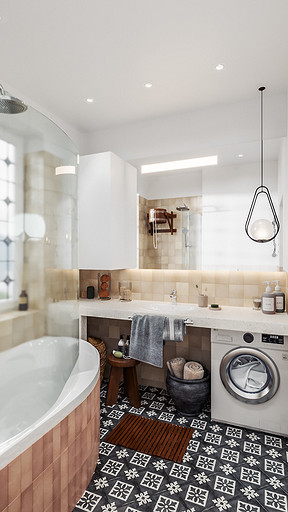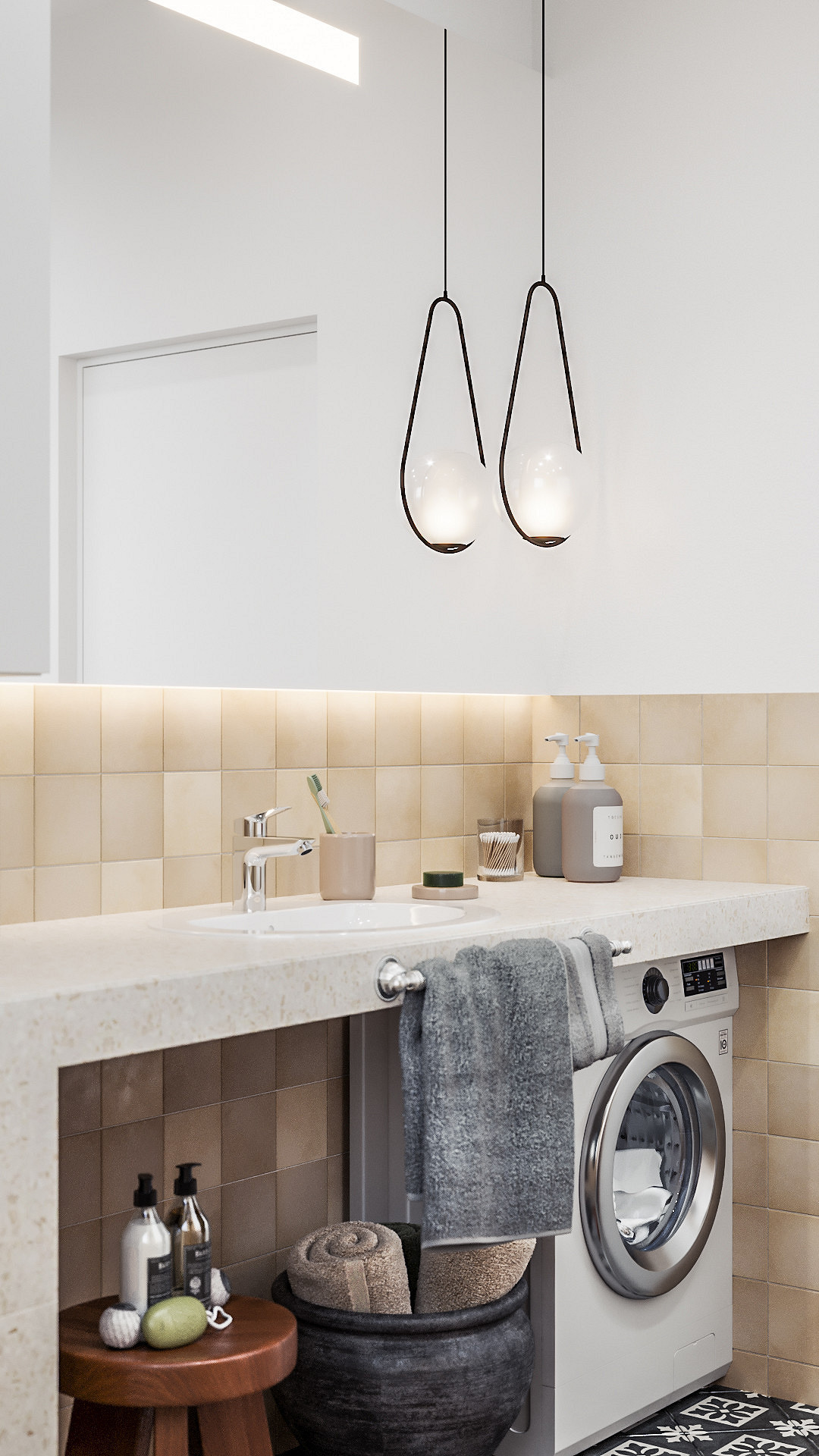 Такое планировочное решение позволило нам разместить вместительную столешницу, под которой разместилась стиральная машинка и табурет. А также такая форма ванны позволяет с комфортом принимать душ и теплую ванну