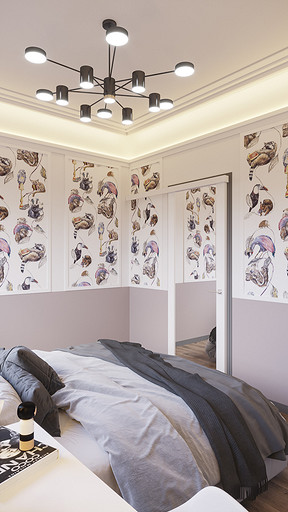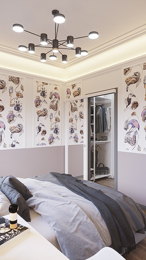 Палитра была выбрана на основе обоев, которые задали направление. Спокойная гамма в гармонии с ППУ декором и световыми приемами образуют интересное и комфортное пространство