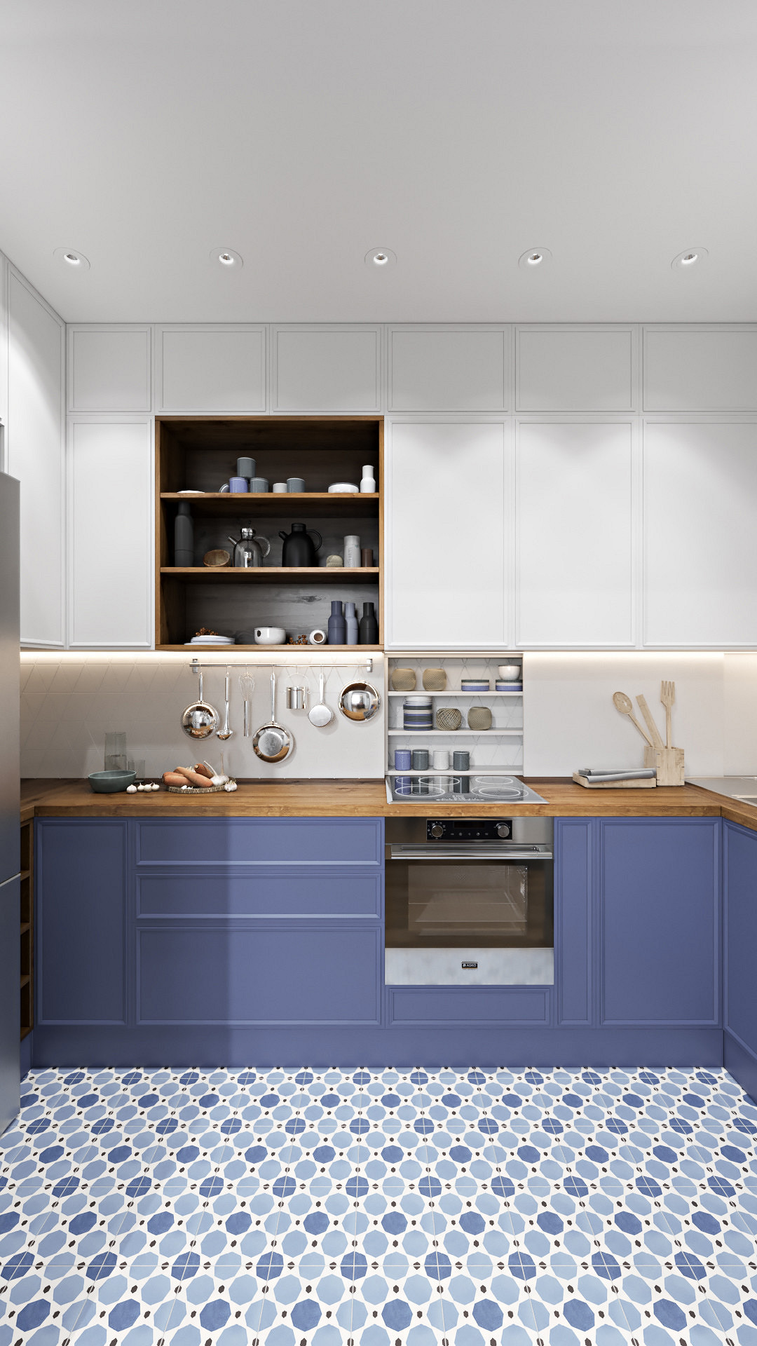 Я люблю парные по цвету текстуры и предметы мебели. Тем более, что сейчас палитра кухонного гарнитура не ограничена. В данном случае оттенок нижнего уровня кухонного гарнитура подобран к напольной плитки