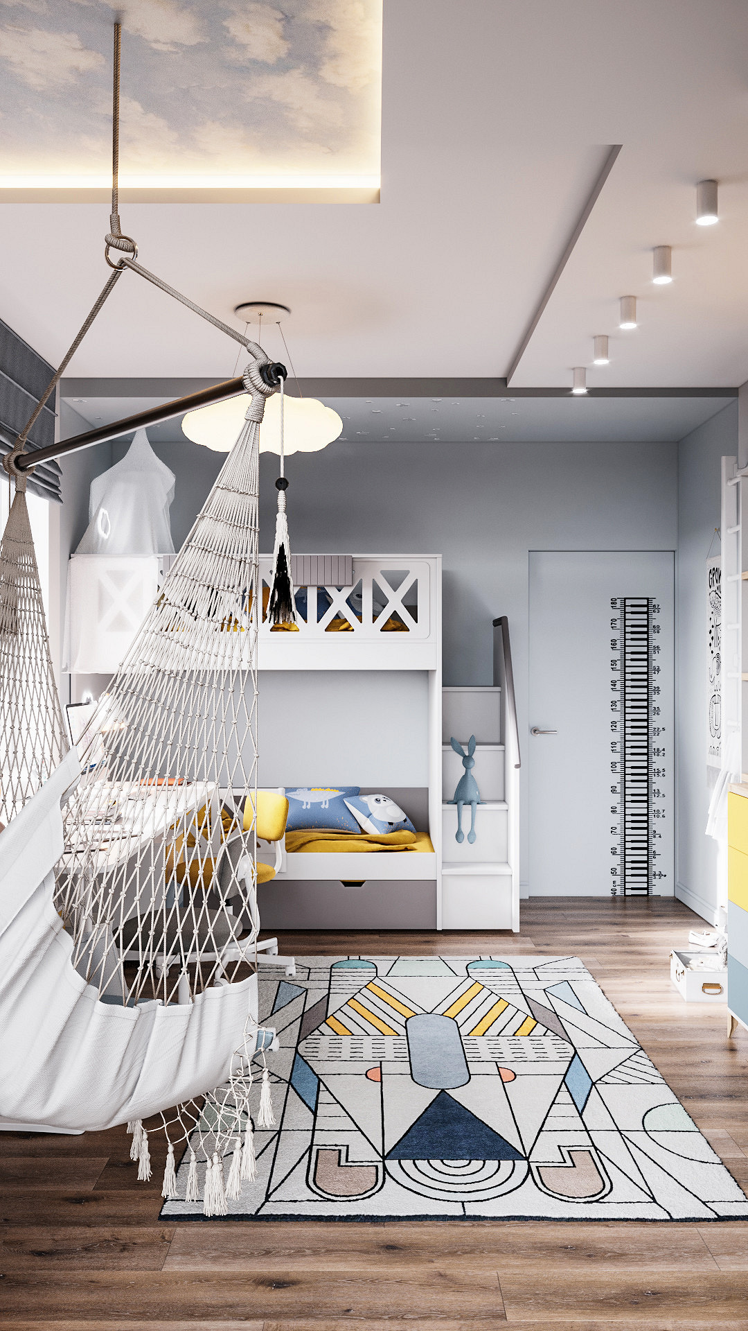 Зону гамака венчает небесный потолок с теплой подсветкой, а спальная зона окрашена в синеватый оттенок стен с фосфорными наклейками на потолке, в виде звезд и созвездий