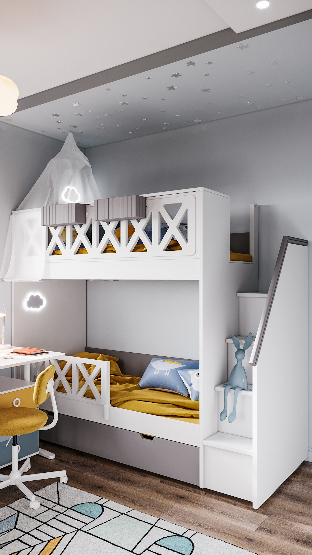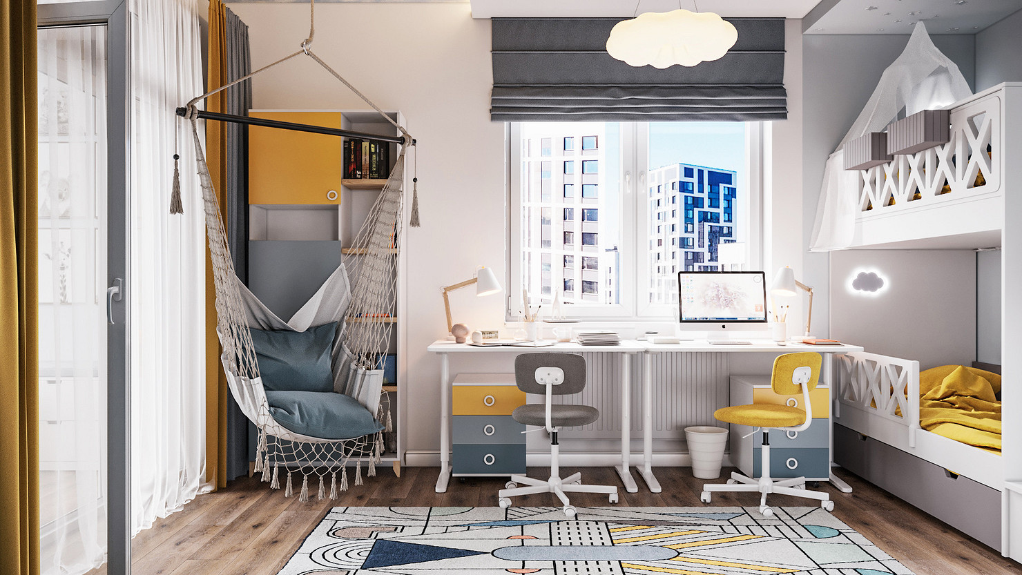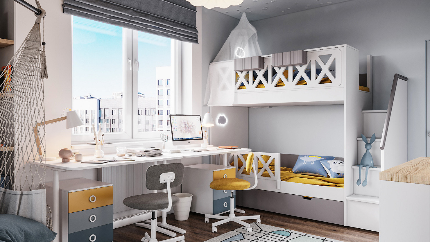 Детская комната была продумана для двоих детей, поэтому вся основная мебель была продублирована