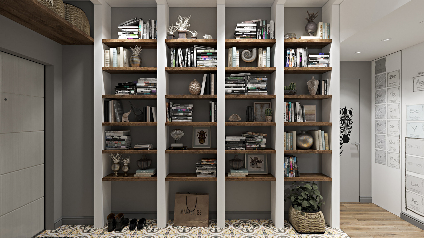Можно брать на заметку, как недорого и эффектно сделать книжный стеллаж! Этот стеллаж был выполнен в строительном исполнении: в белом цвете сделаны фальшбалки, которые спускаются с потолка на стену, а между ними закреплены деревянные полки