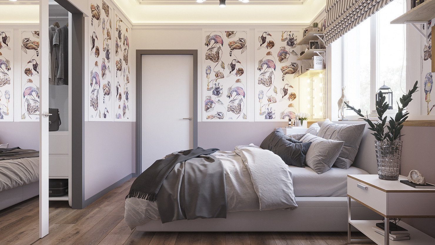 Преимуществом этой спальной комнаты является отдельная гардеробная комната, которую удалось организовать в небольшой по площади квартире
