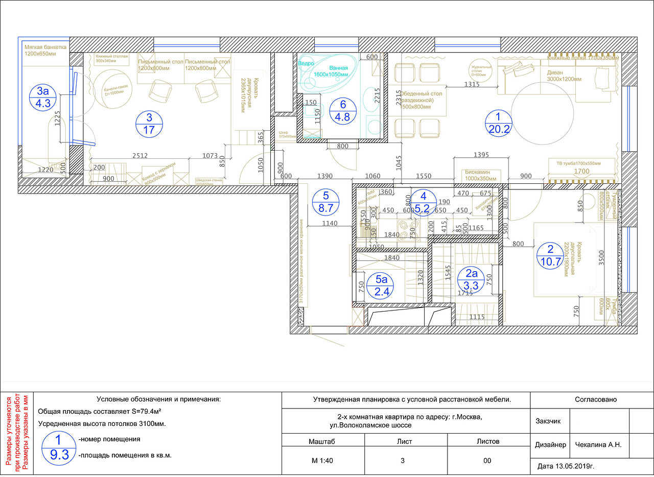Основной задачей планировки было сделать из двухкомнатной квартиры — трехкомнатную. Чтобы выполнить планировку в рамках закона мы расположили кухонный гарнитур в коридоре. Такое расположение законно и его возможно согласовать