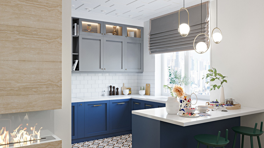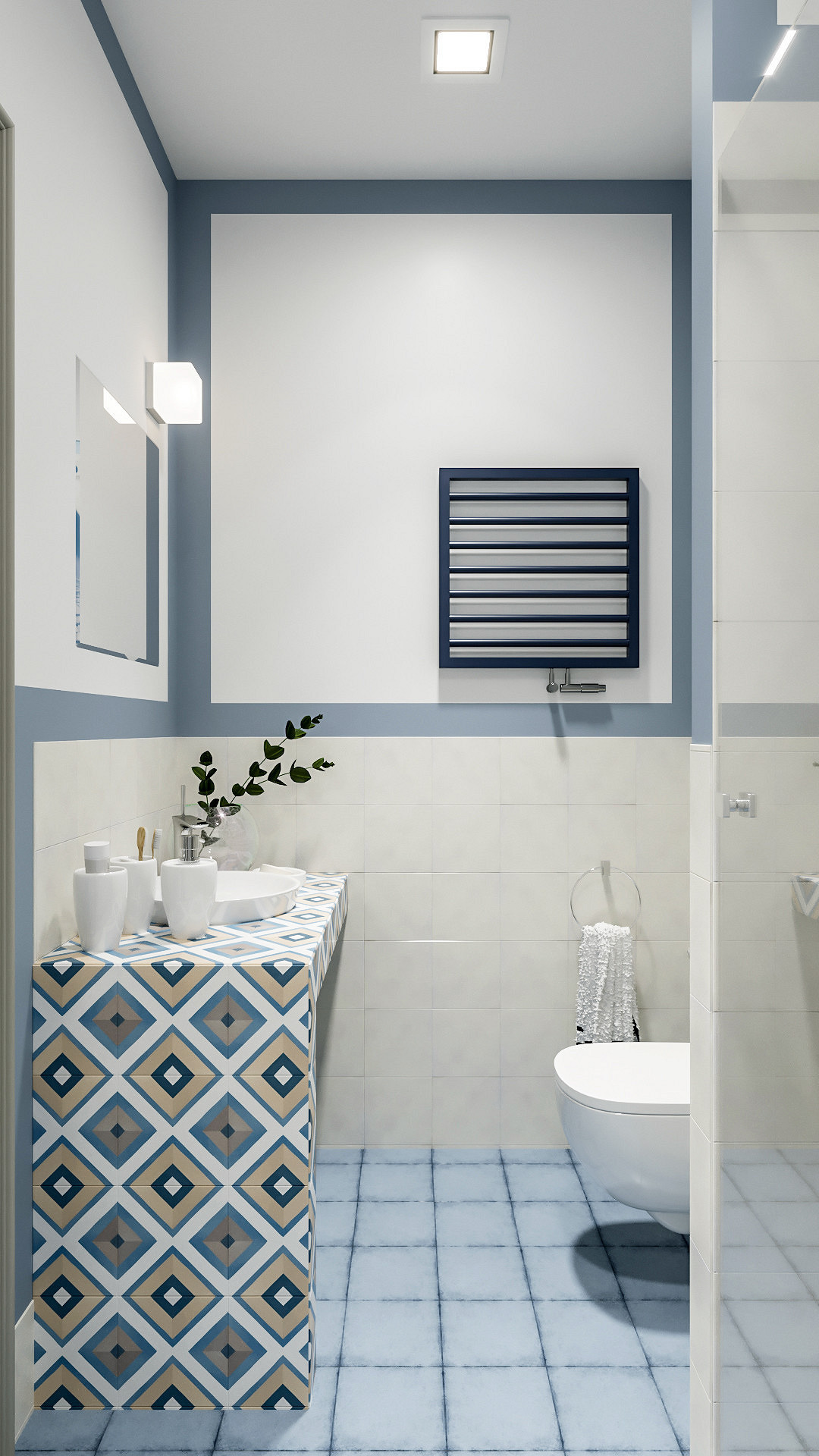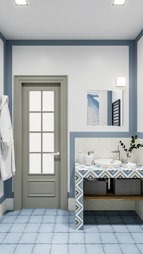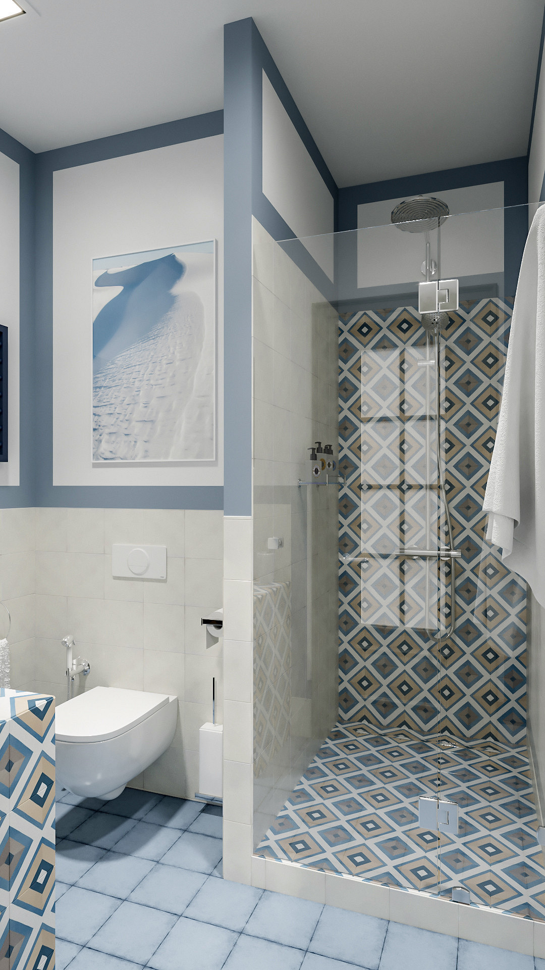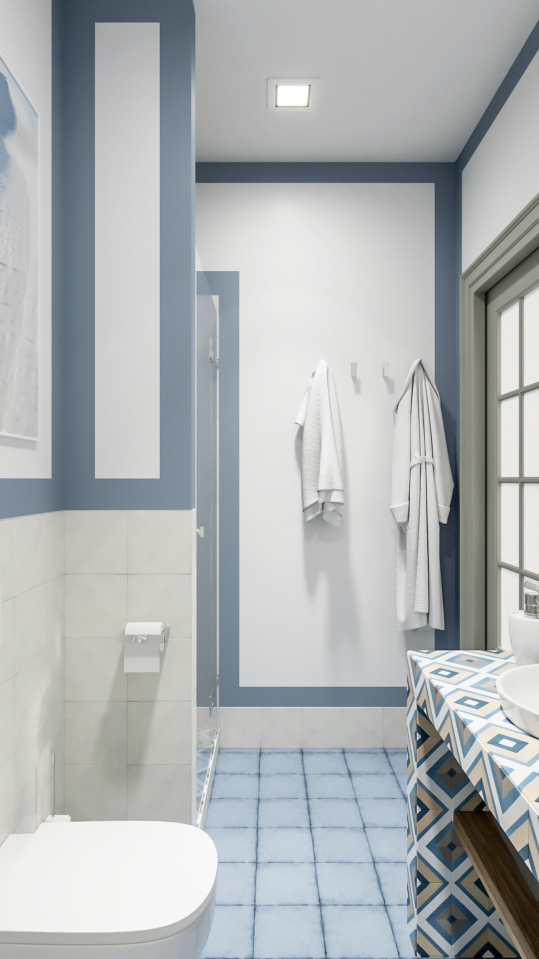 Три основных цвета: белый, синий и бежевый — создают спокойную палитру для приятного времяпрепровождения