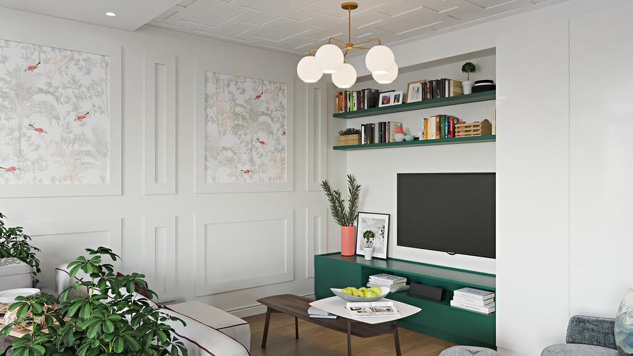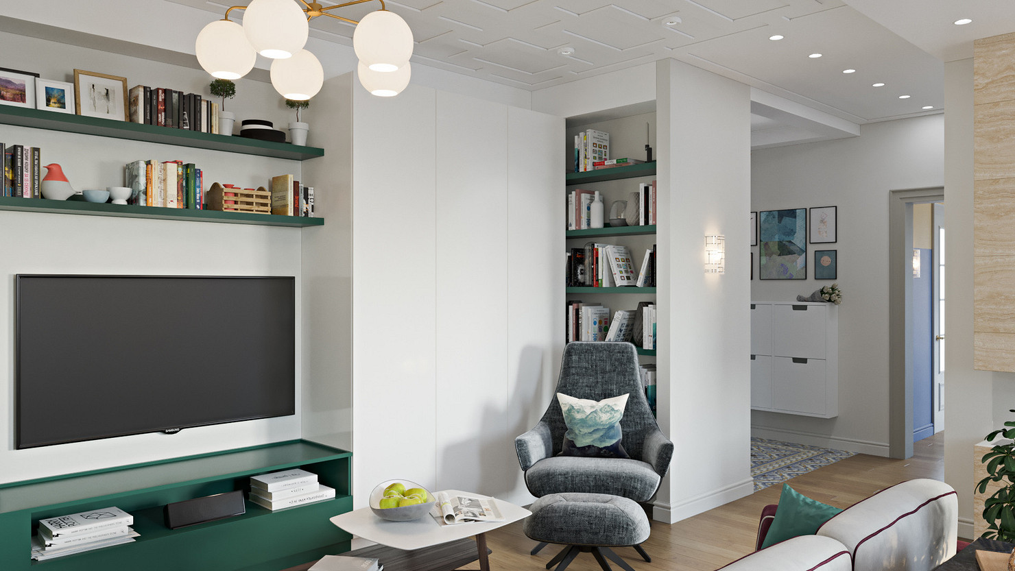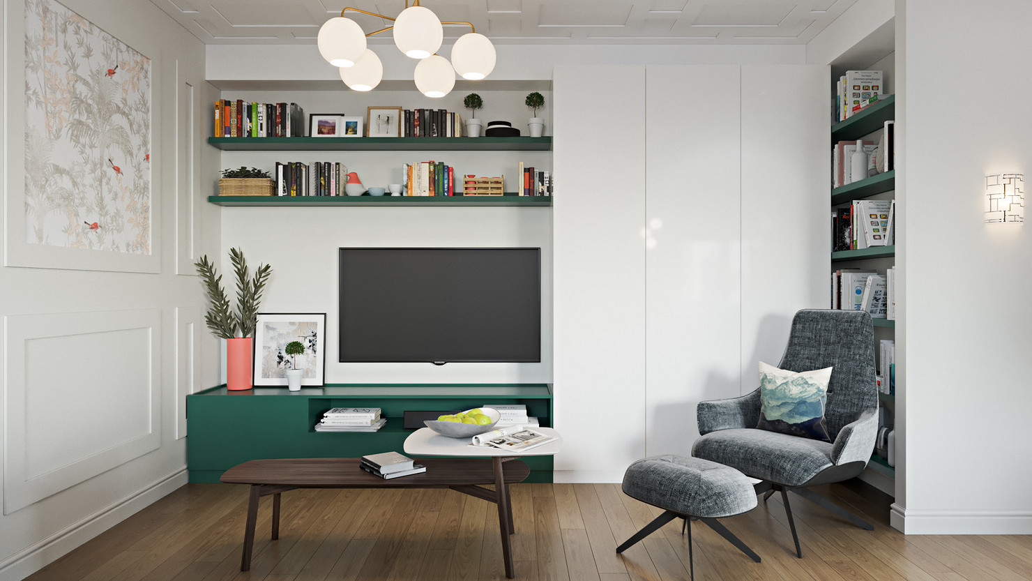 В ТВ композиции, на фоновом белом цвете, мы добавили яркий зеленый акцент. Реализовали открытое и закрытое хранение. Такое сочетание цвета и форм дало баланс и легкость восприятия