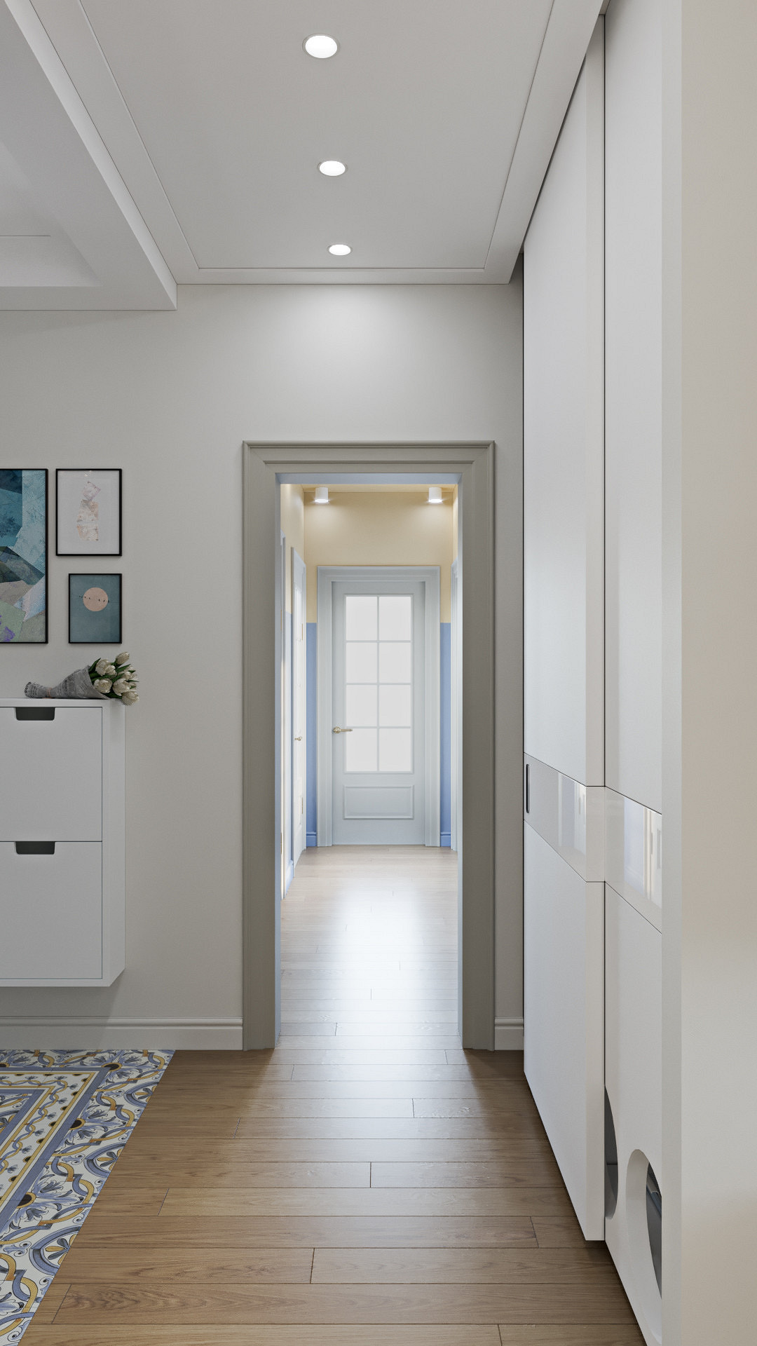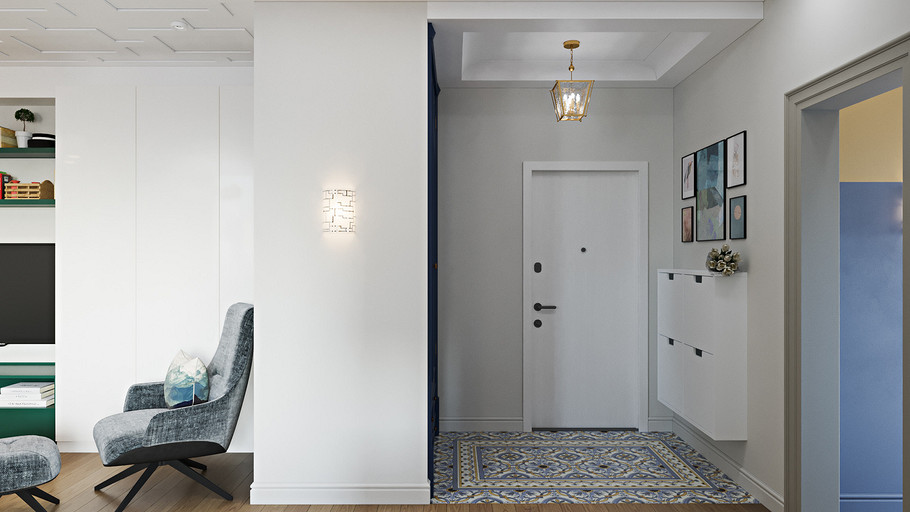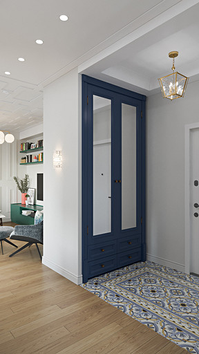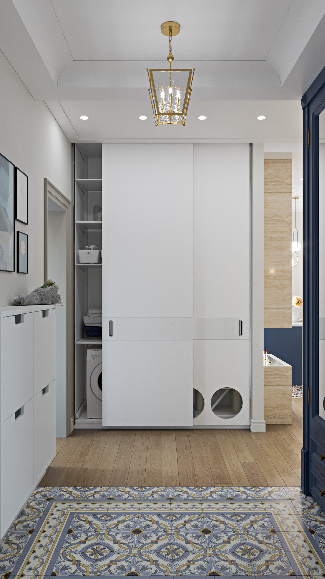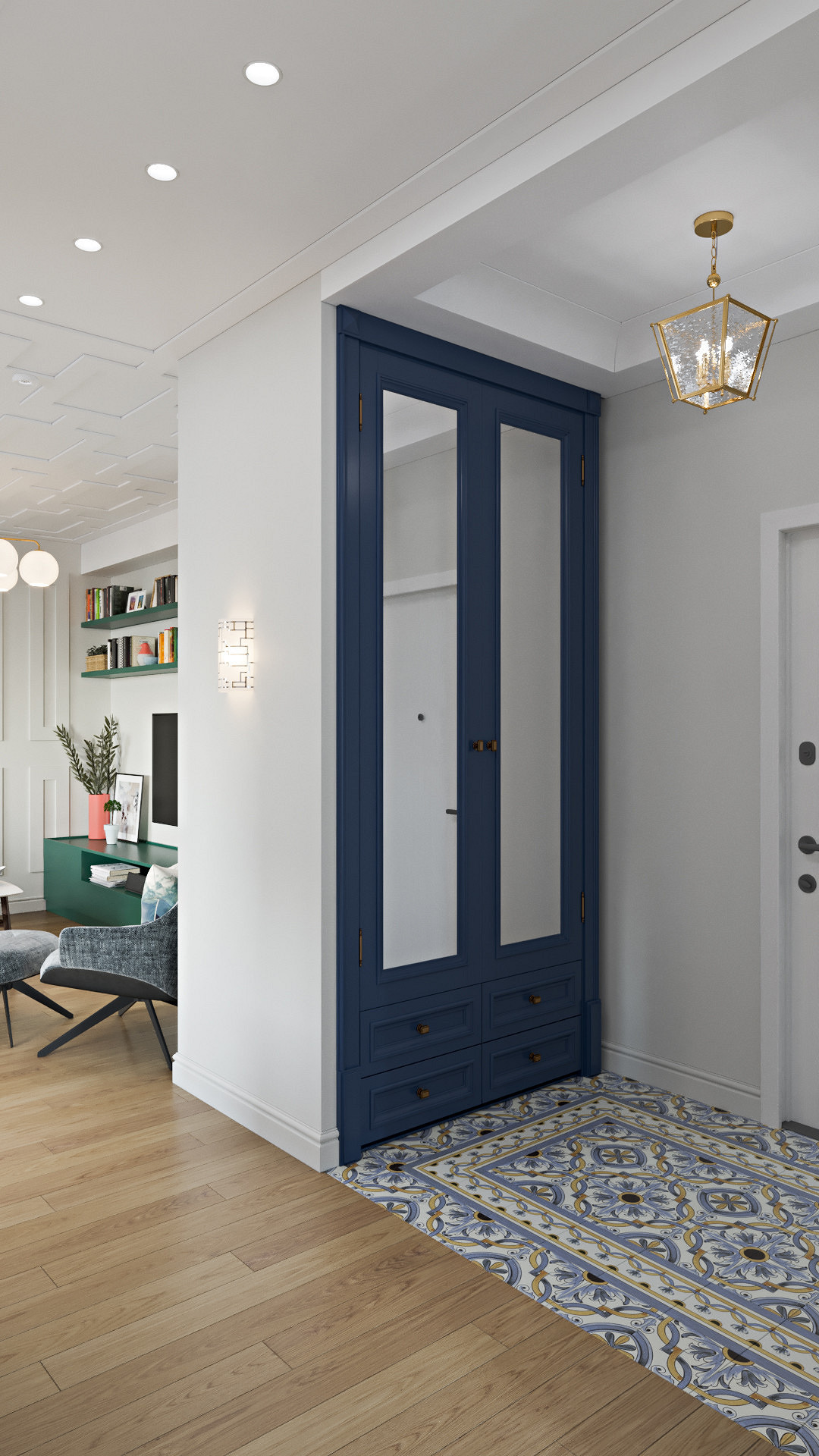 Я всегда уделяю особое внимание входной зоне. В нашем случае получилось изящное пространство с красивым орнаментом плитки на полу, классическим ярким платяным шкафом и золотым светильником с винтажным стеклом