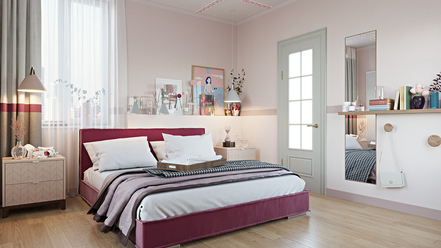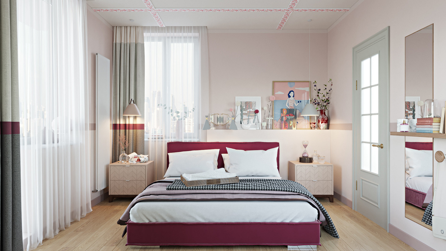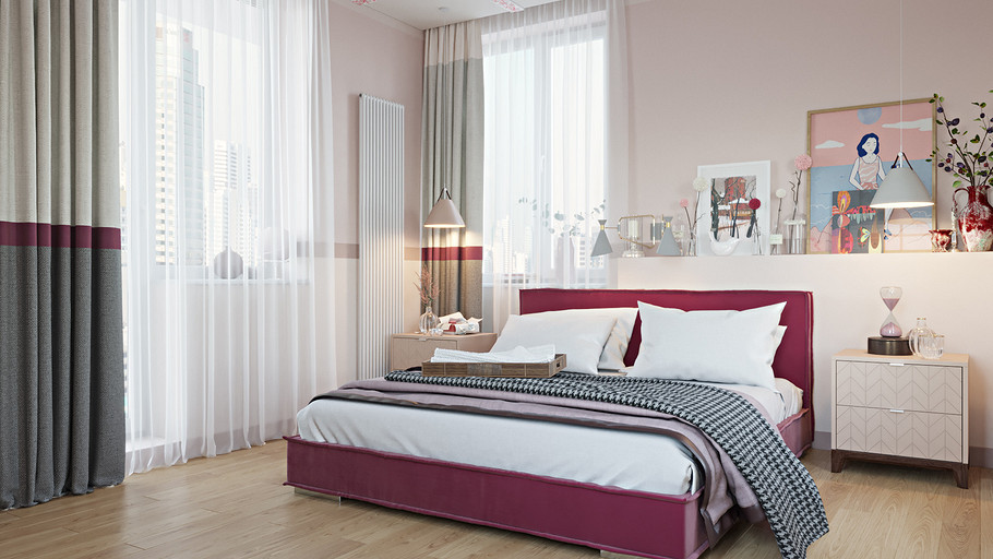 В этой комнате спокойная, сливочная палитра и нам захотелось привнести немного цвета, так сказать добавить «вишенку на торт». Таким ярким элементом нам послужила обивочная ткань на двухспальной кровати