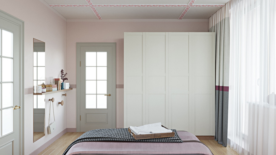 Спальня расположена в угловой комнате, в которой архитектурой дома было предусмотрено на одной стене окно, а на другой окно и выход на балкон