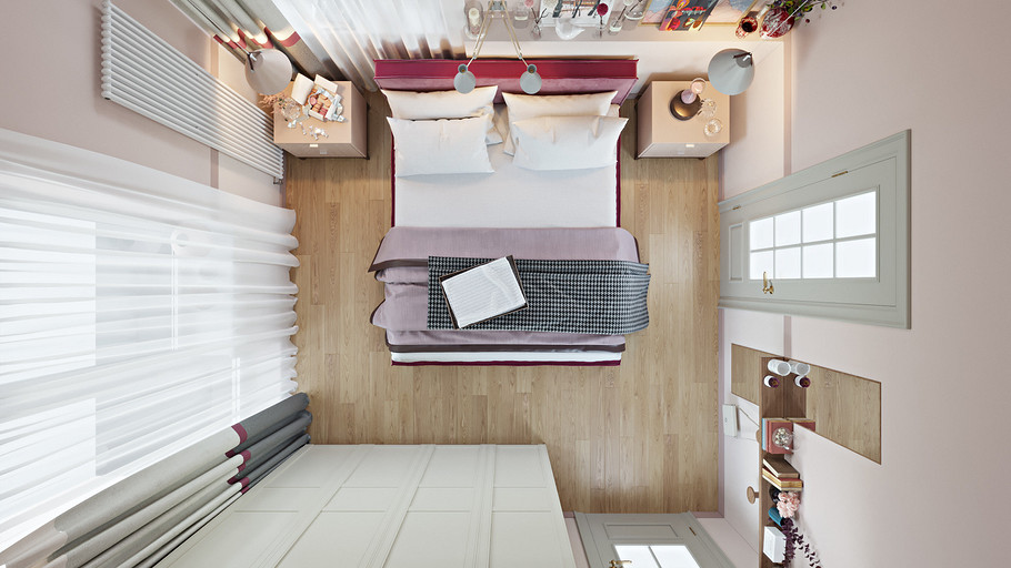 Это комната почти квадратной формы и поэтому в нее легко вписать нужный набор предметов мебели для спальной комнаты