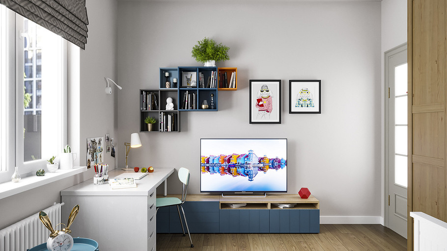 В ТВ композиции, за белыми фасадами, скрыто рабочее место — это сделано для того, чтобы не было нагромождения предметов мебели