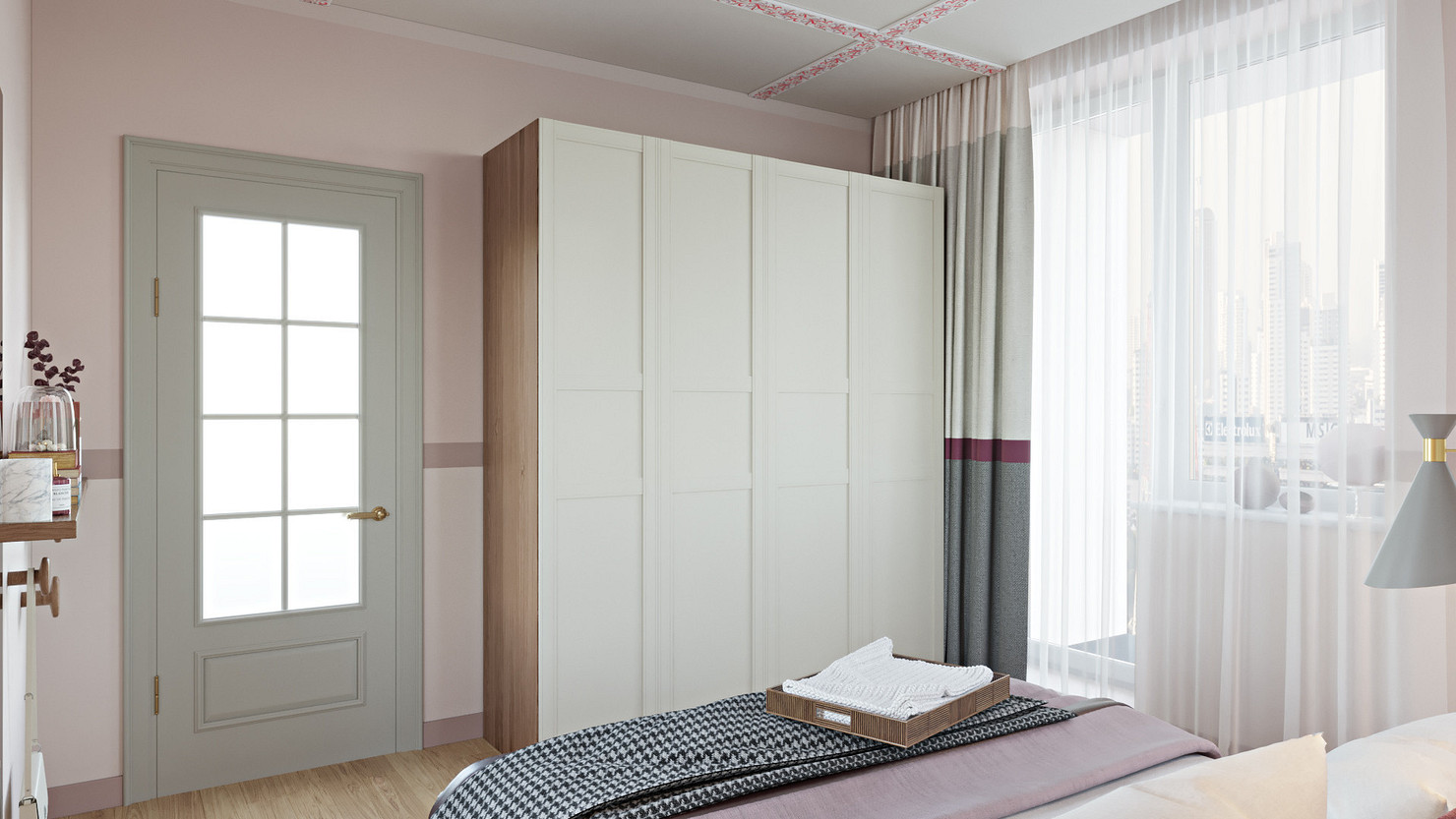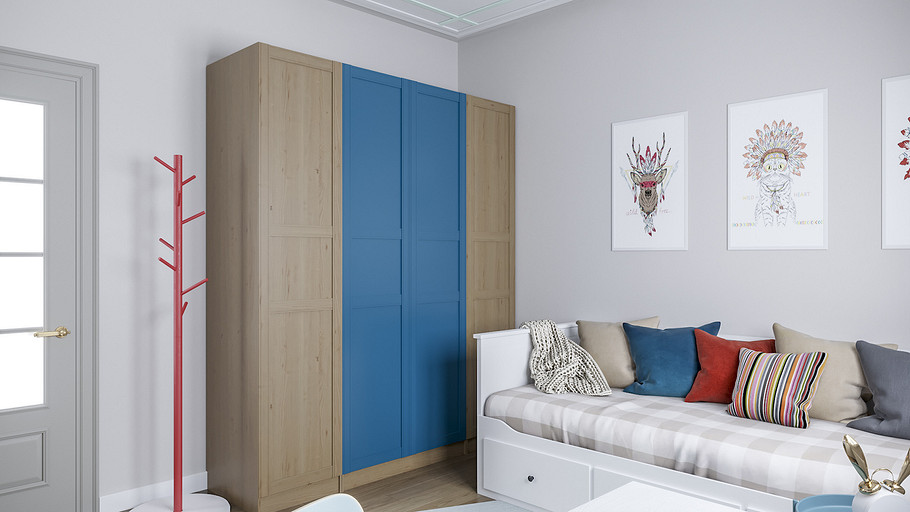 В этом помещение достаточно простой платяной шкаф с добавлением смелого цвета на фасадах
