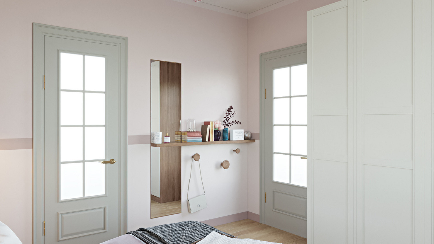 При входе в комнату мы организовали зеркало и деревянную полочку со всякой полезной мелочовкой, а пару изящных крючков — добавили функционал к этой композиции